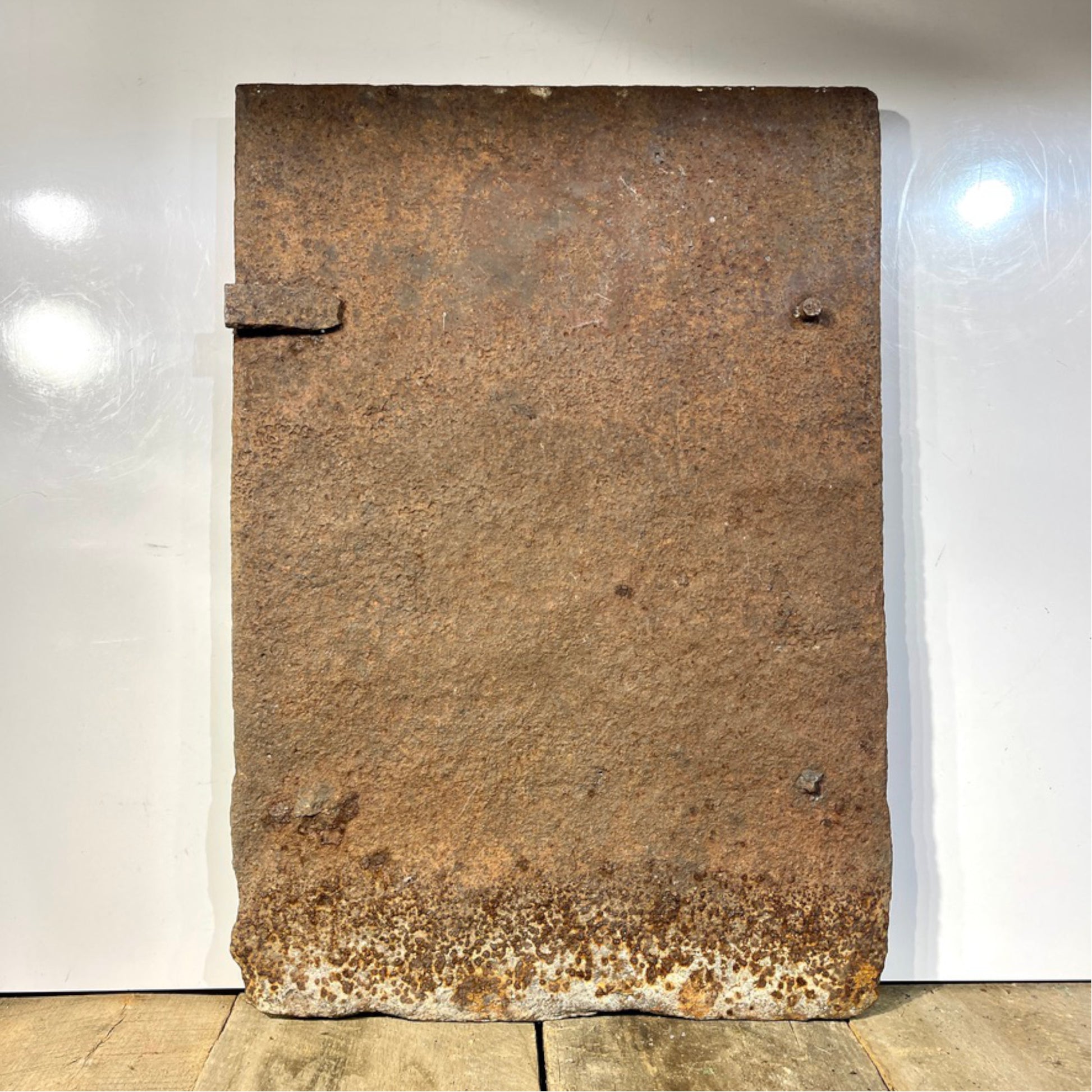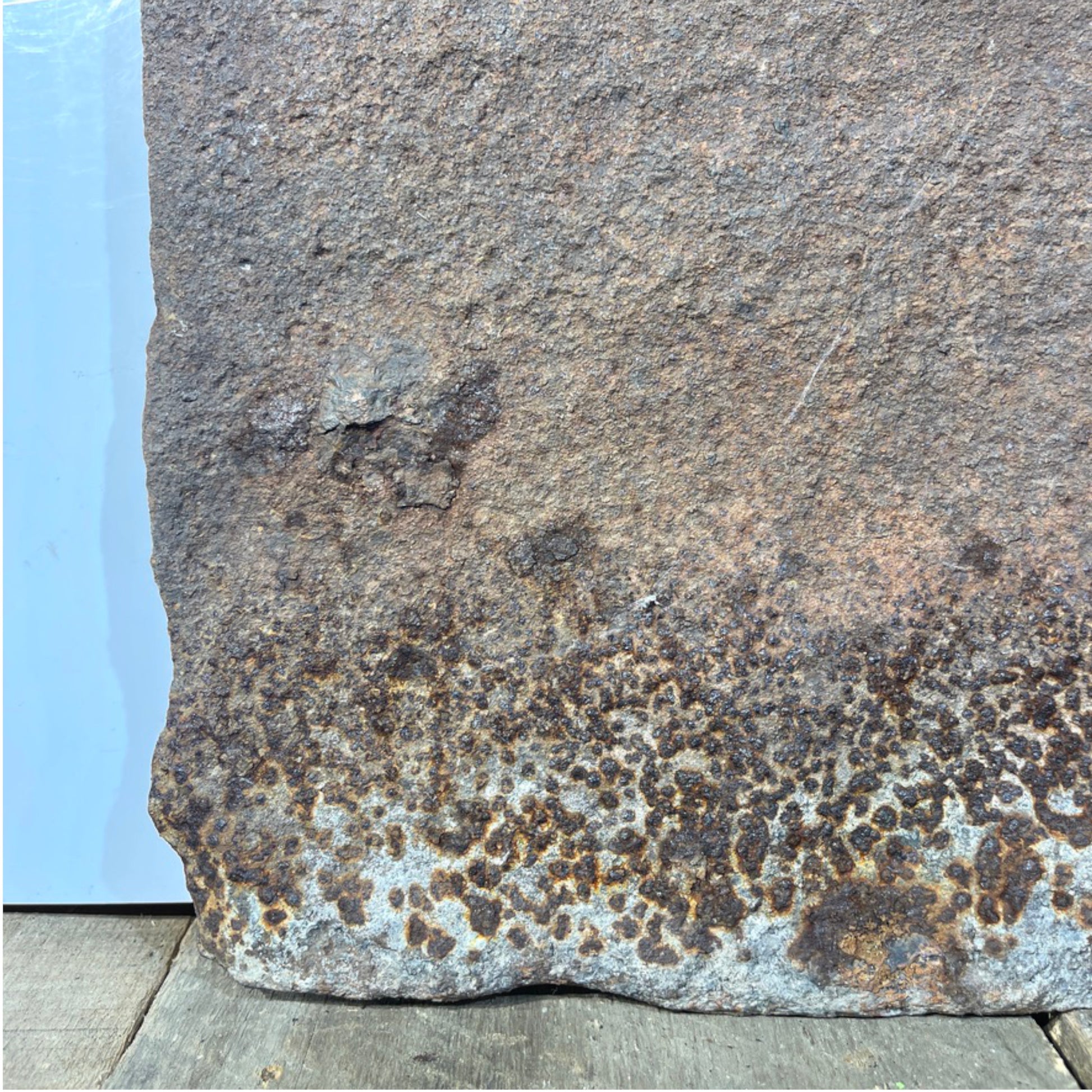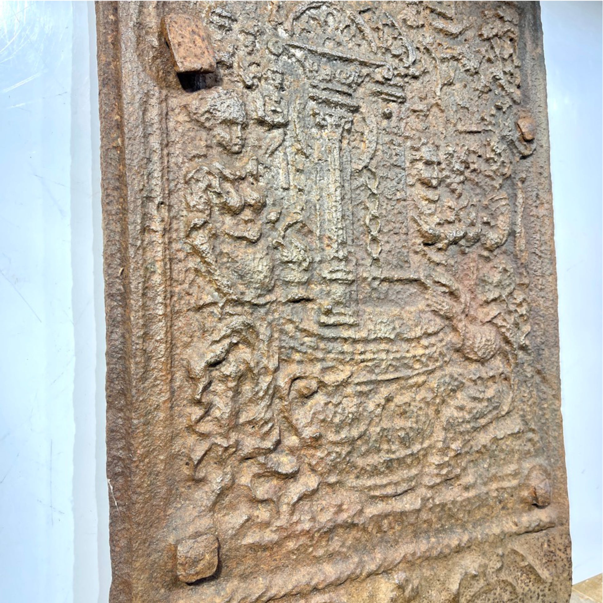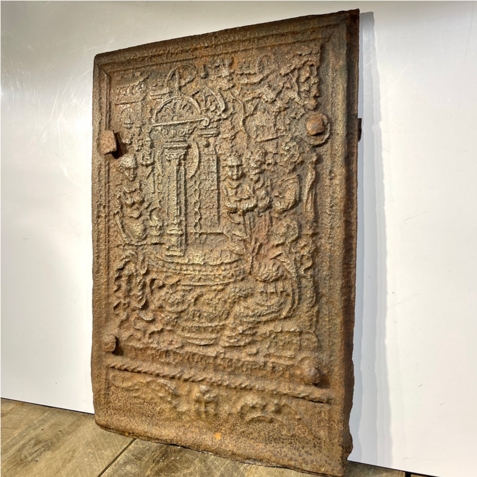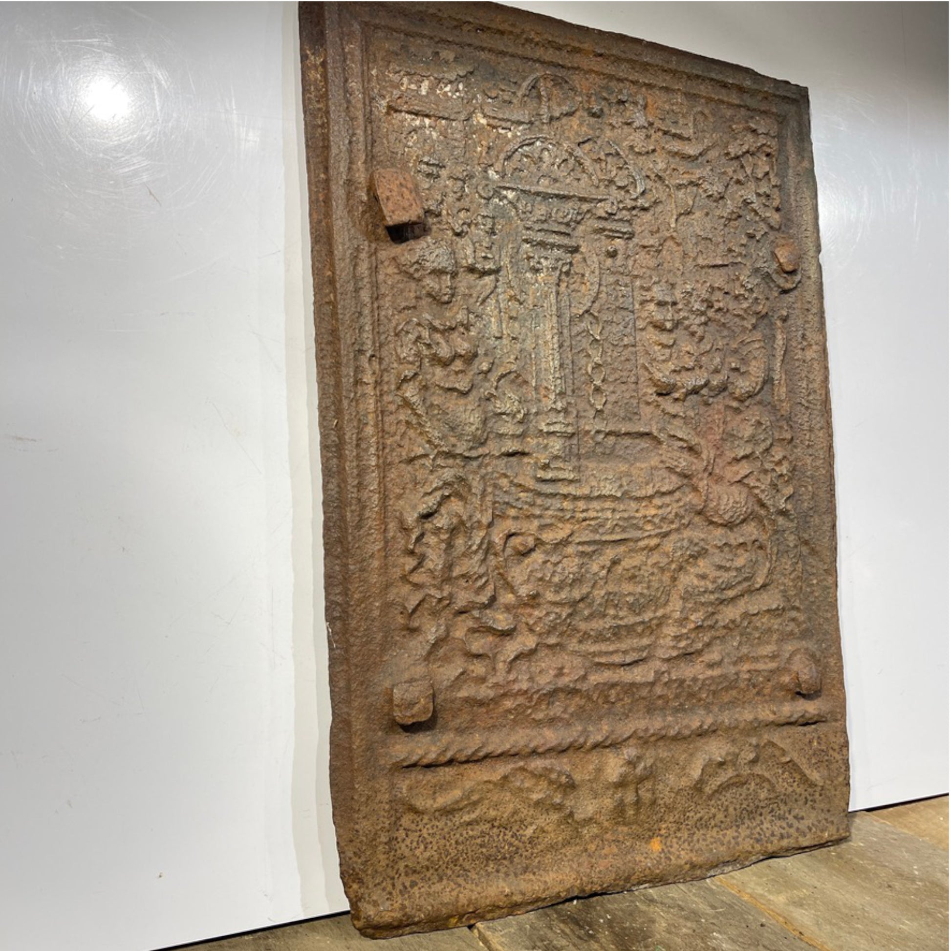 16th Century cast iron fireback with allegorical theme. Wonderful condition for its age. Ideal in a fireplace (indoor or outdoor)but also popular as an accent on a tiled wall in a kitchen or part of an outdoor space. Unit weighs 42 pounds, a consideration when mounting as a backsplash.
