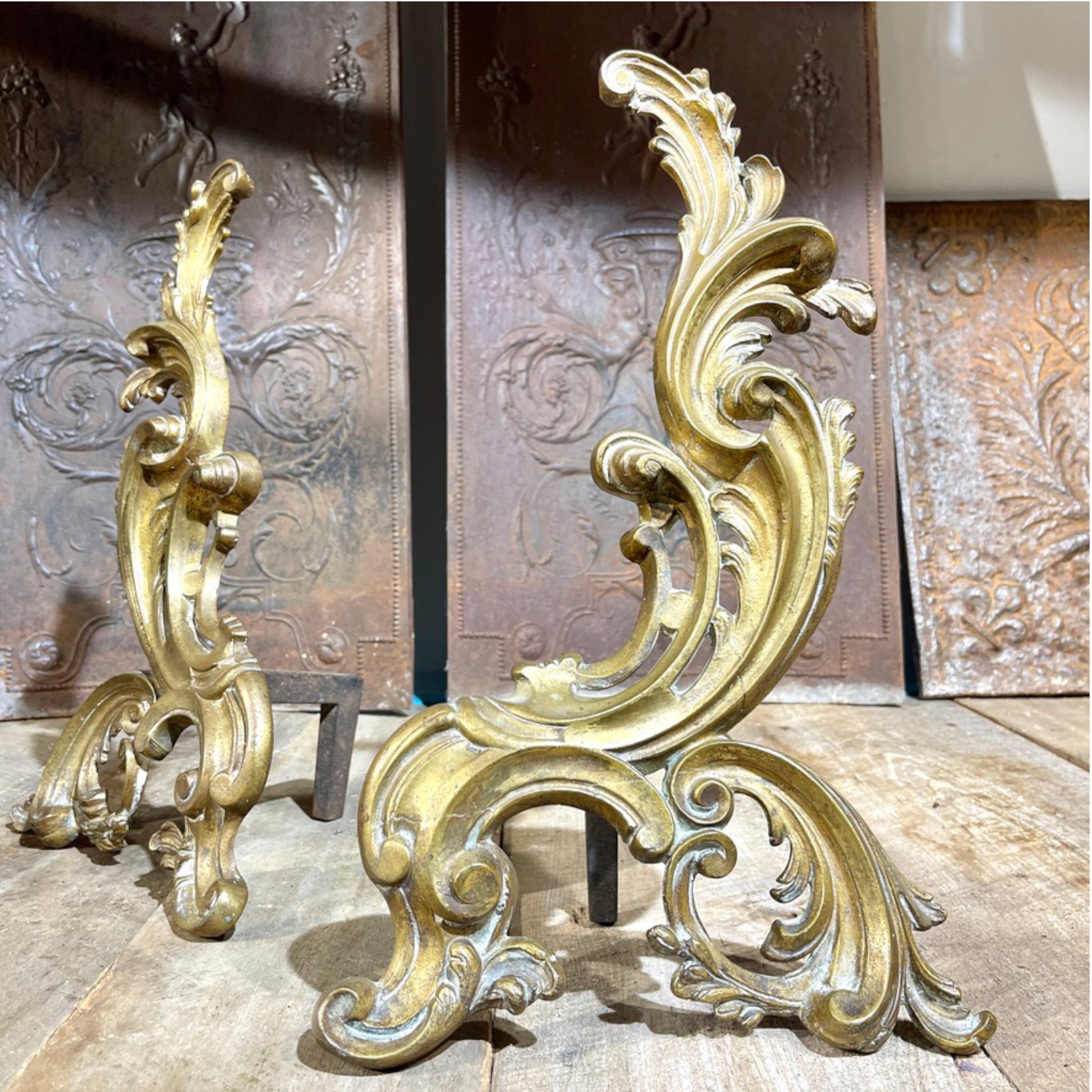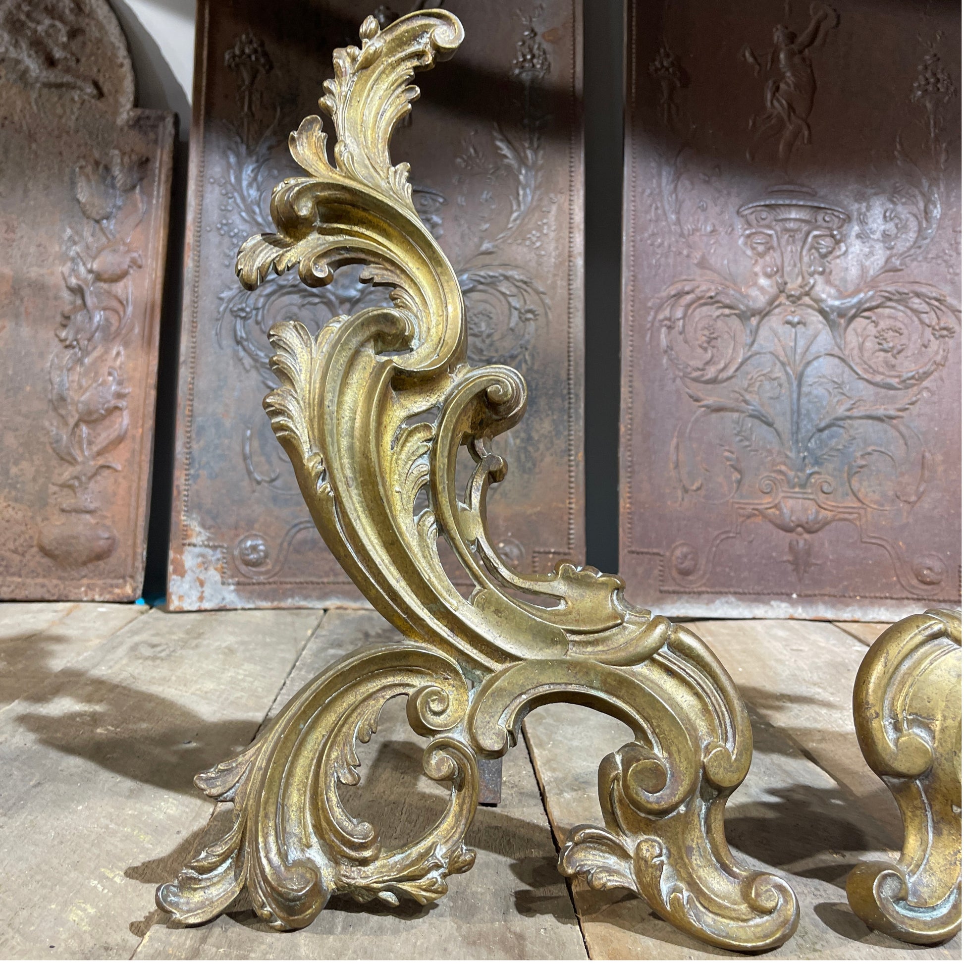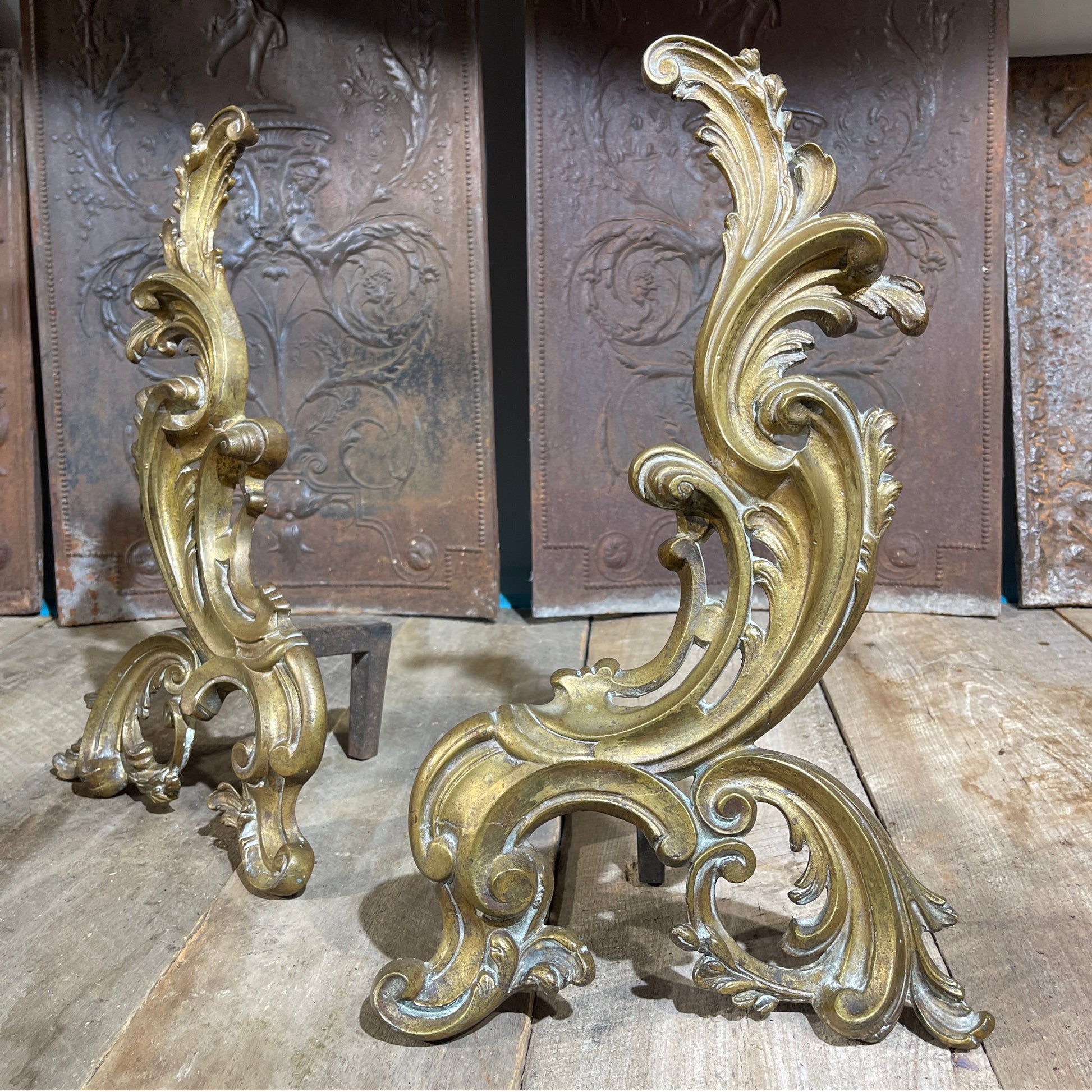 Late 19th Century French Rococo andirons in brass. With their low profile, they would be a great addition in front of a gas fireplace.