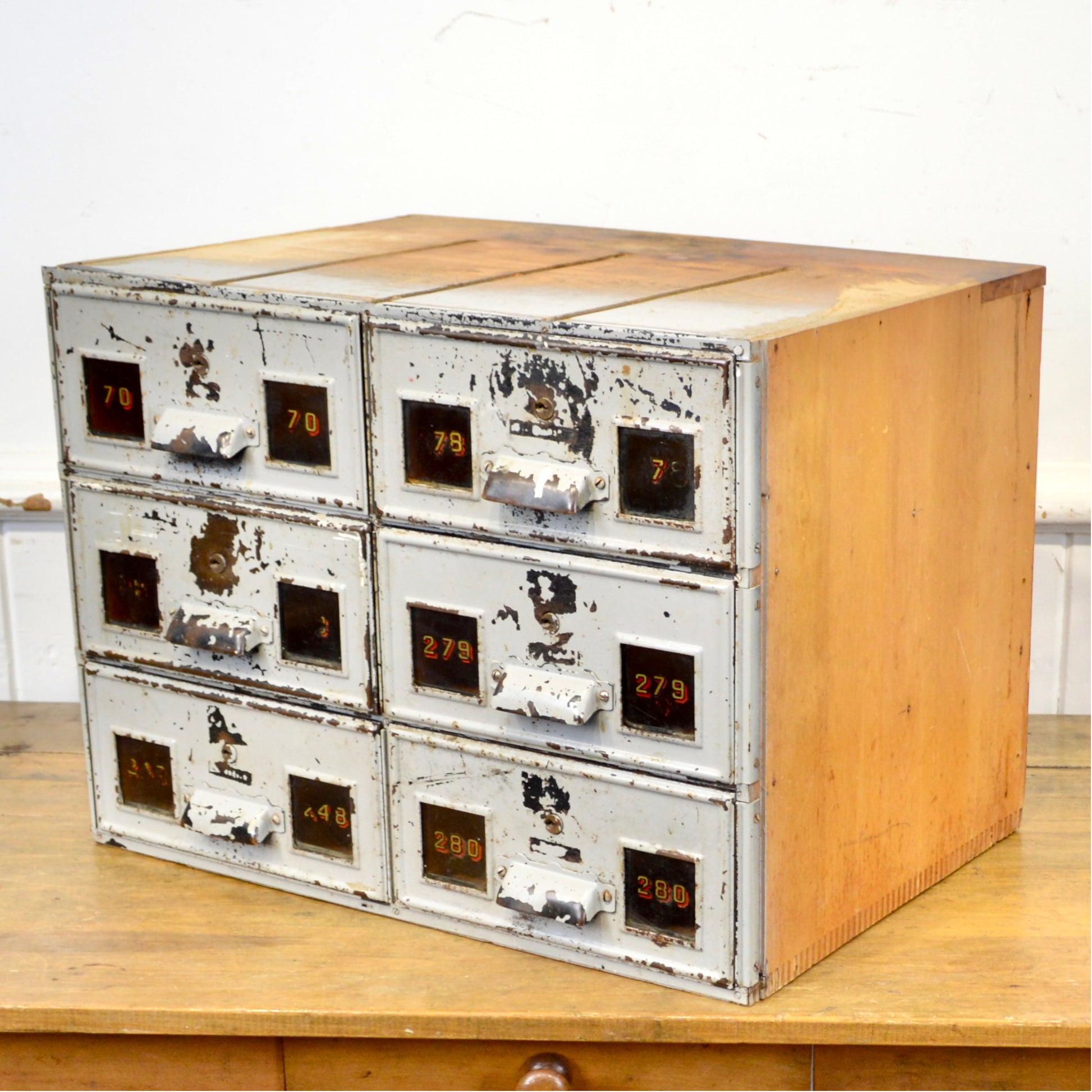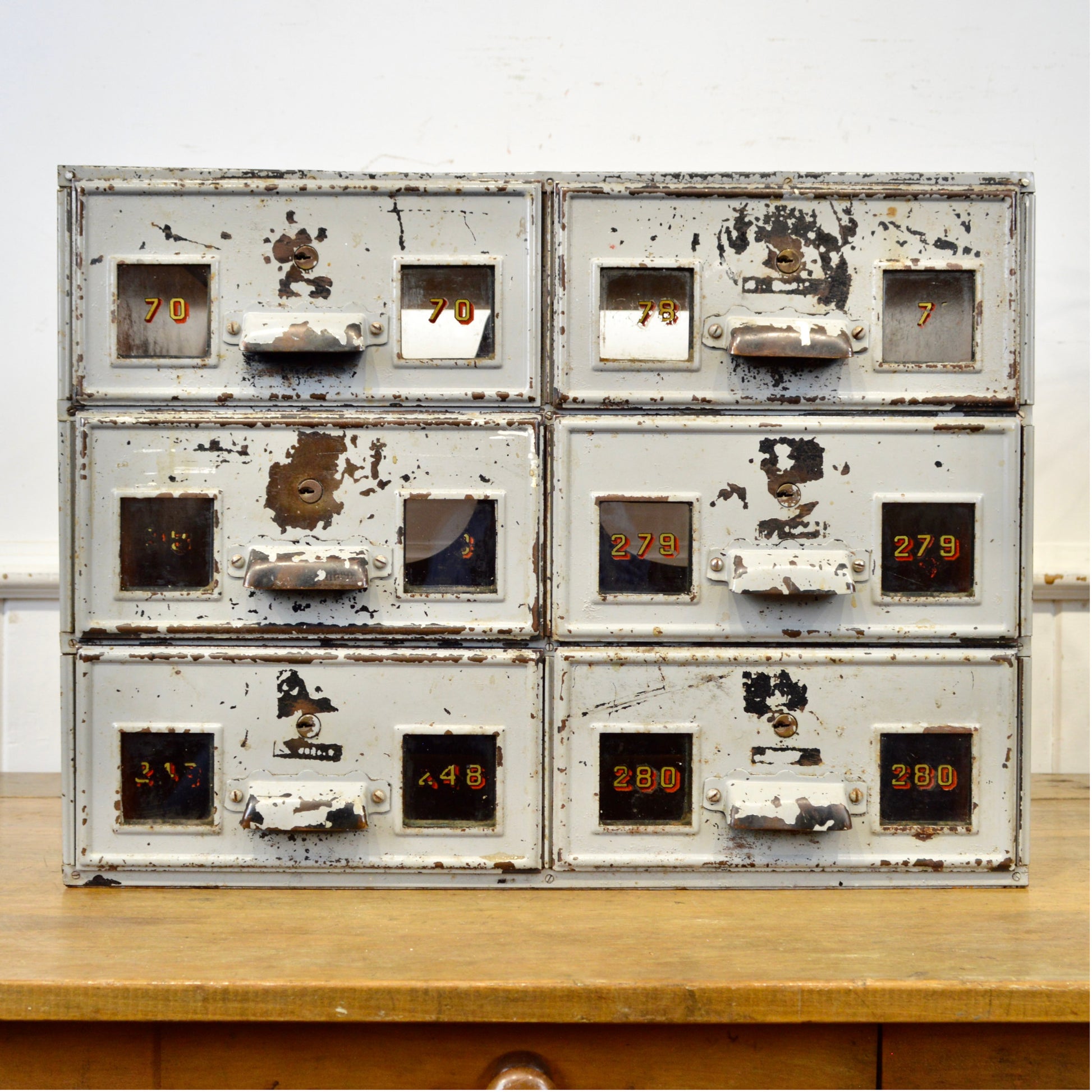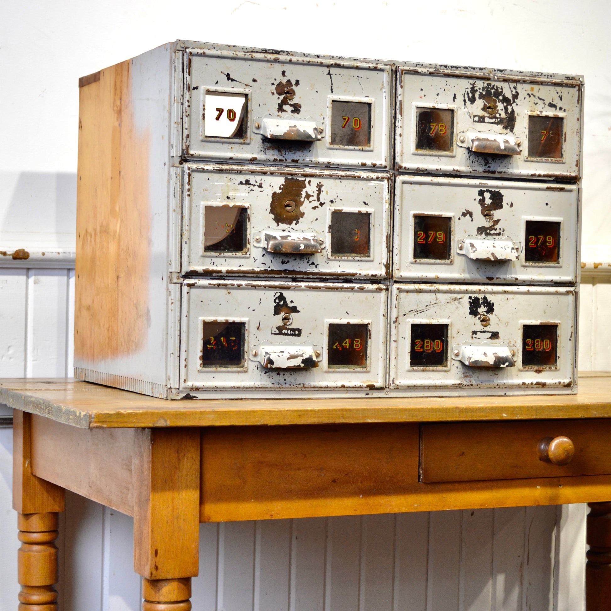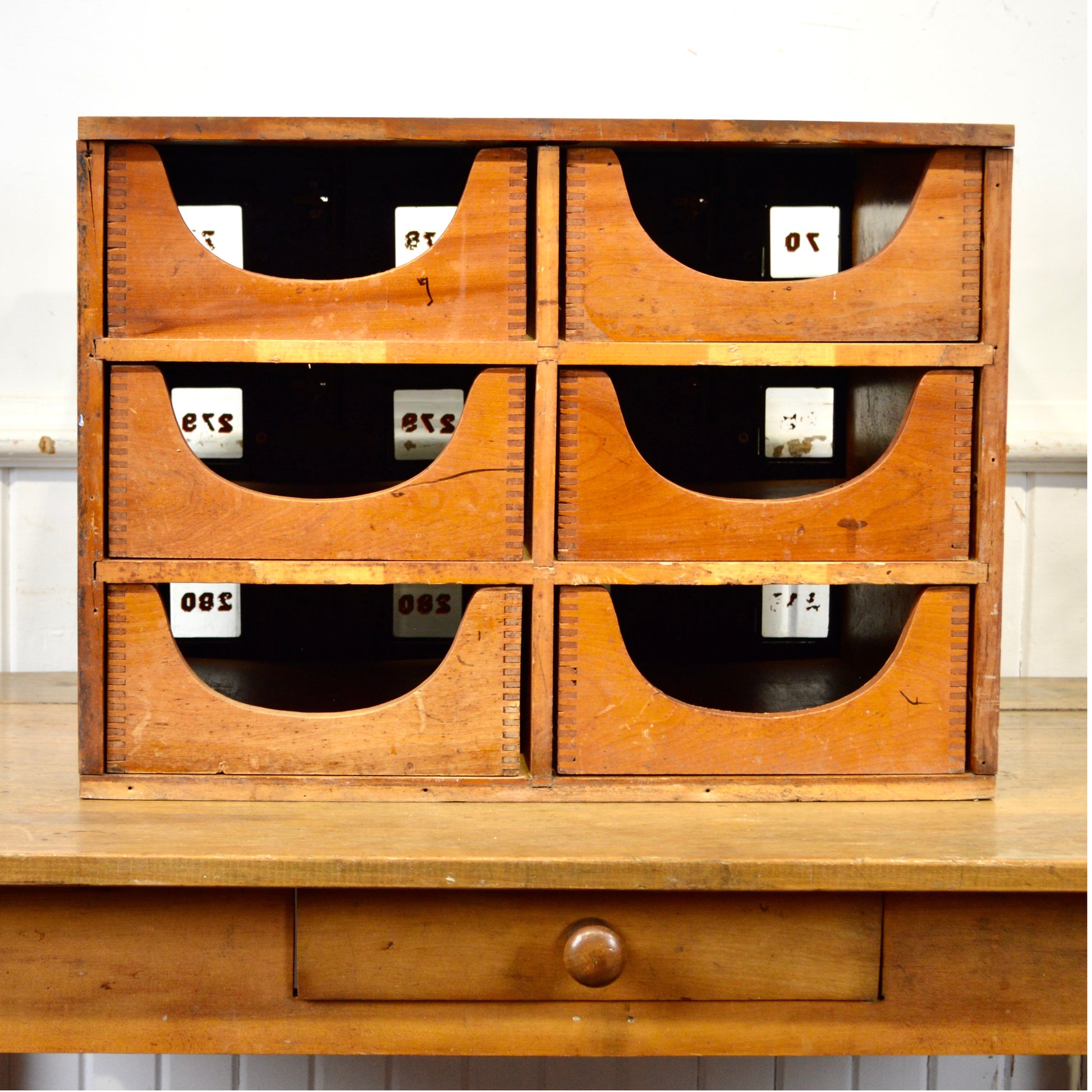 Beautiful storage solutions with history, can make getting and staying organized so much more enjoyable. This six drawer interoffice mail cabinet section was manufactured by Office Specialties in Newmarket, Ontario. The company started out in 1888 and continued in business until 2023 and in it's heyday employed over 400 people. Wood construction with steel drawer fronts with glass viewing windows. Drawer fronts have original locks, but no keys. Original numbers show signs of wear in keeping with age and use.
