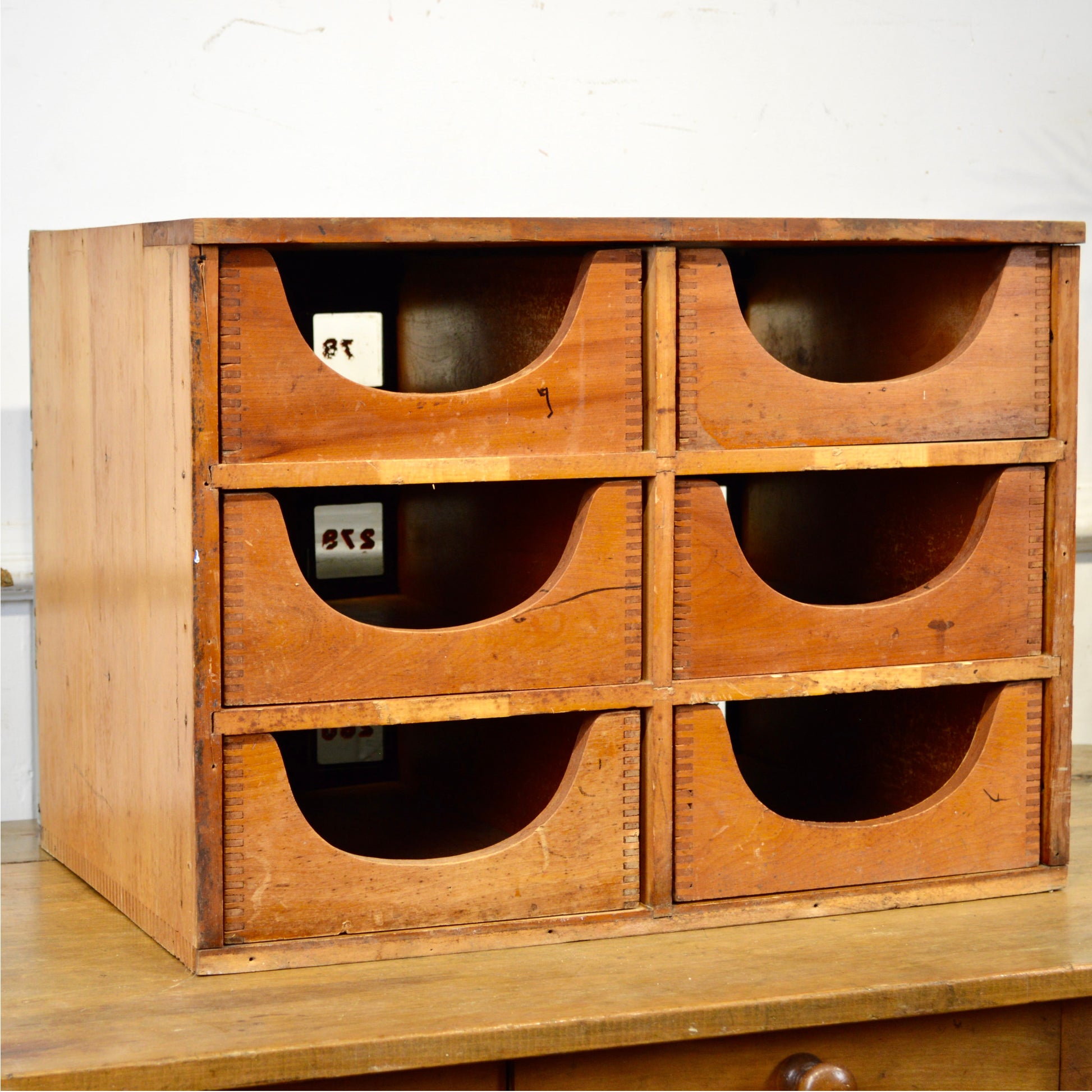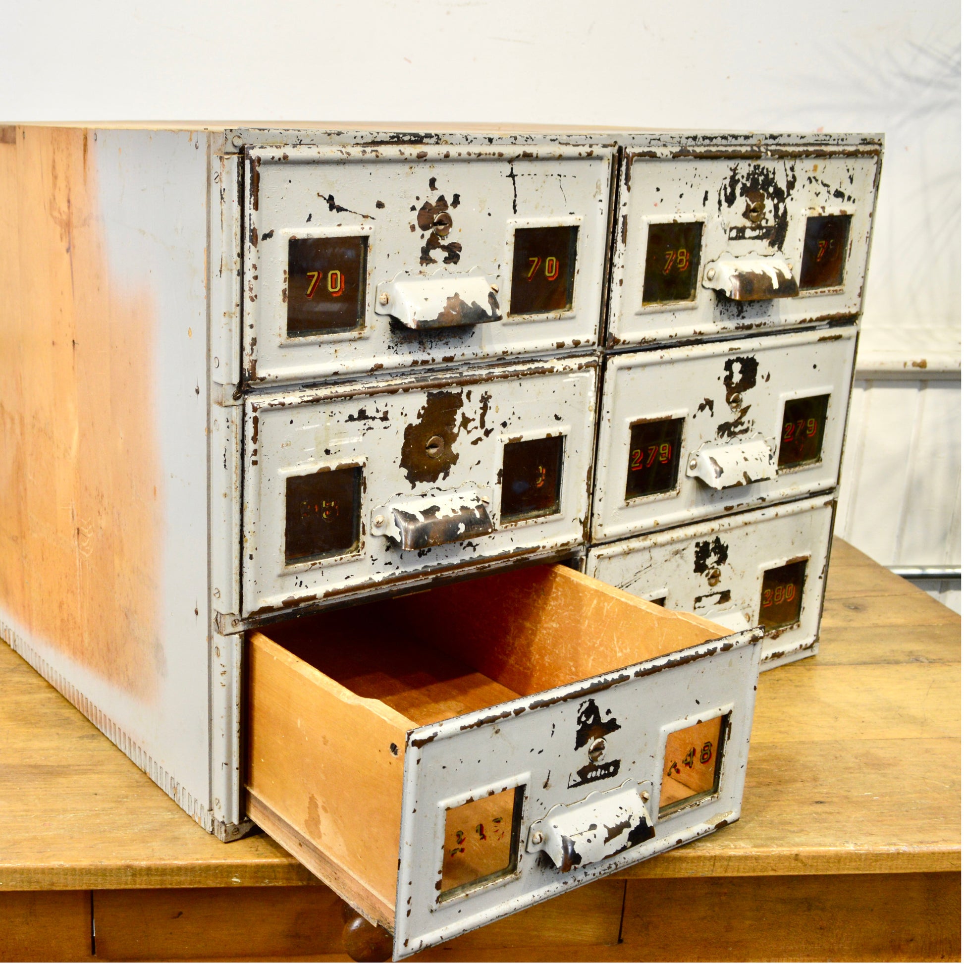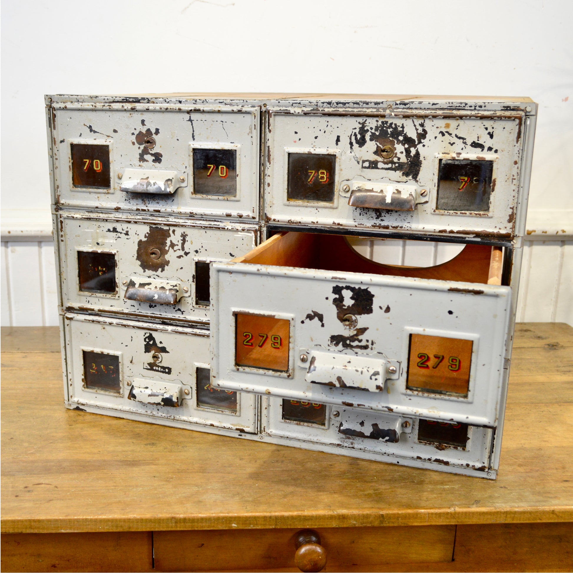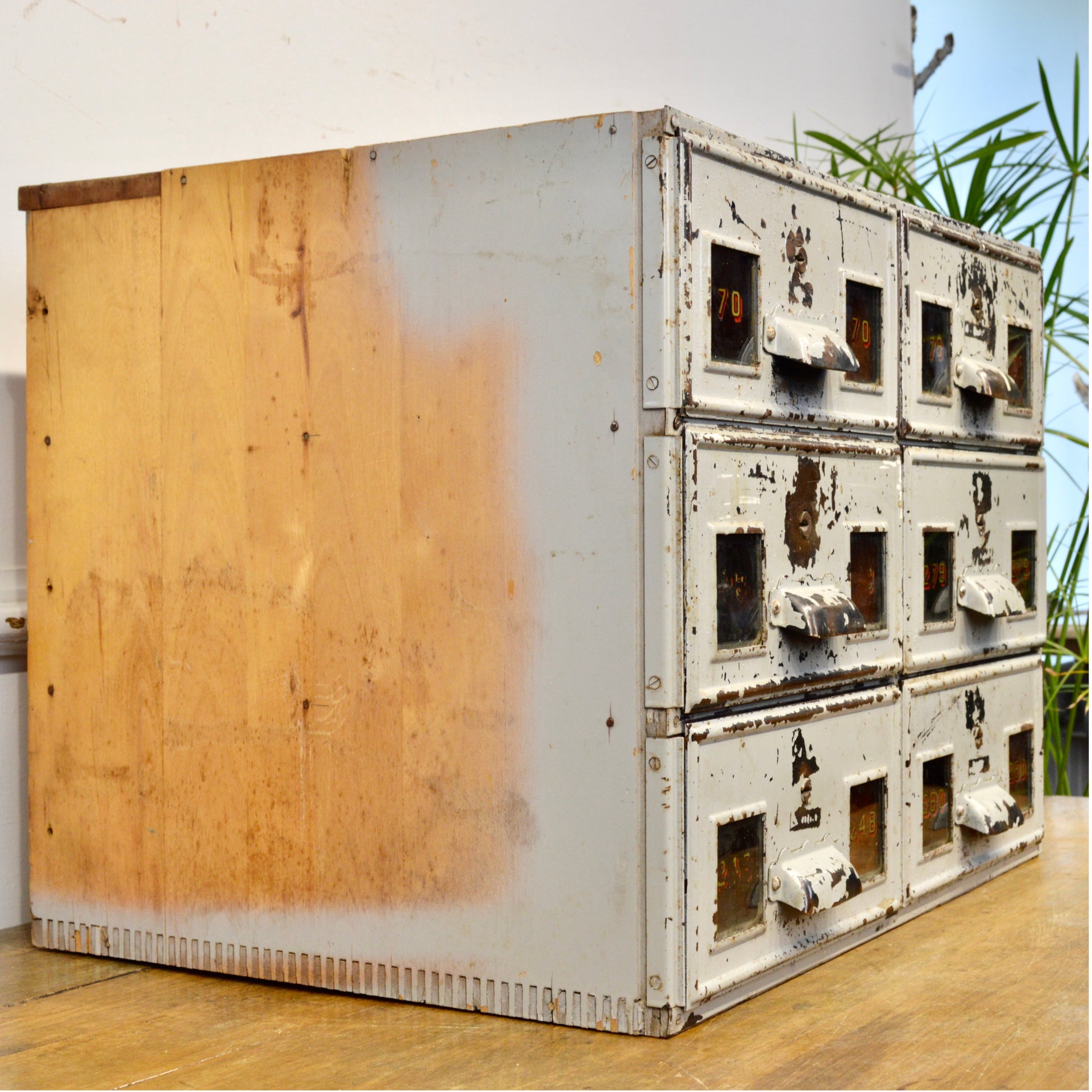 Beautiful storage solutions with history, can make getting and staying organized so much more enjoyable. This six drawer interoffice mail cabinet section was manufactured by Office Specialties in Newmarket, Ontario. The company started out in 1888 and continued in business until 2023 and in it's heyday employed over 400 people. Wood construction with steel drawer fronts with glass viewing windows. Drawer fronts have original locks, but no keys. Original numbers show signs of wear in keeping with age and use.