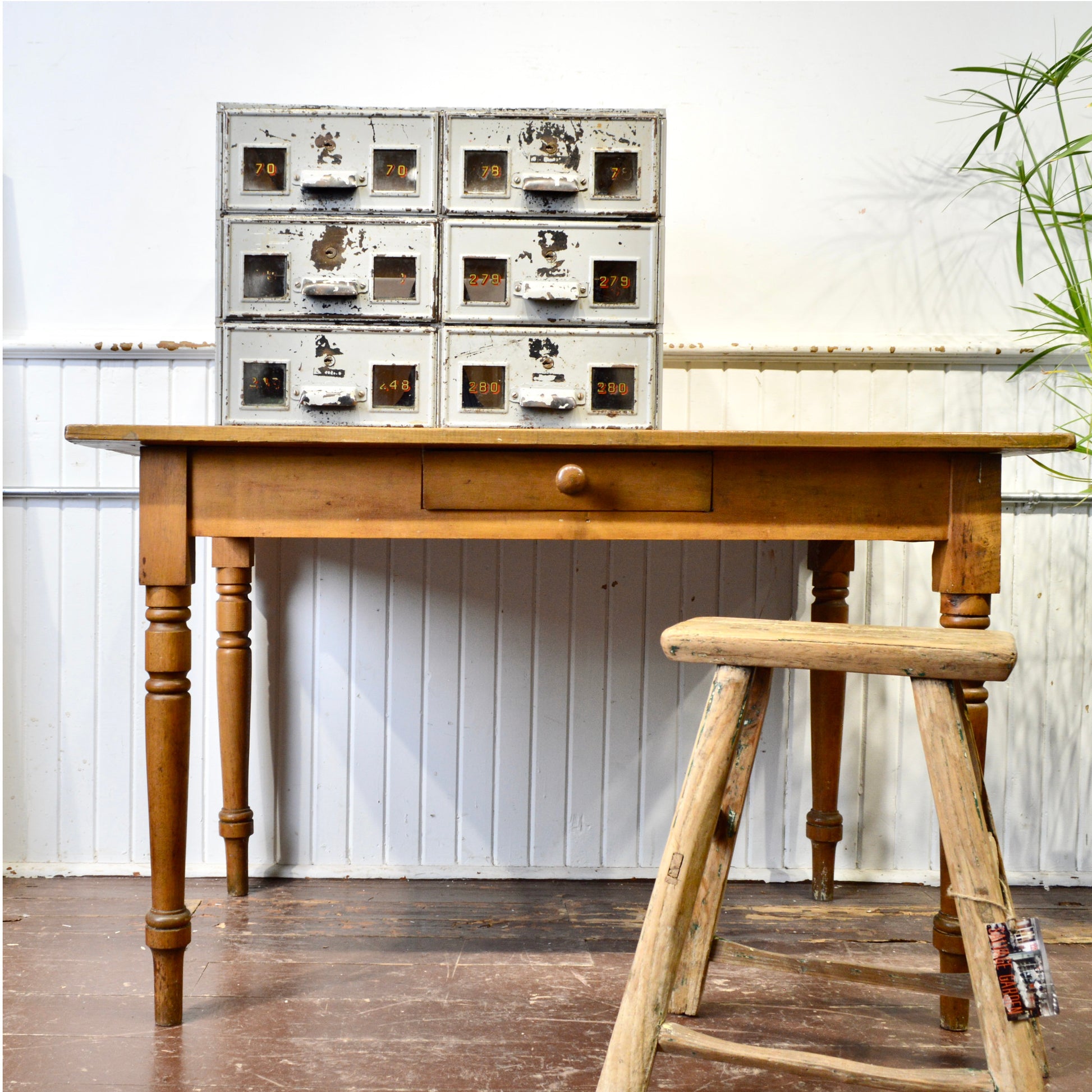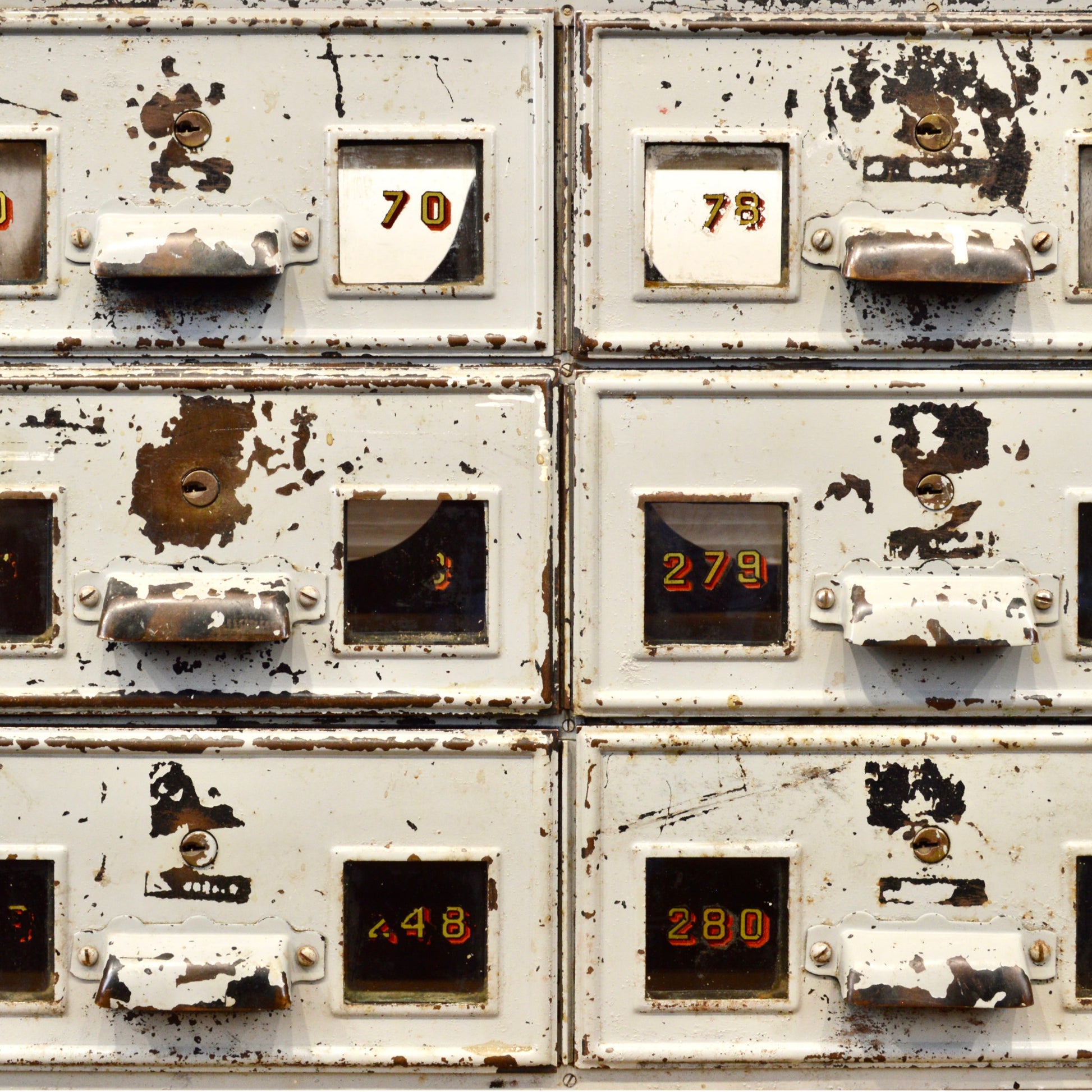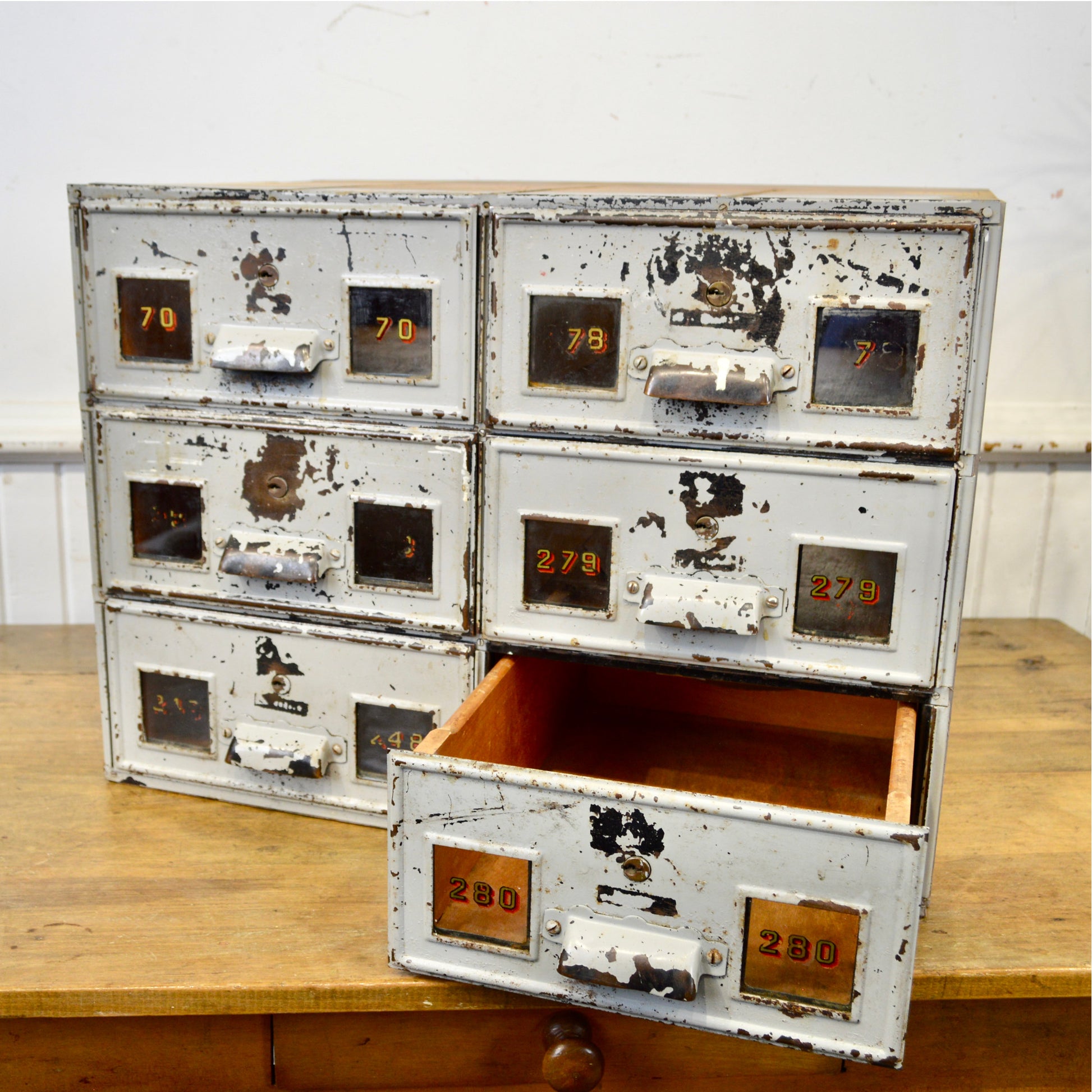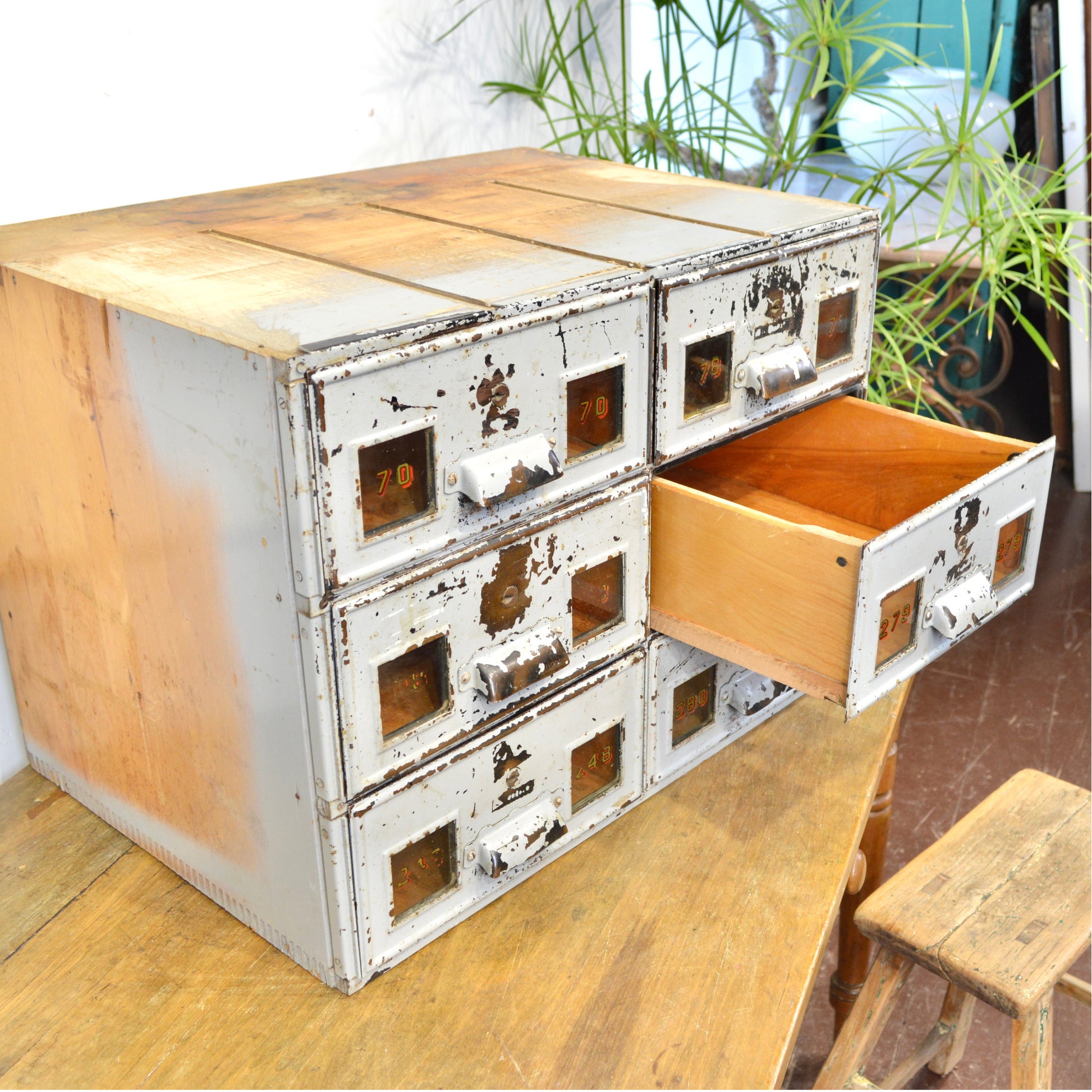 Beautiful storage solutions with history, can make getting and staying organized so much more enjoyable. This six drawer interoffice mail cabinet section was manufactured by Office Specialties in Newmarket, Ontario. The company started out in 1888 and continued in business until 2023 and in it's heyday employed over 400 people. Wood construction with steel drawer fronts with glass viewing windows. Drawer fronts have original locks, but no keys. Original numbers show signs of wear in keeping with age and use.