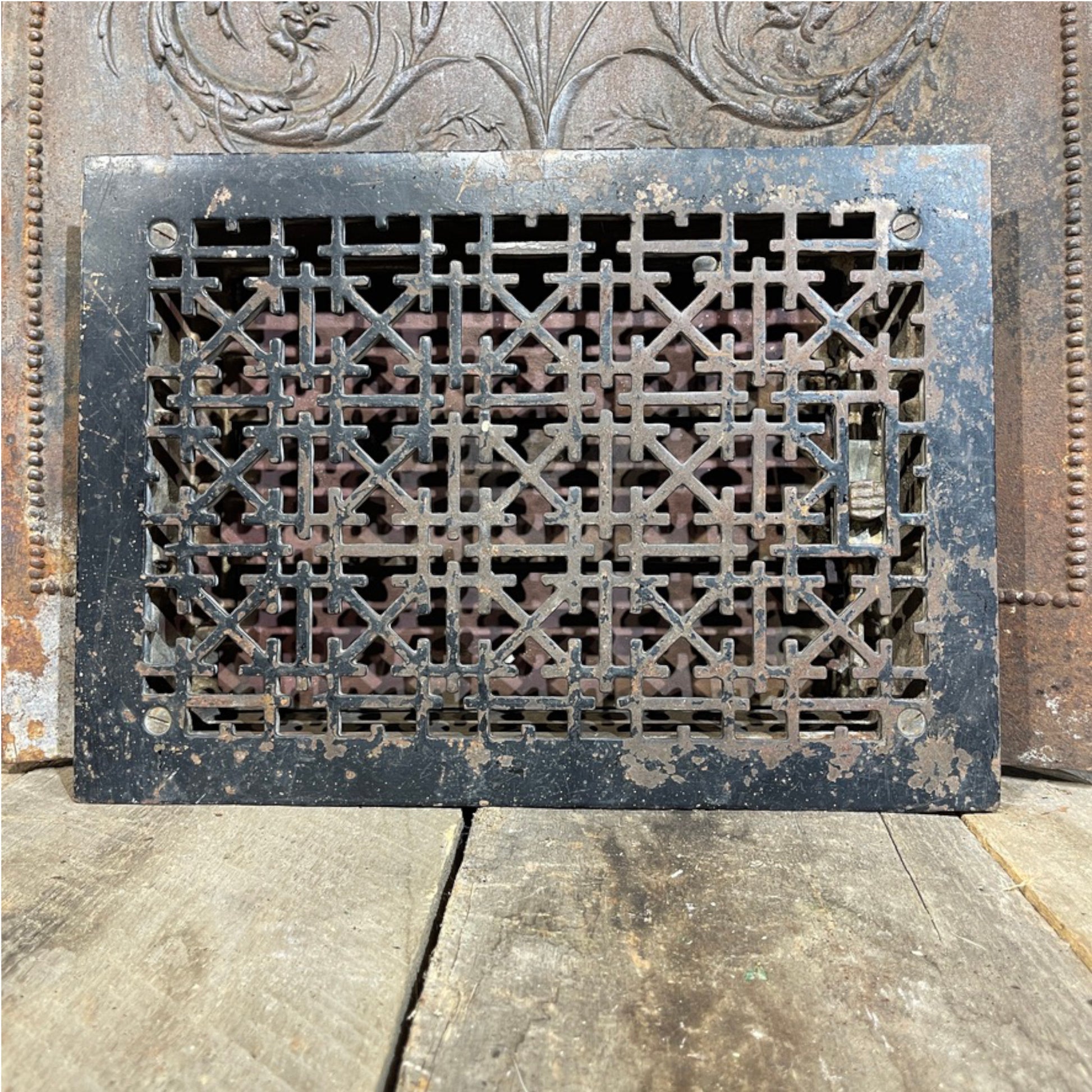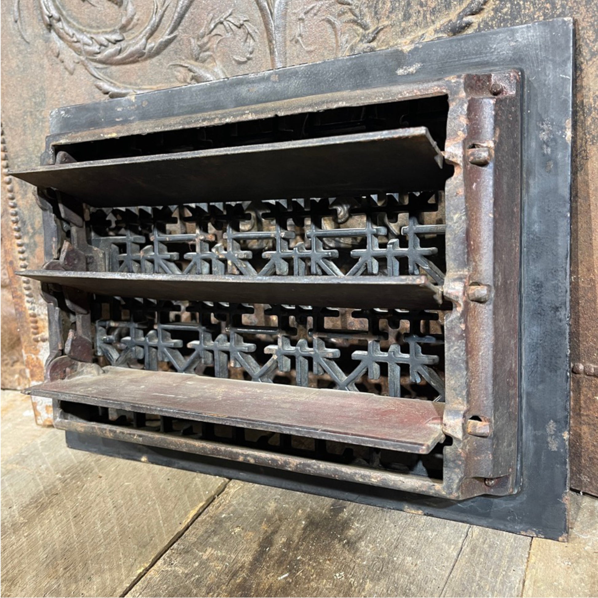 Antique cast iron floor grate with a delightful geometric design. Functioning with no visible loss or cracks. Baffles are original and complete.