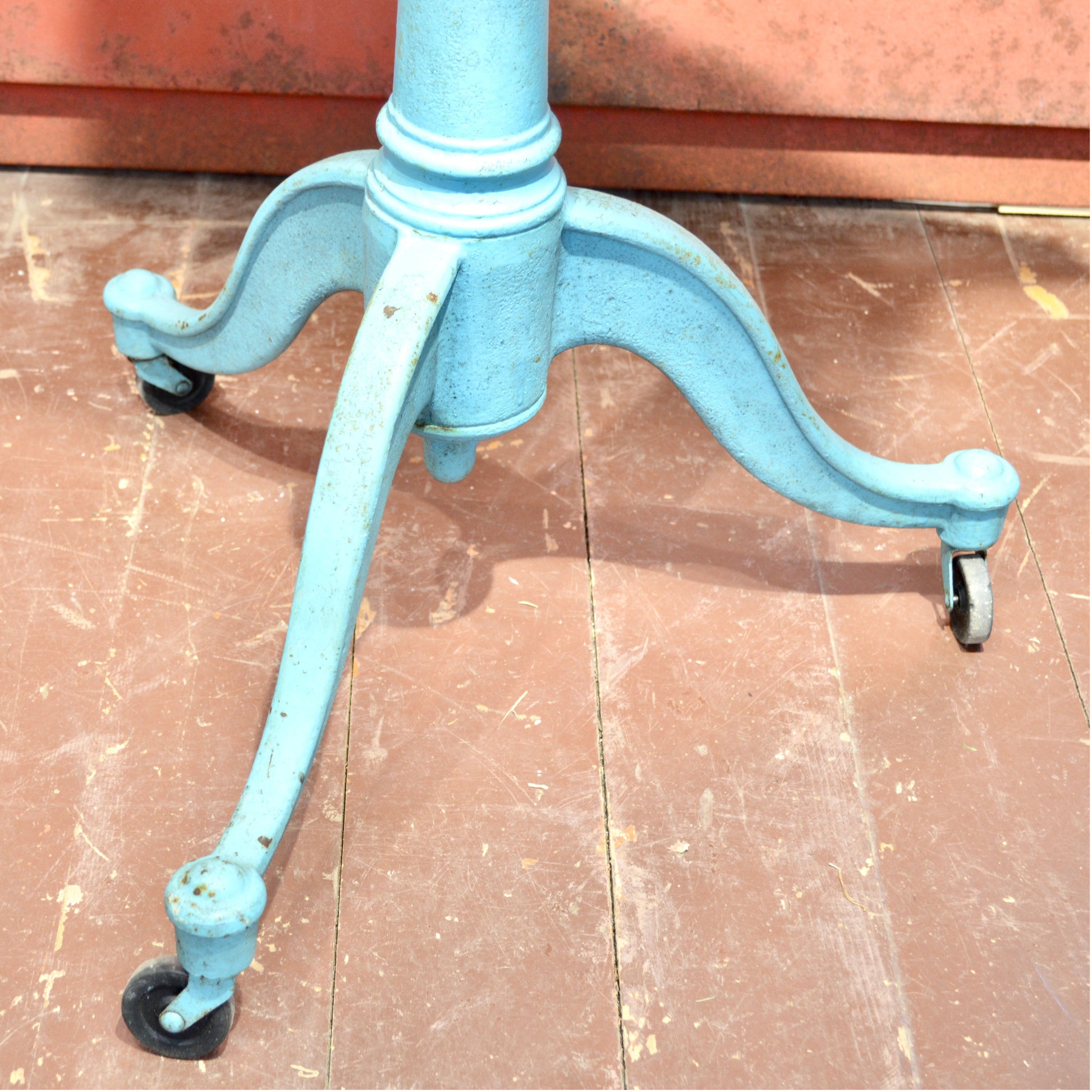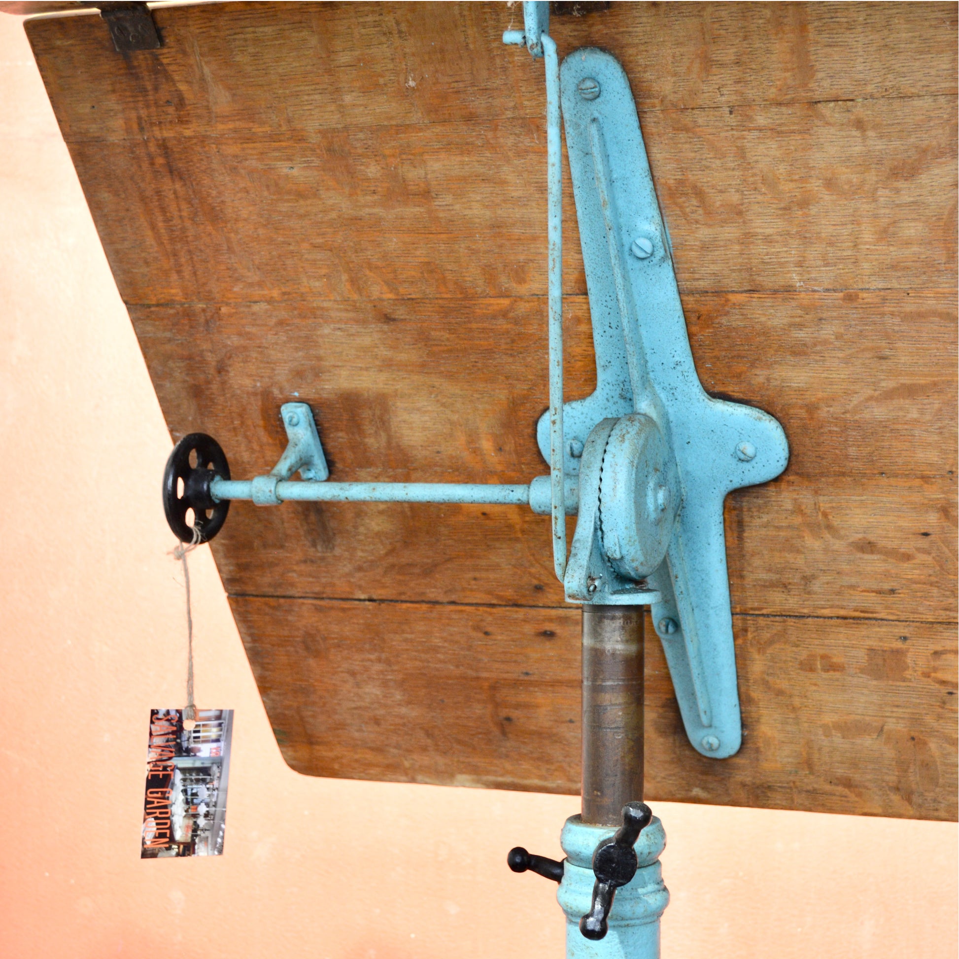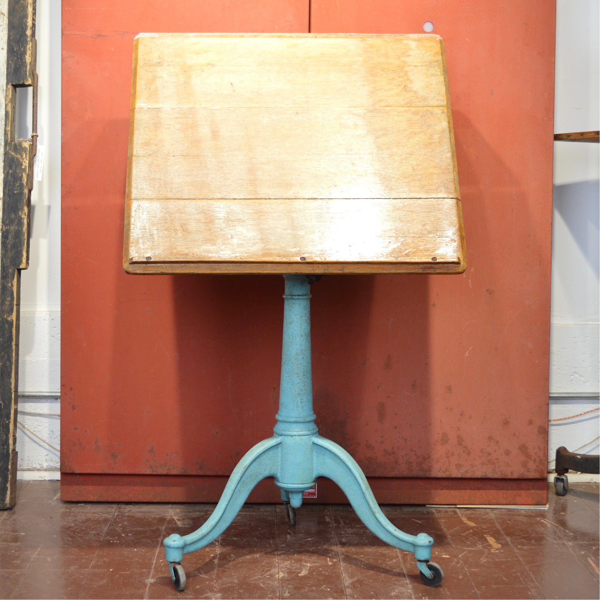 The combination of warm oak patina and aged blue cast iron makes this piece not only functional but also highly decorative—perfect as a standing desk, artist’s easel, retail display, or a striking focal point in a modern rustic or industrial interior.