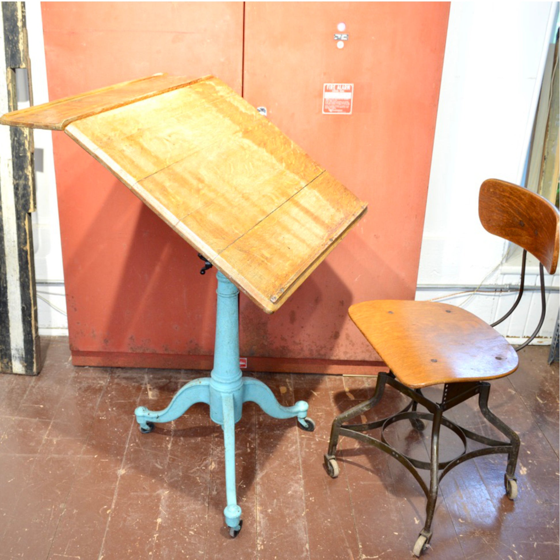 Antique Dietzgen Adjustable Drafting Table | Oak & Cast Iron Base