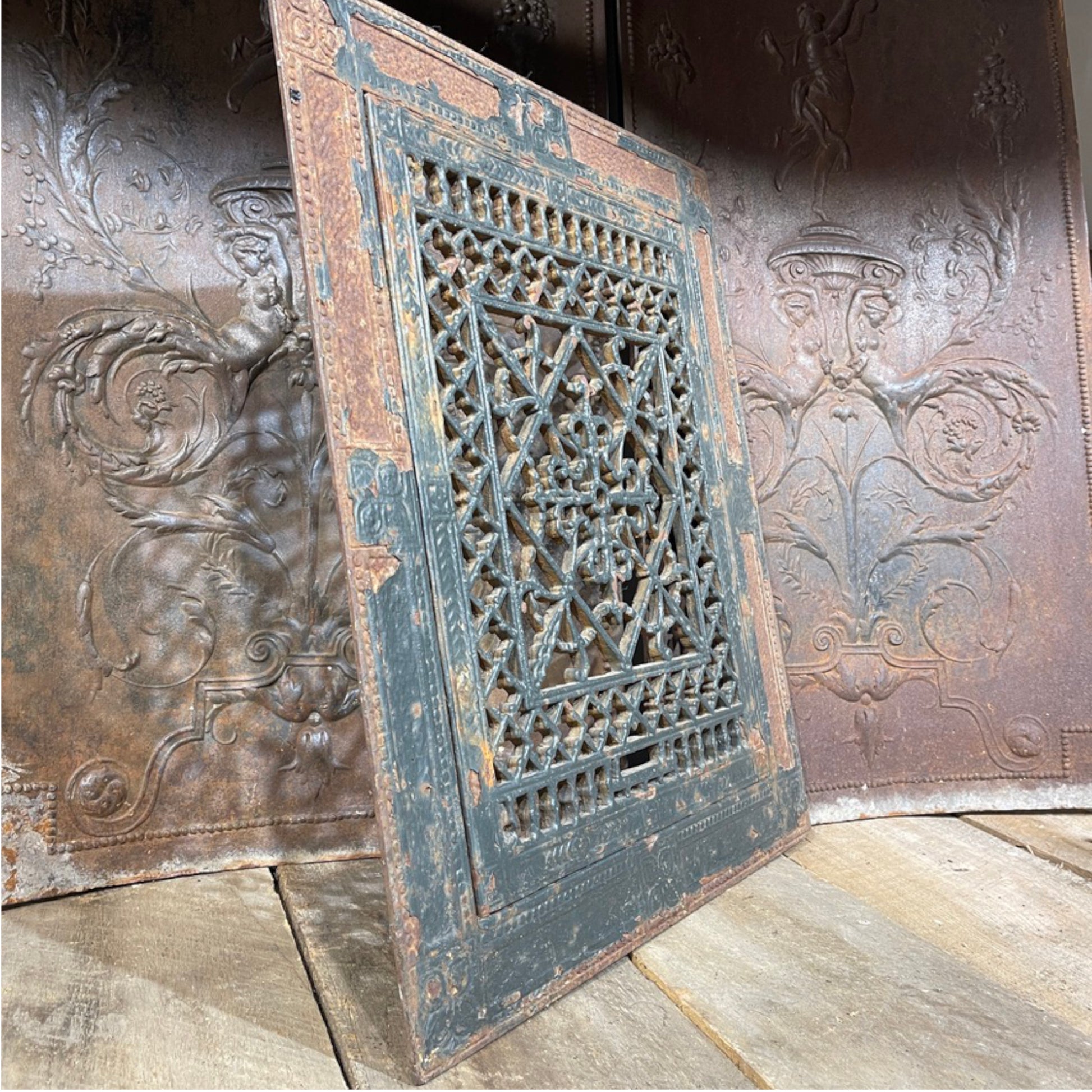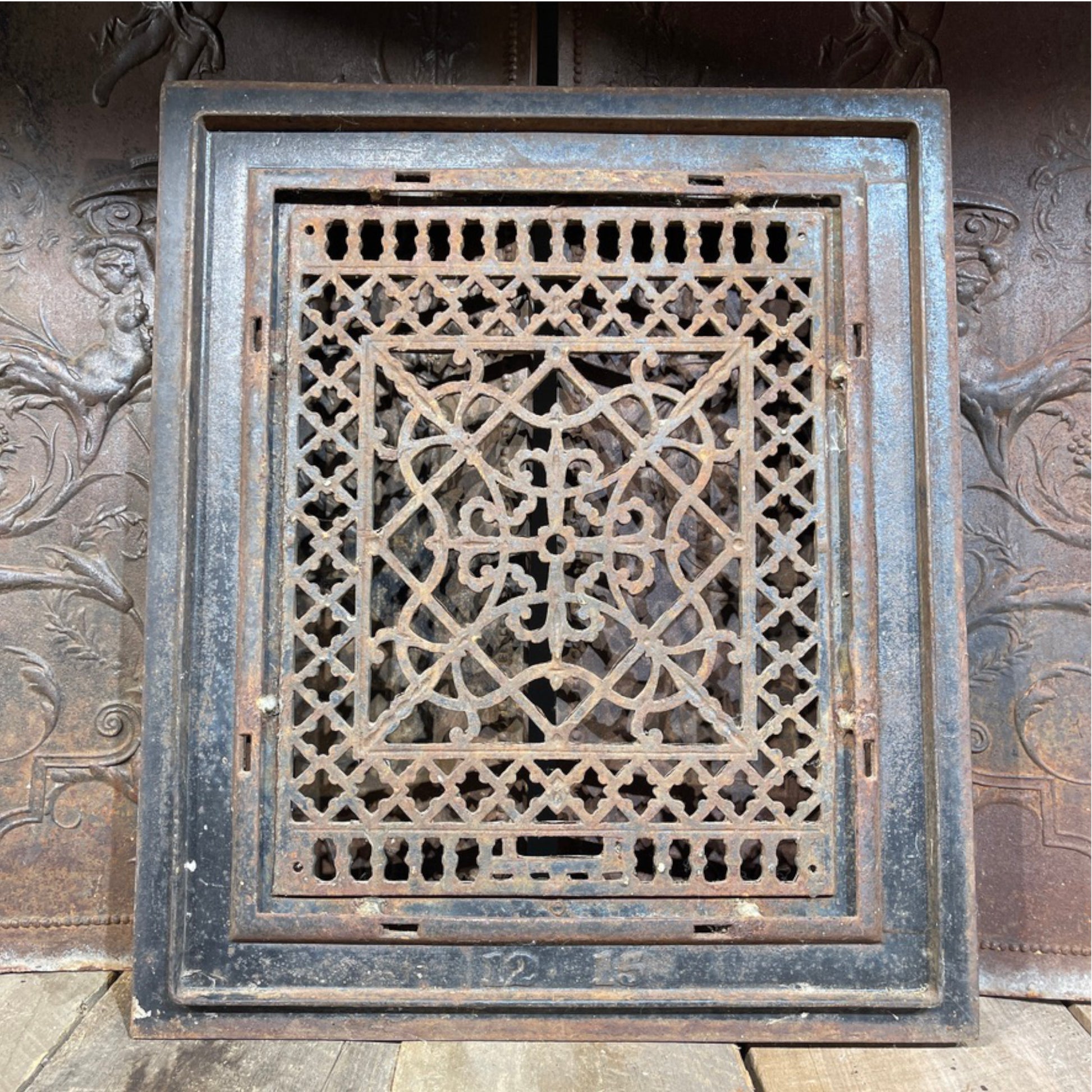 Antique cast iron heating floor grate with frame. Rusty and chippy, the unit could be refinished or used as decor.