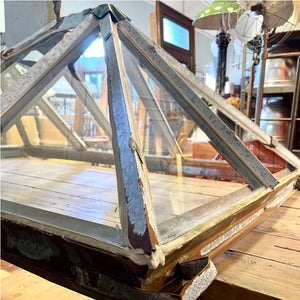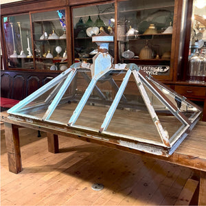 A remarkable salvaged industrial skylight crafted in galvanized steel with copper ridge caps and tabs. Once part of a factory or institutional roofline, this piece combines strength with surprising lightness. The original glass has been replaced with clear glazing, allowing light to pour through its pyramidal form.