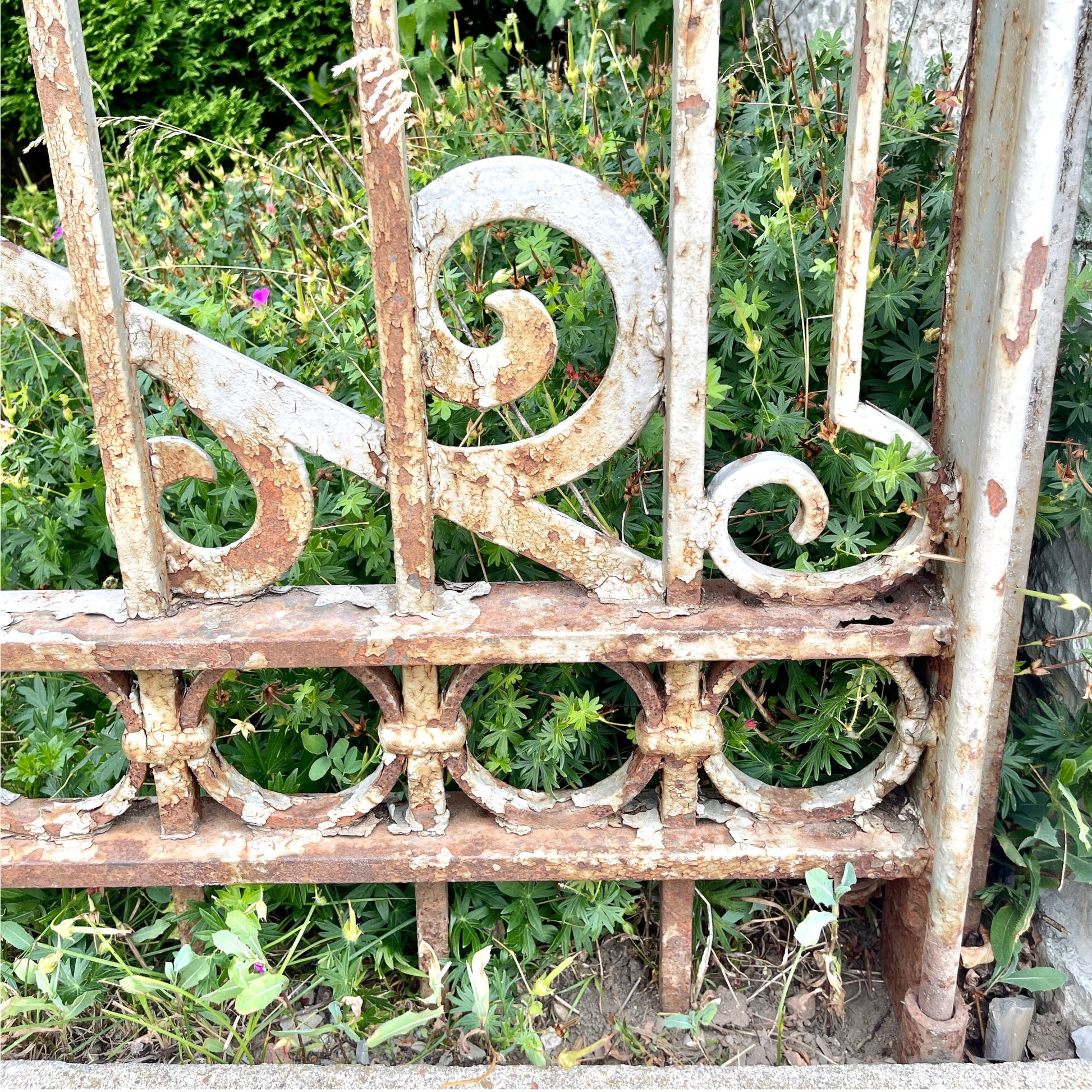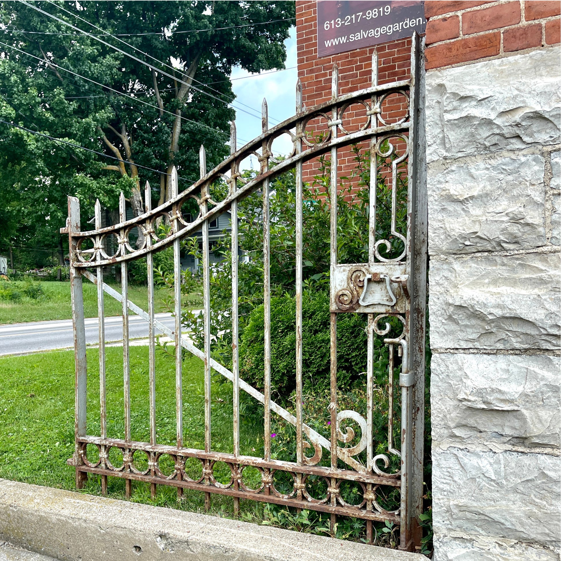 Iron gate section with wrought iron accents form a garden in Eastern Ontario. Early 20th century. A delightful way to accent an entrance to a home or business. There is some rust through on one section (shown in photos) but this unique artifact will add interest and style to your garden for many years to come.