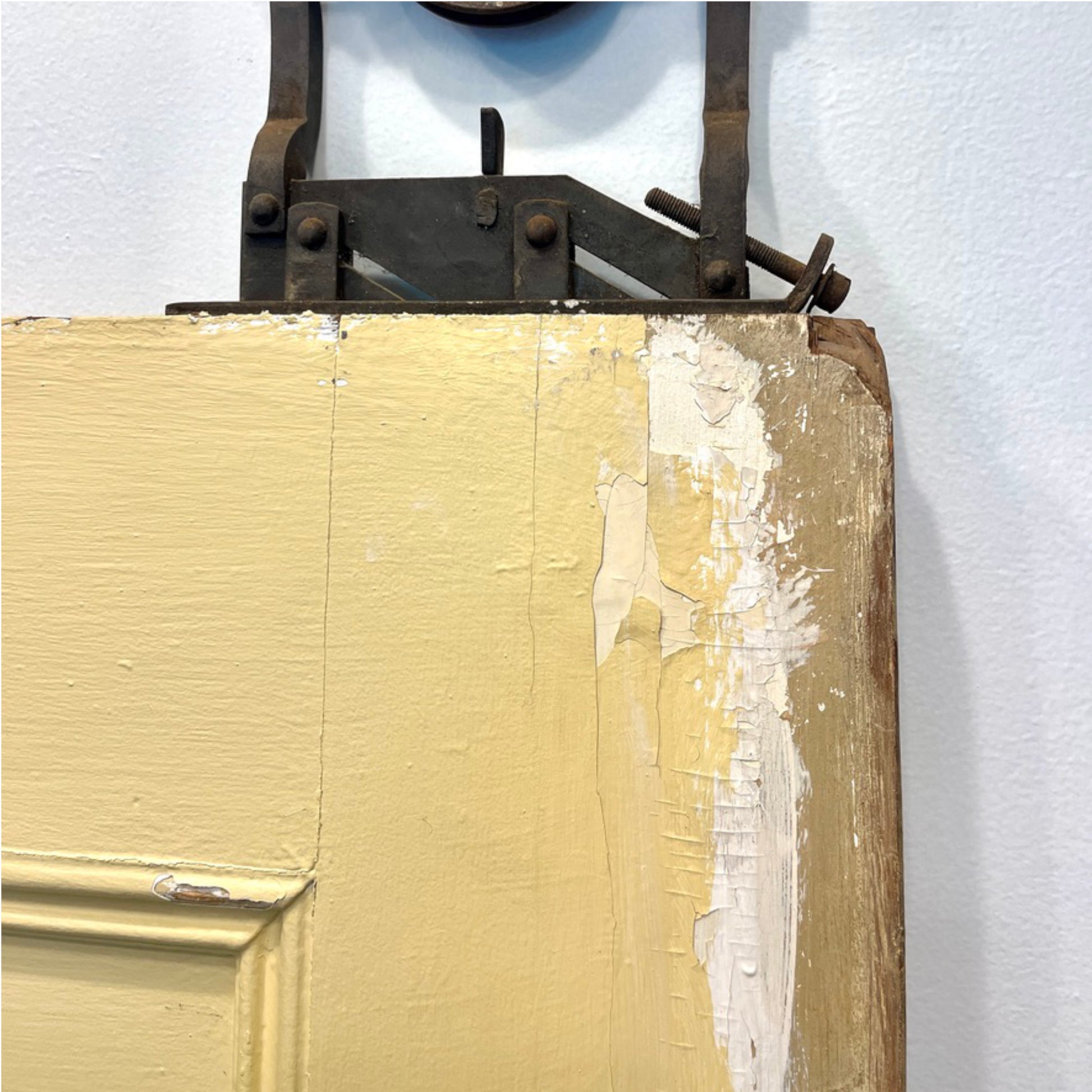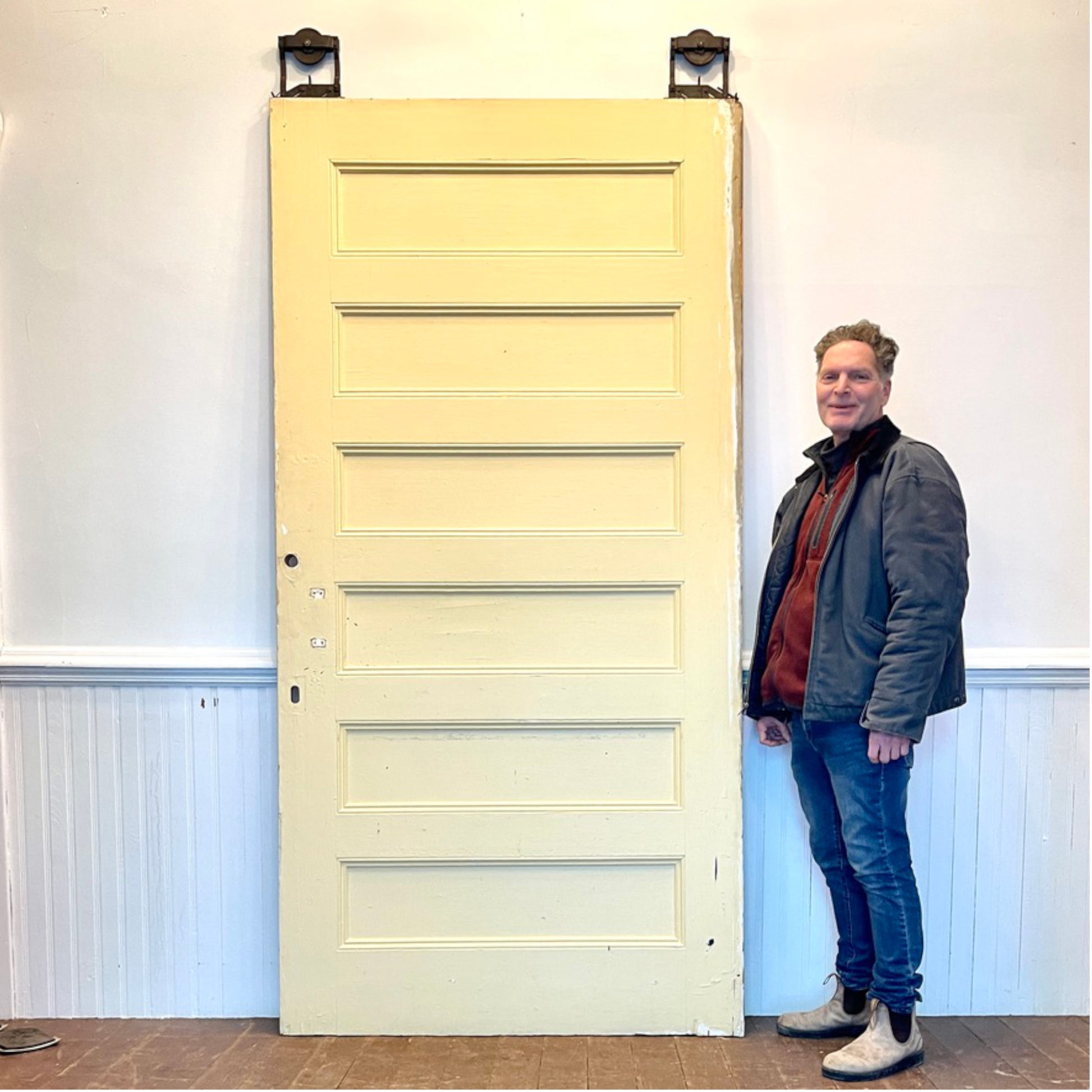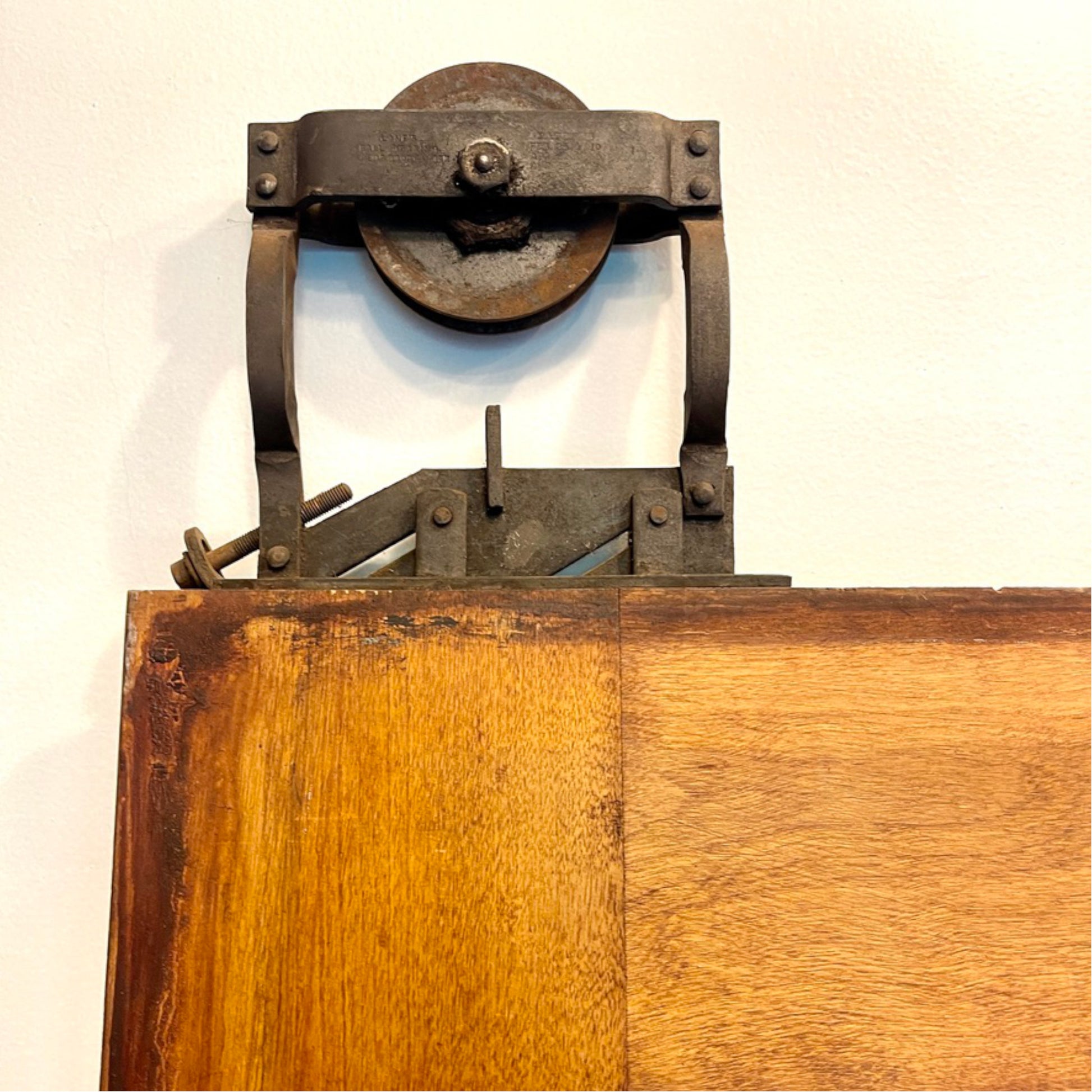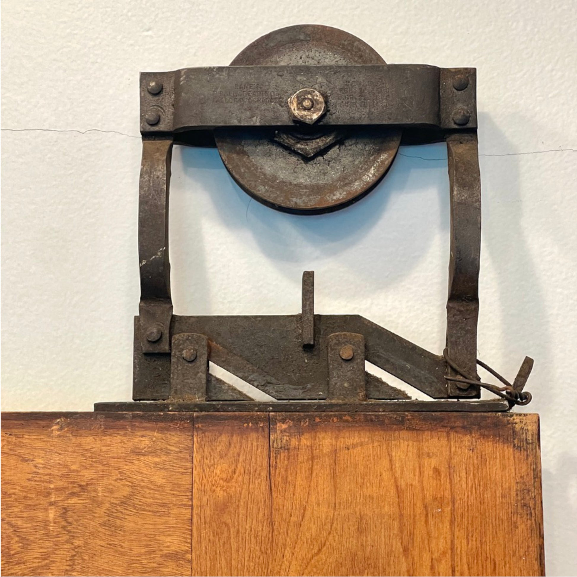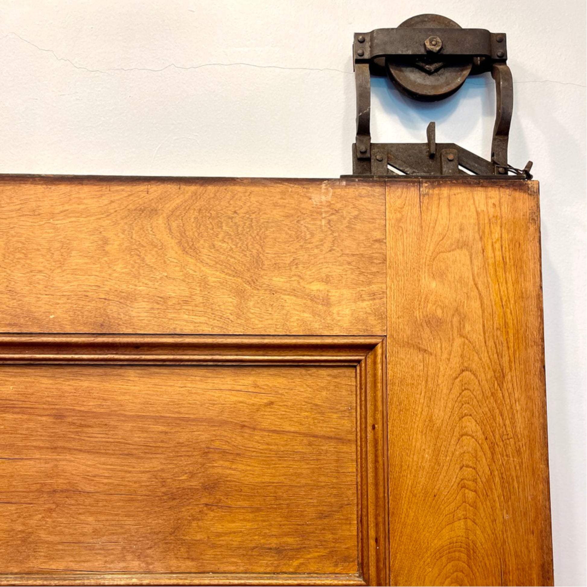 The original roller hardware remains intact, a rare and desirable detail that preserves the door’s authentic engineering and allows it to be reinstalled in a traditional pocket track if desired.