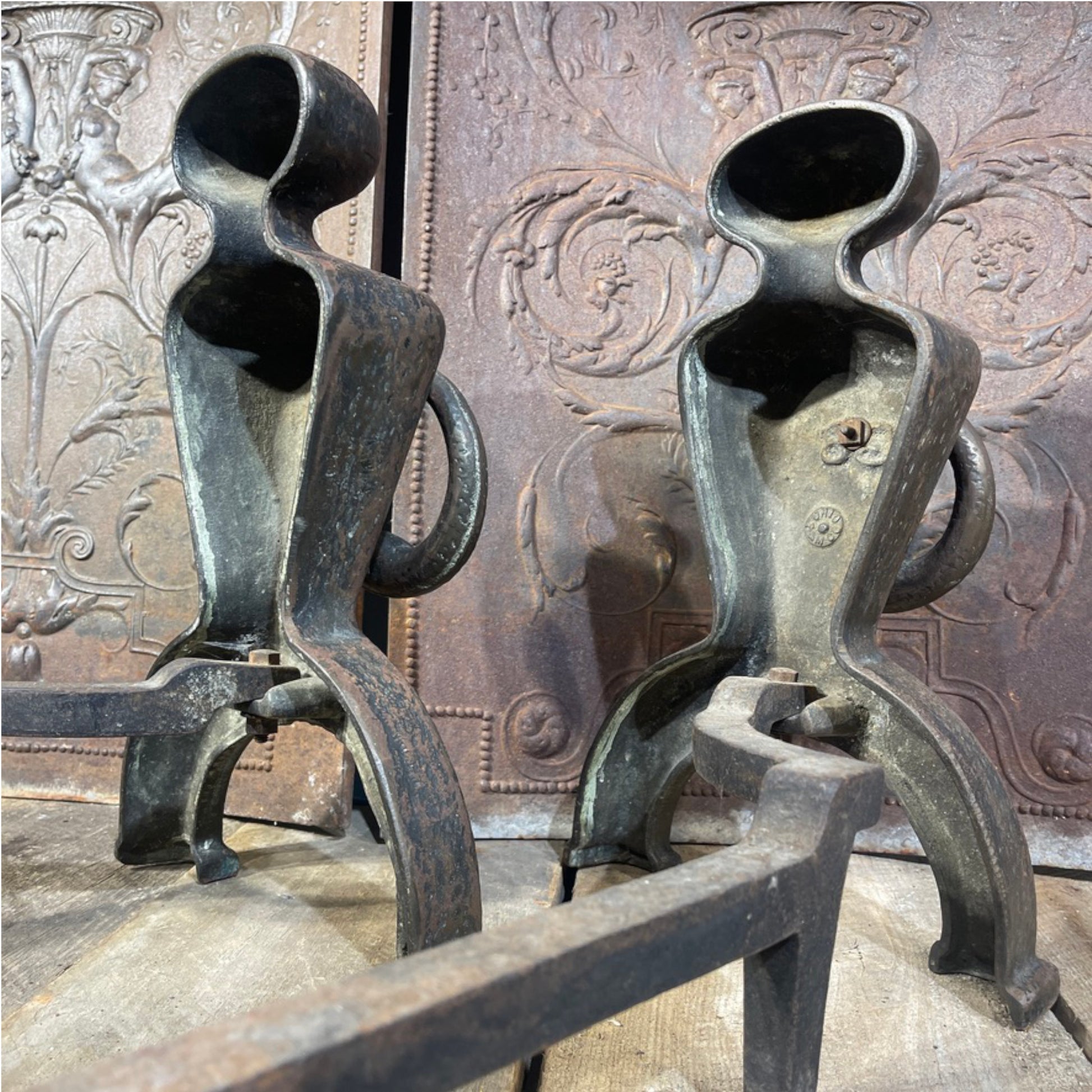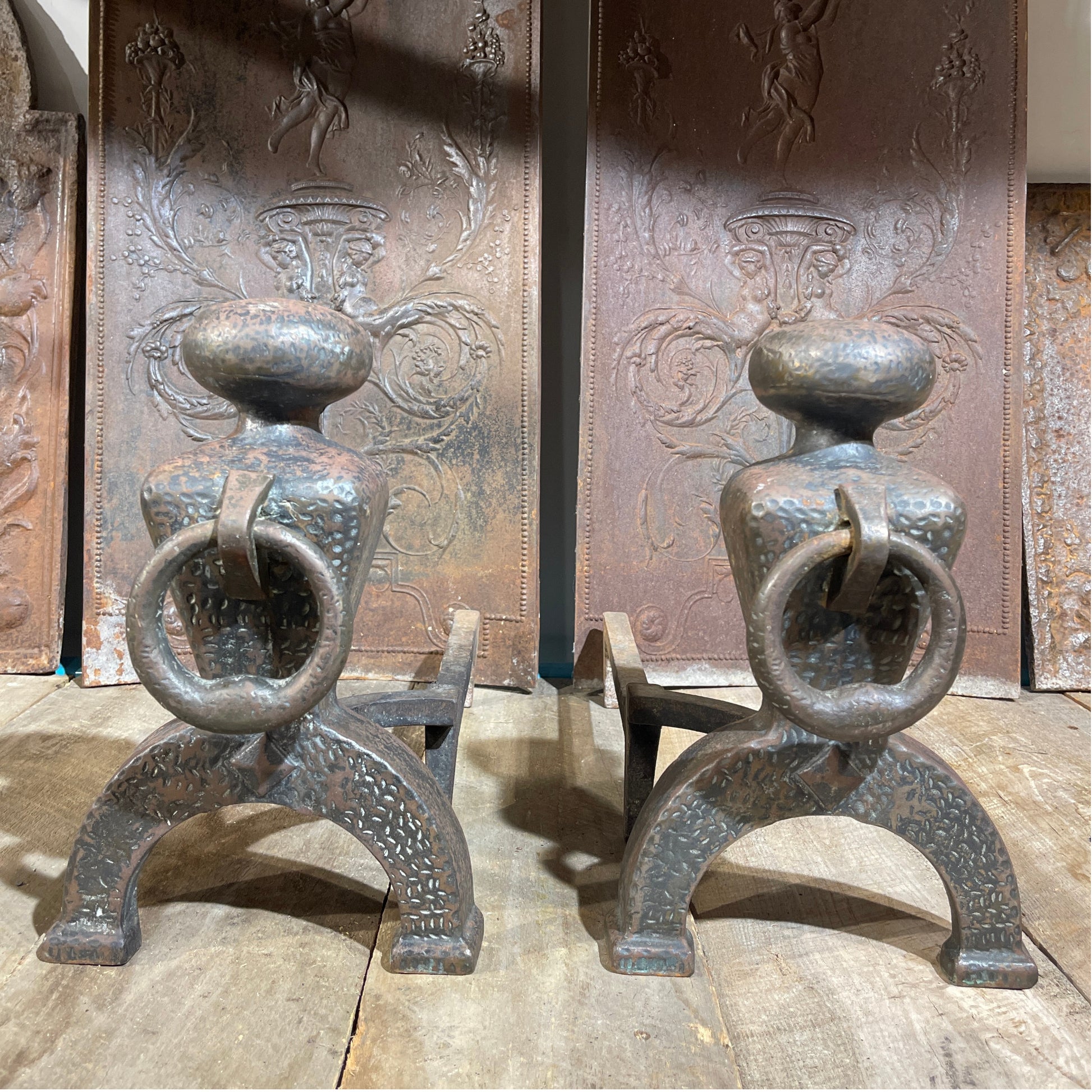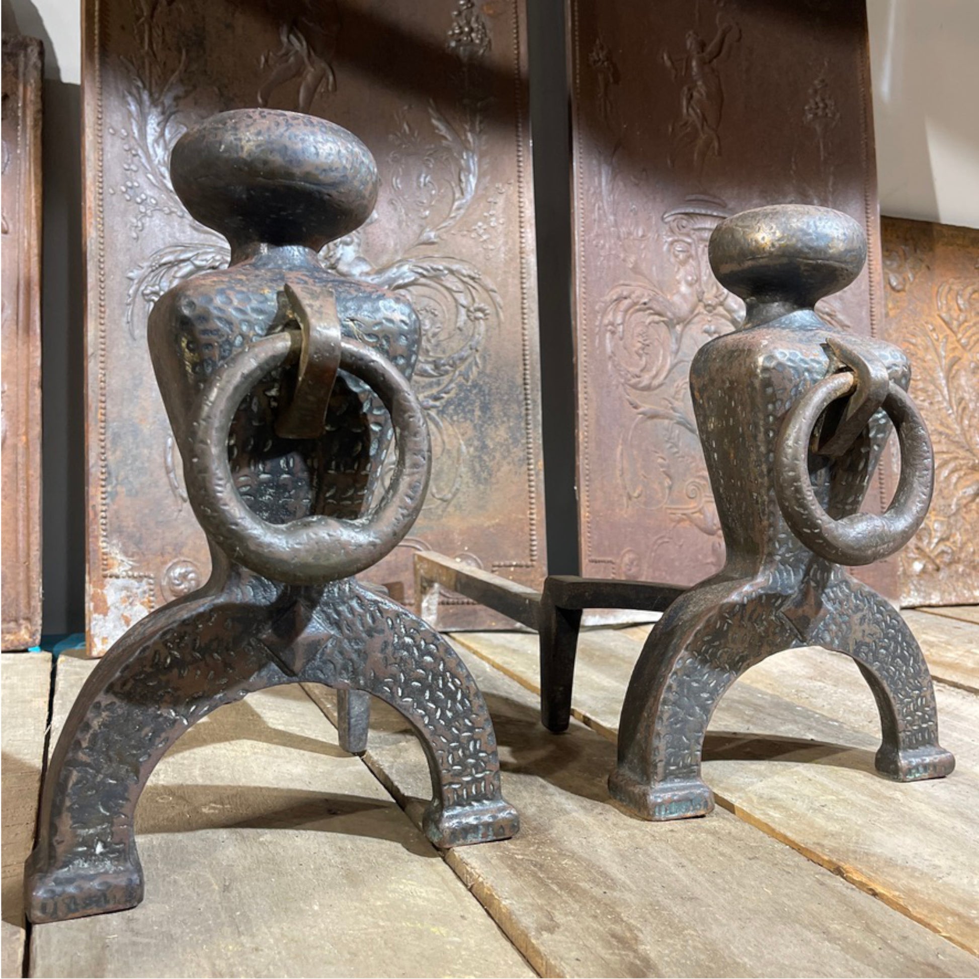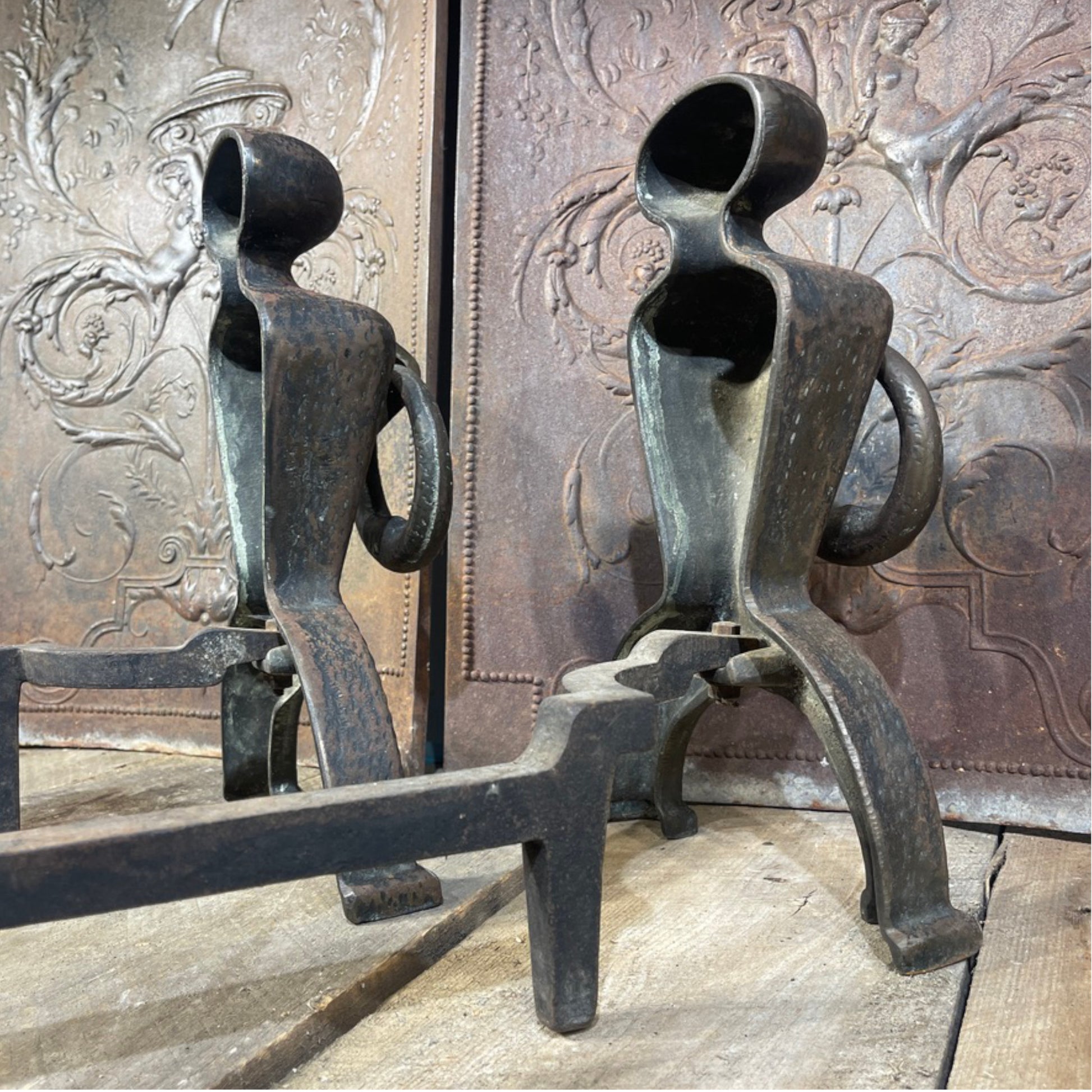Antique Arts and Crafts andirons with anthropomorphic design c. 1910. Made by F & M Co, Ohio Nice overall condition, rare to find these units with the large decorative rings still in place.