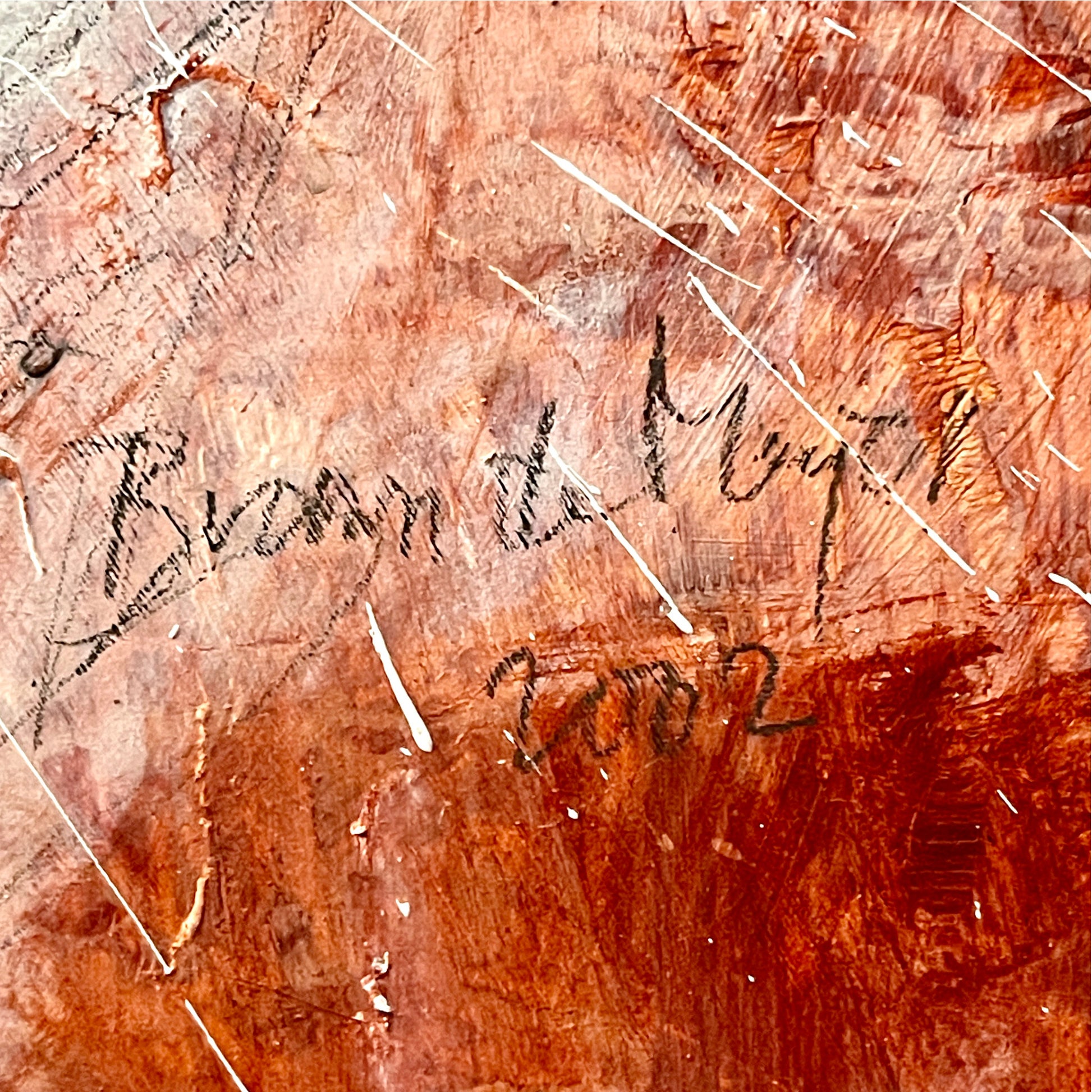 Painted on a 4' x 5' panel and housed in a richly detailed modern frame, the piece measures approximately 56" wide by 67.5" high. Signed and dated 2002, it invites interpretation and introspection—anchoring any space with its raw energy and cinematic scale.