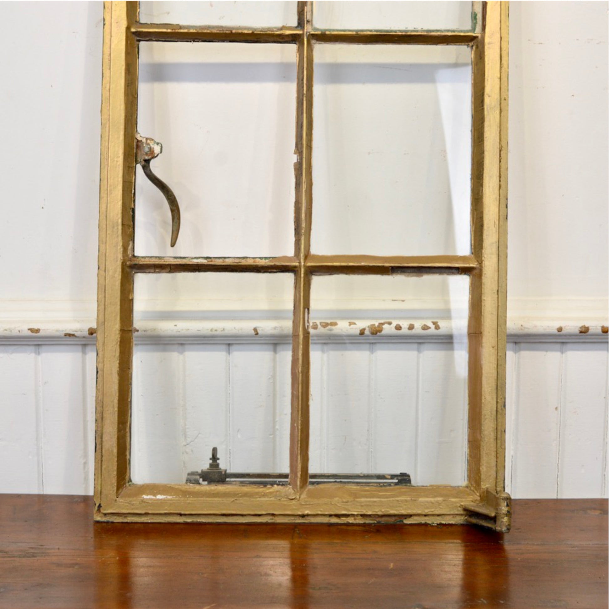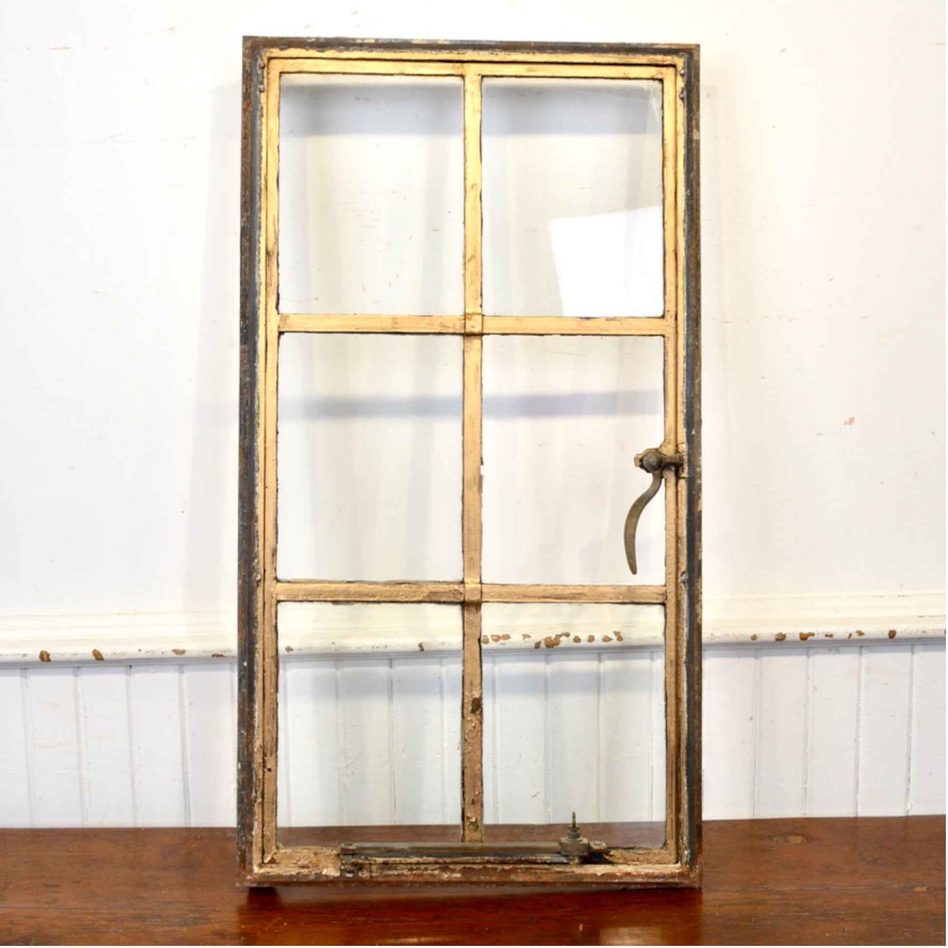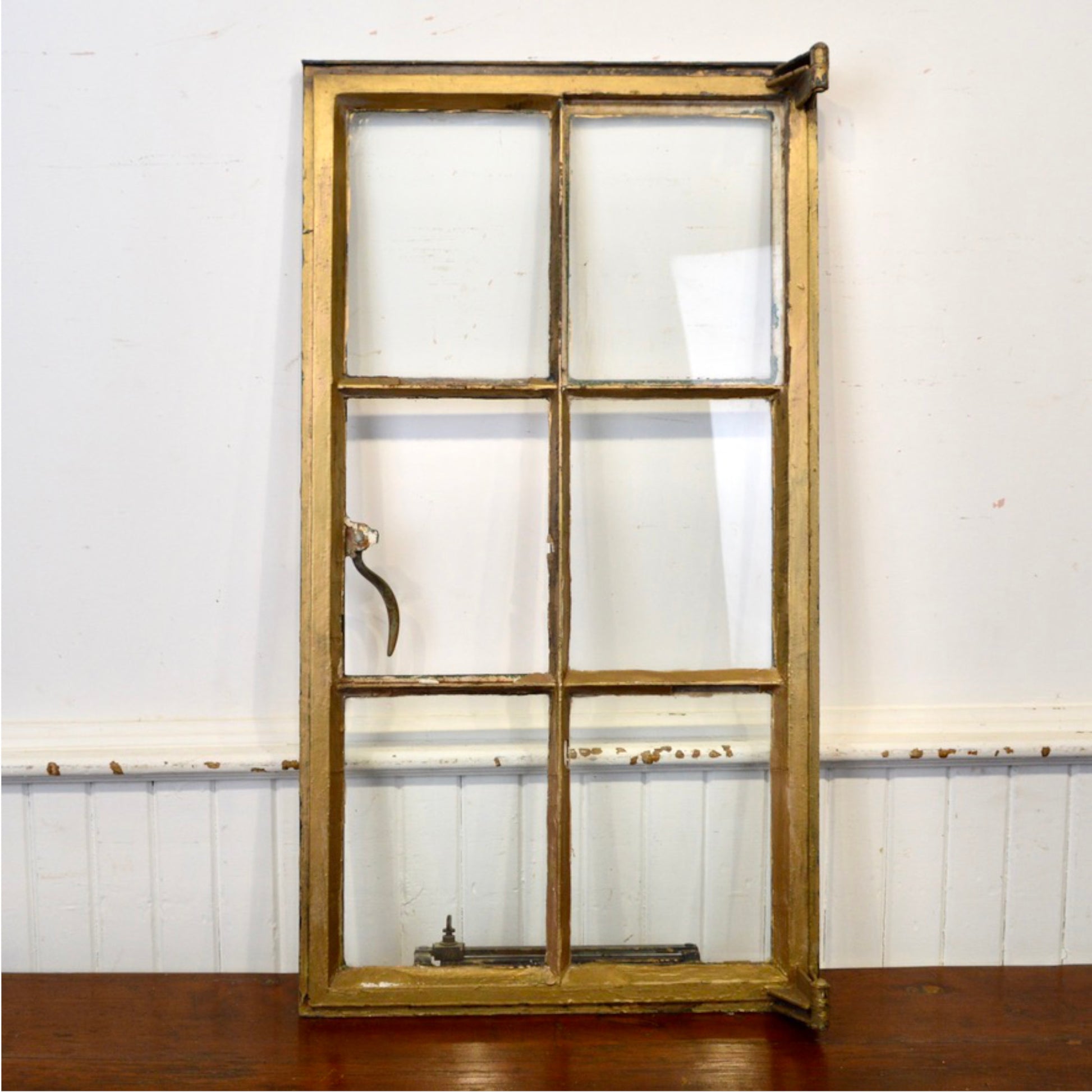 Salvaged from a beautifully restored 1920s home, this antique Hope’s window features six divided lights, with a frame constructed of solid steel with the distinctive stamped pattern where mullions intersect — a signature of Hope’s Windows craftsmanship.