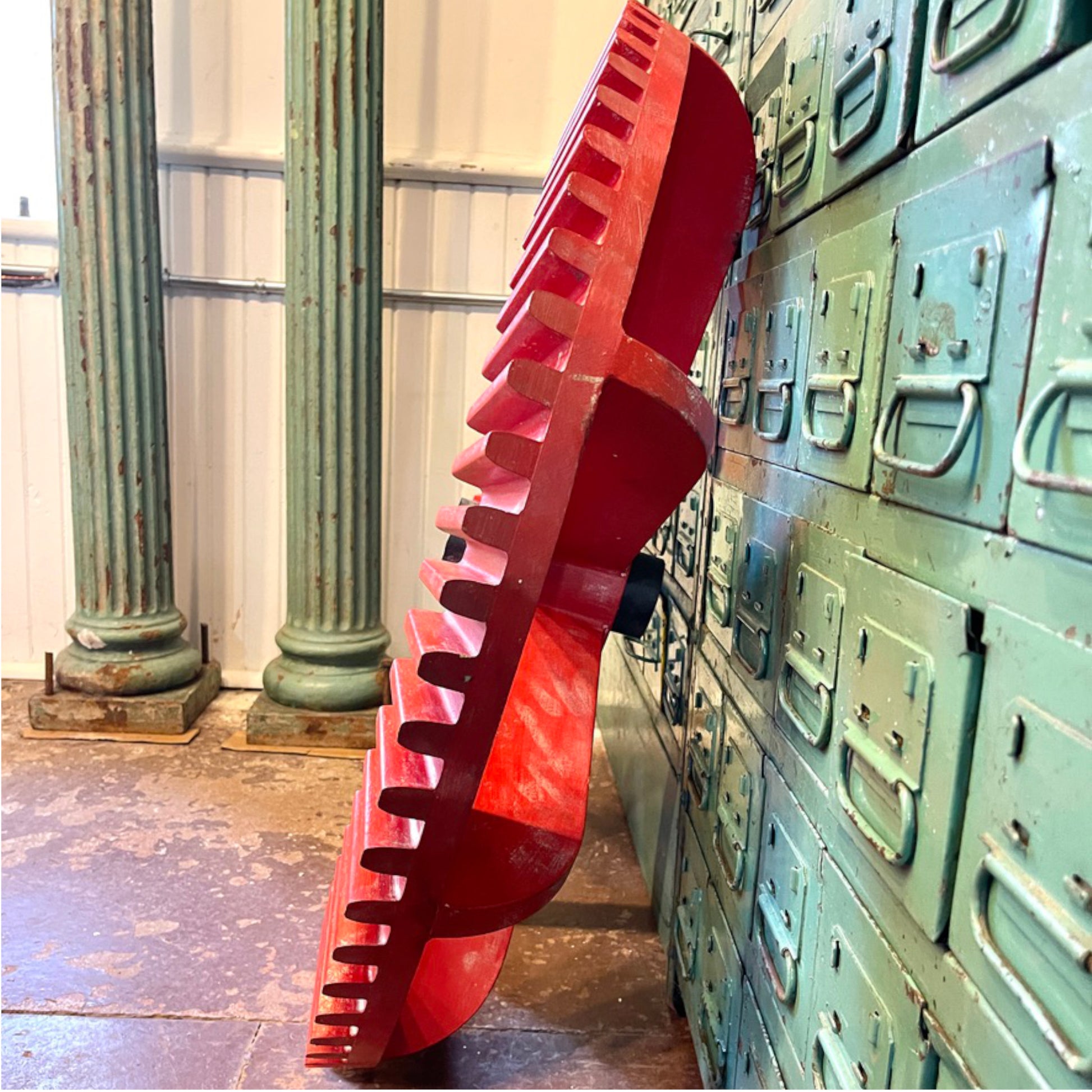 Large wooden casting mold from an Ontario foundry. Created with precision by skilled craftsman, these molds were key to creating balanced cast iron wheels and cogs for the machines of the industrial age. Like the foundries they were once used in, these unique pieces are becoming hard to find. Great condition with original paint.