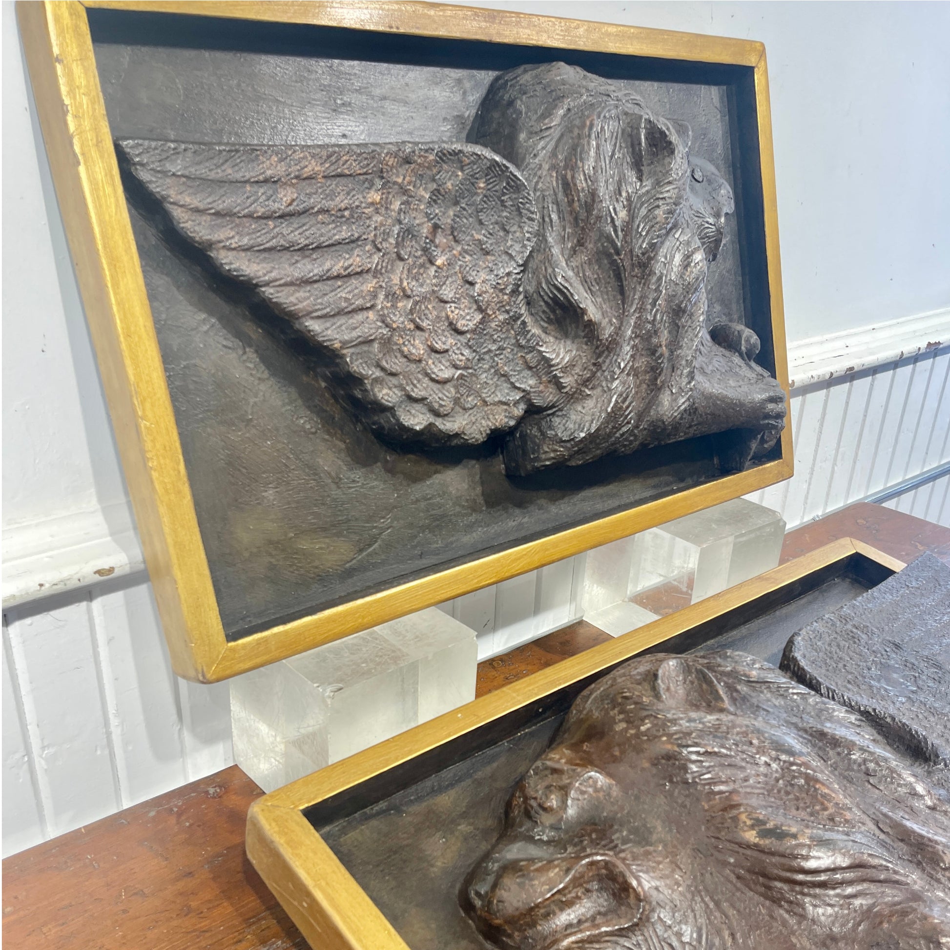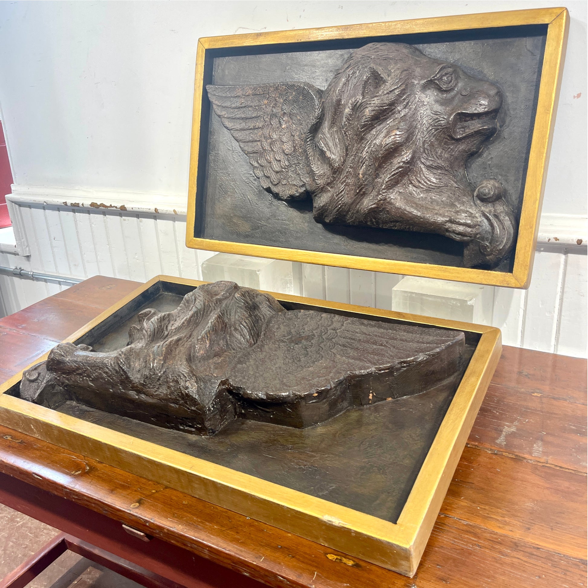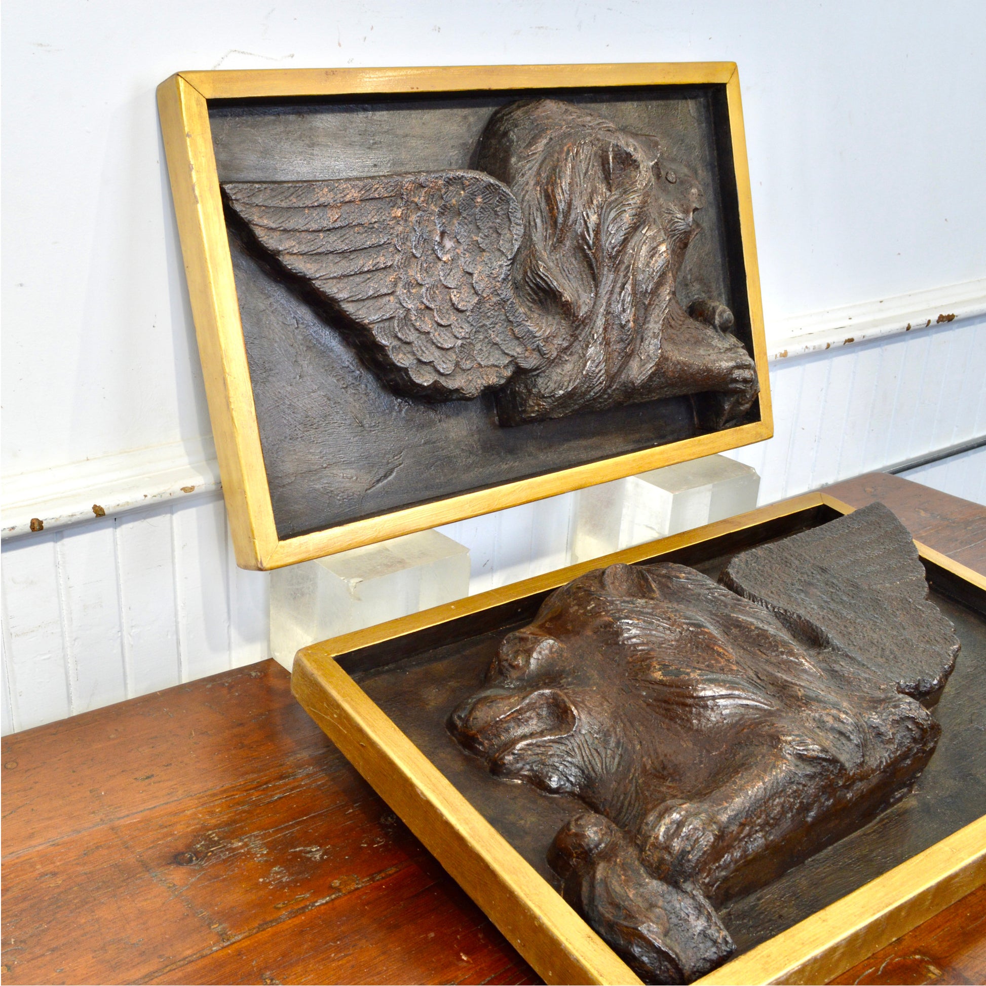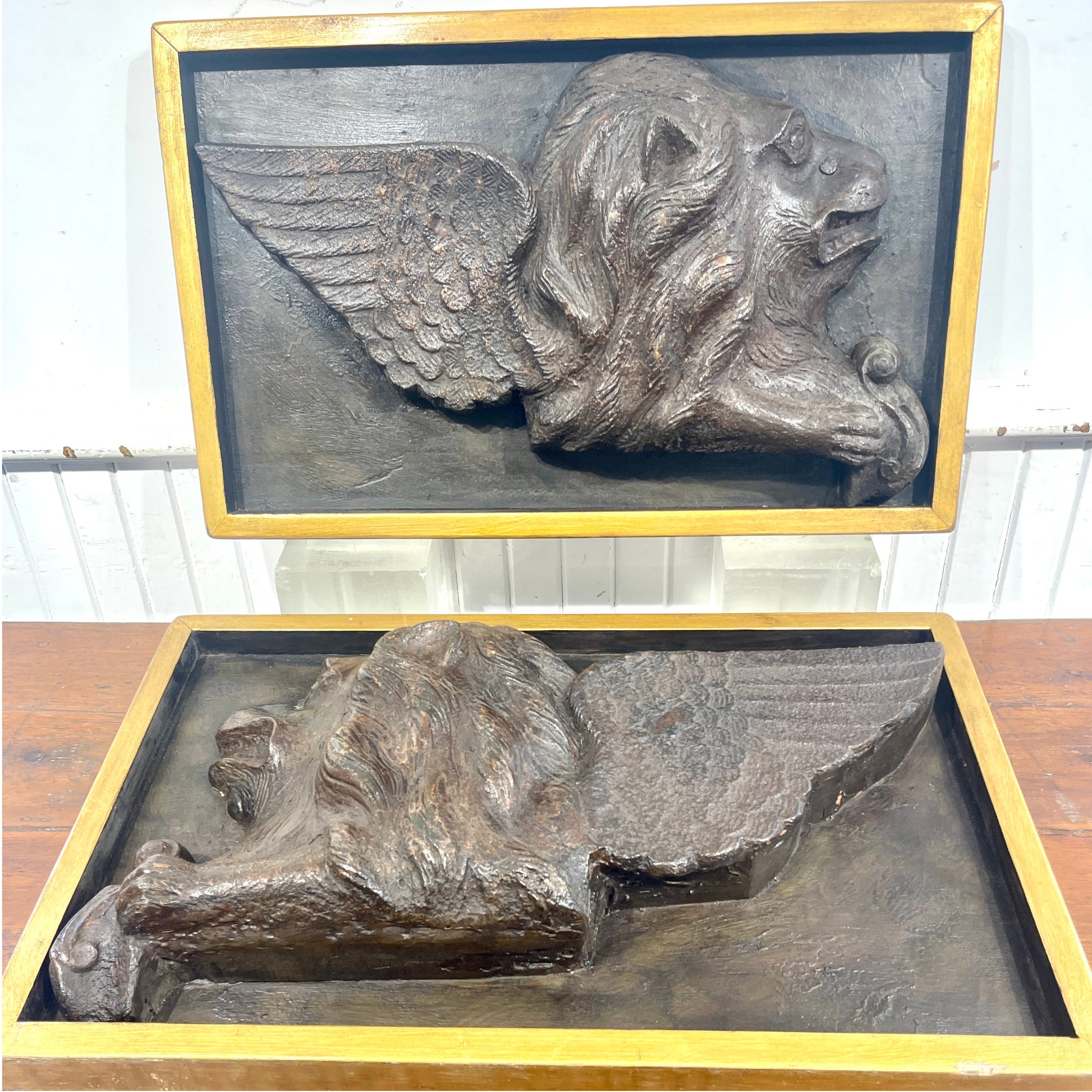 Each lion is rendered in deep relief with remarkable detail: outstretched feathered wings, flowing mane, and a paw resting on a scroll—hallmarks of the Venetian style. Framed in custom gilt shadowboxes, these panels present beautifully whether wall-mounted or displayed on easels.