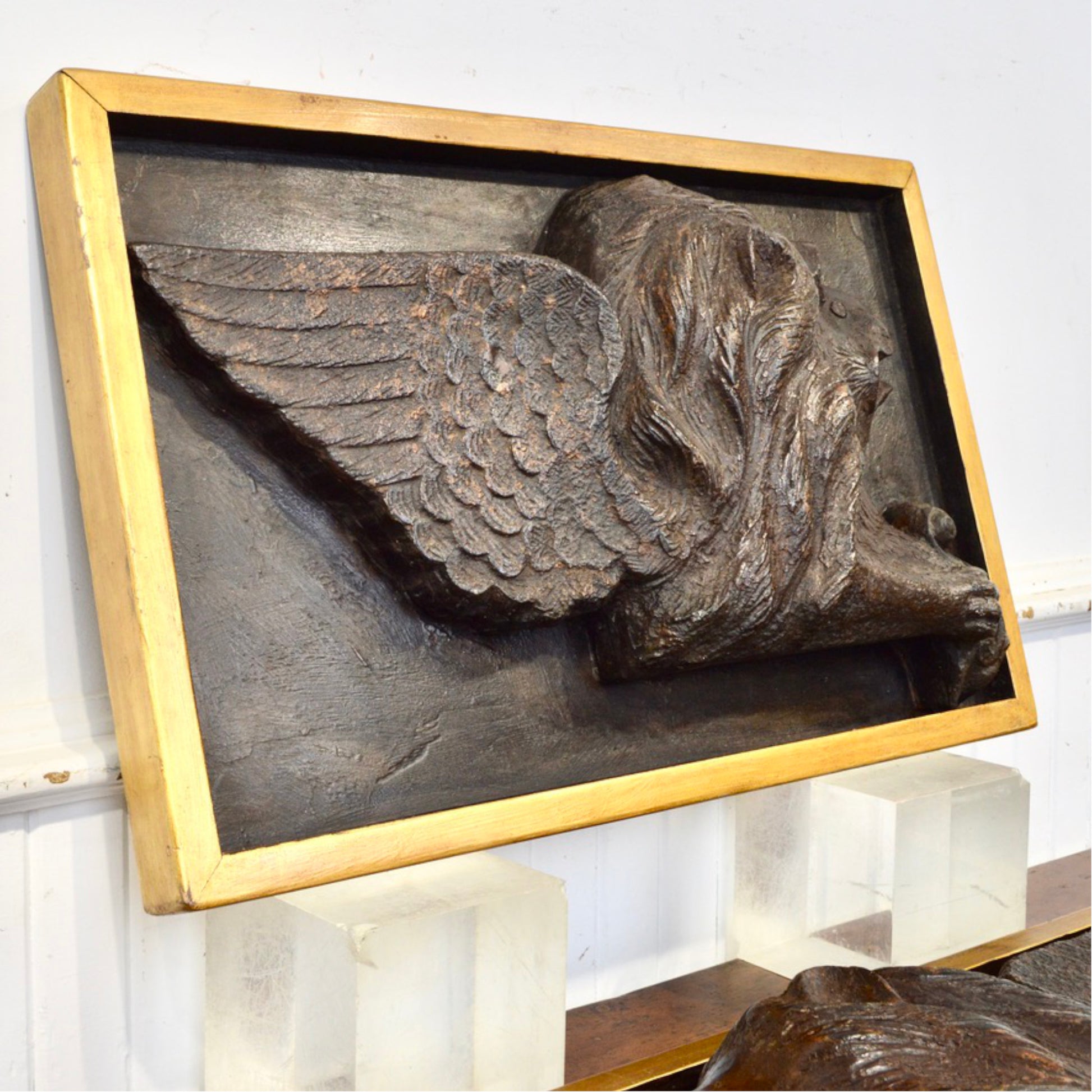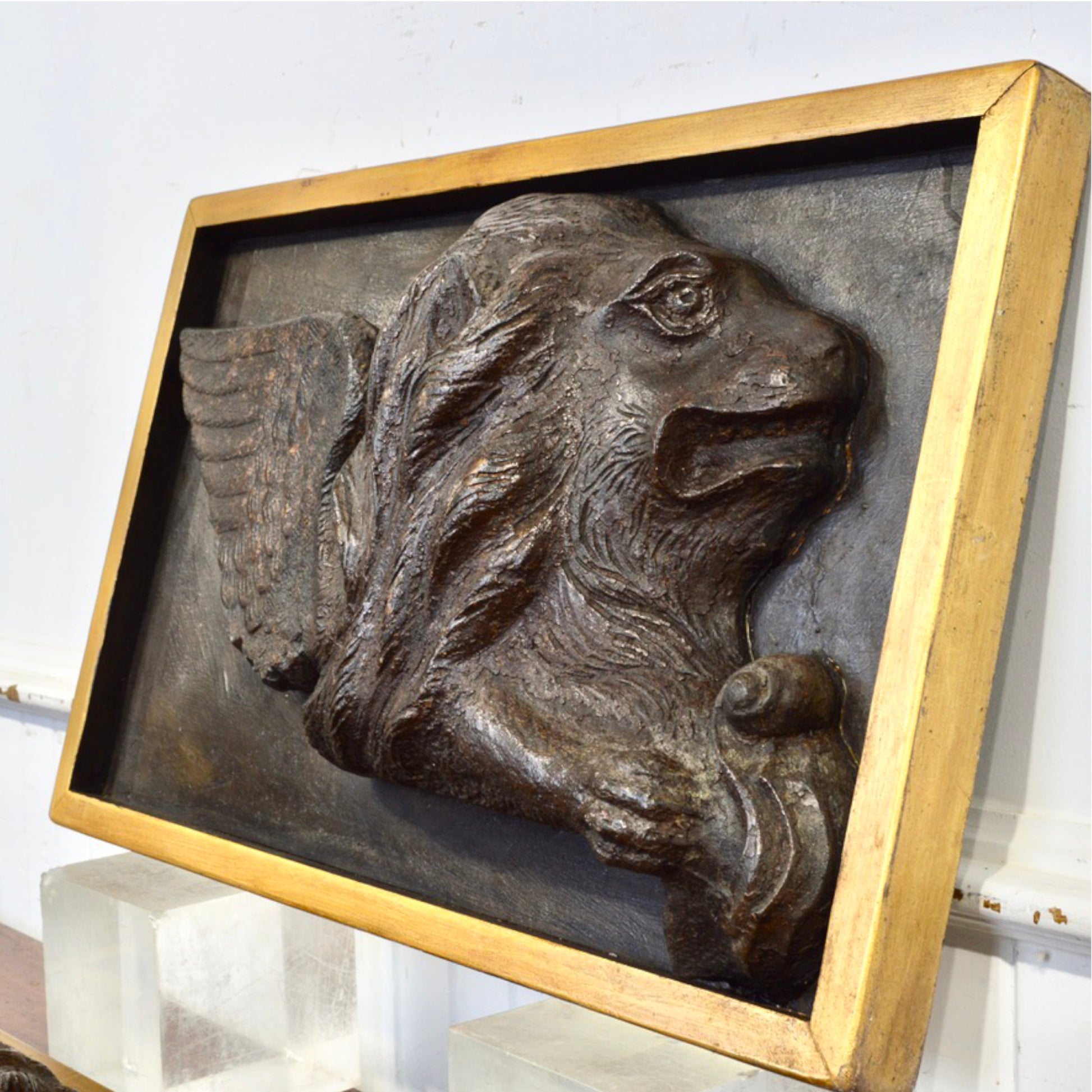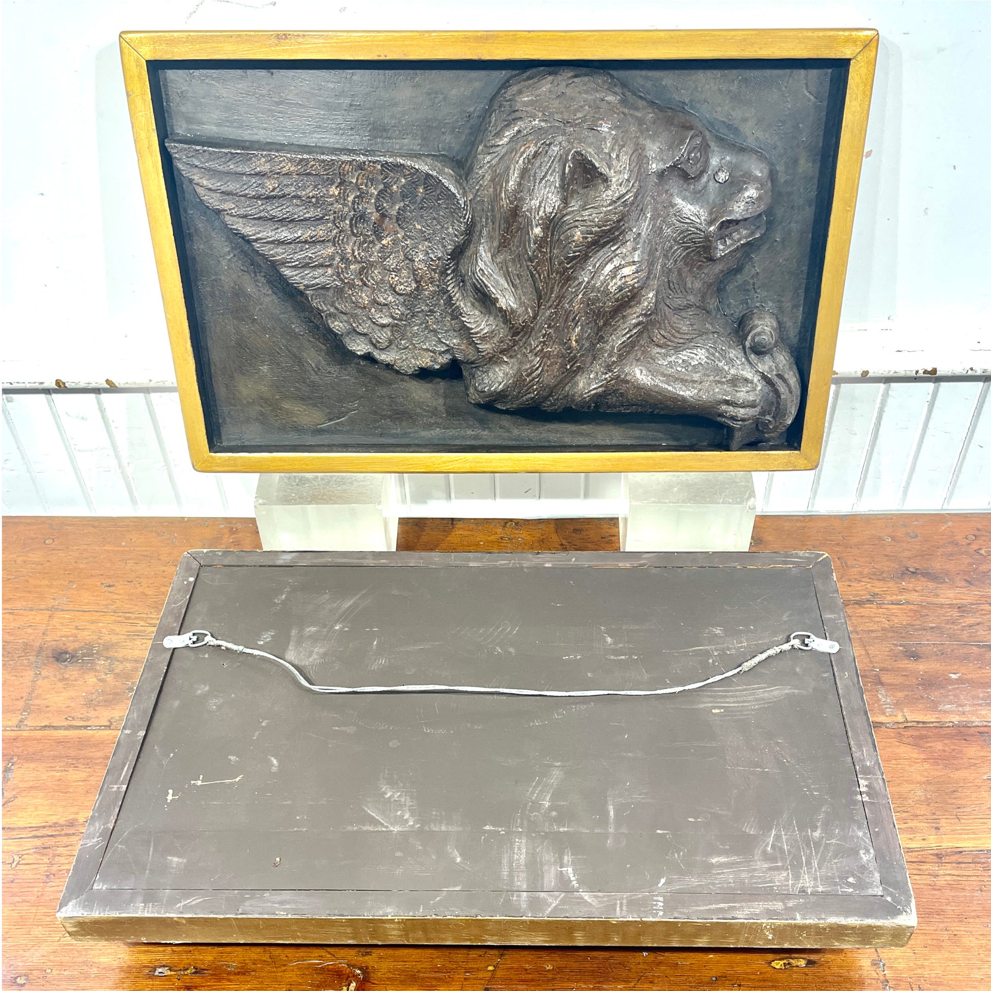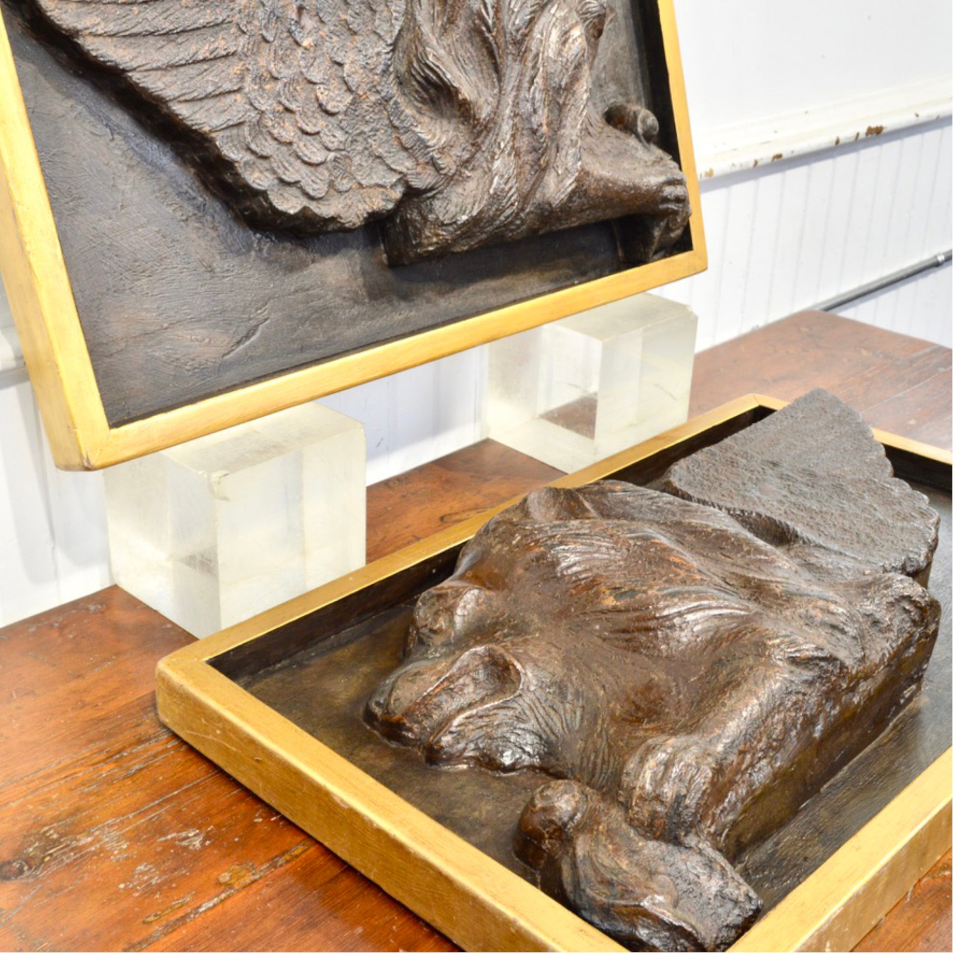 Each lion is rendered in deep relief with remarkable detail: outstretched feathered wings, flowing mane, and a paw resting on a scroll—hallmarks of the Venetian style. Framed in custom gilt shadowboxes, these panels present beautifully whether wall-mounted or displayed on easels.