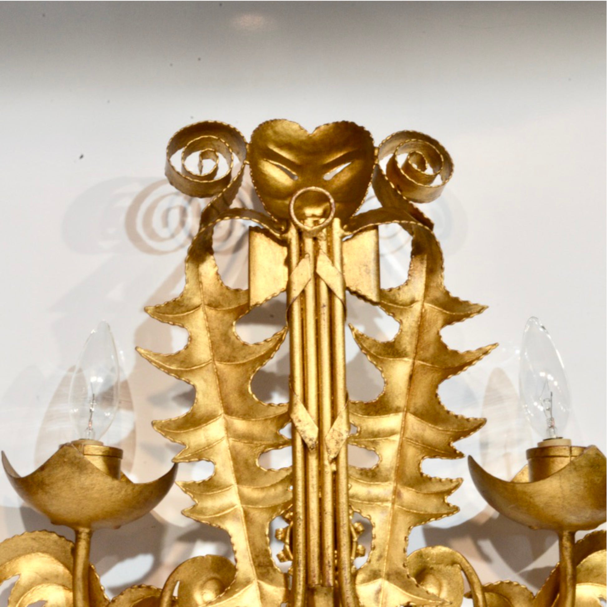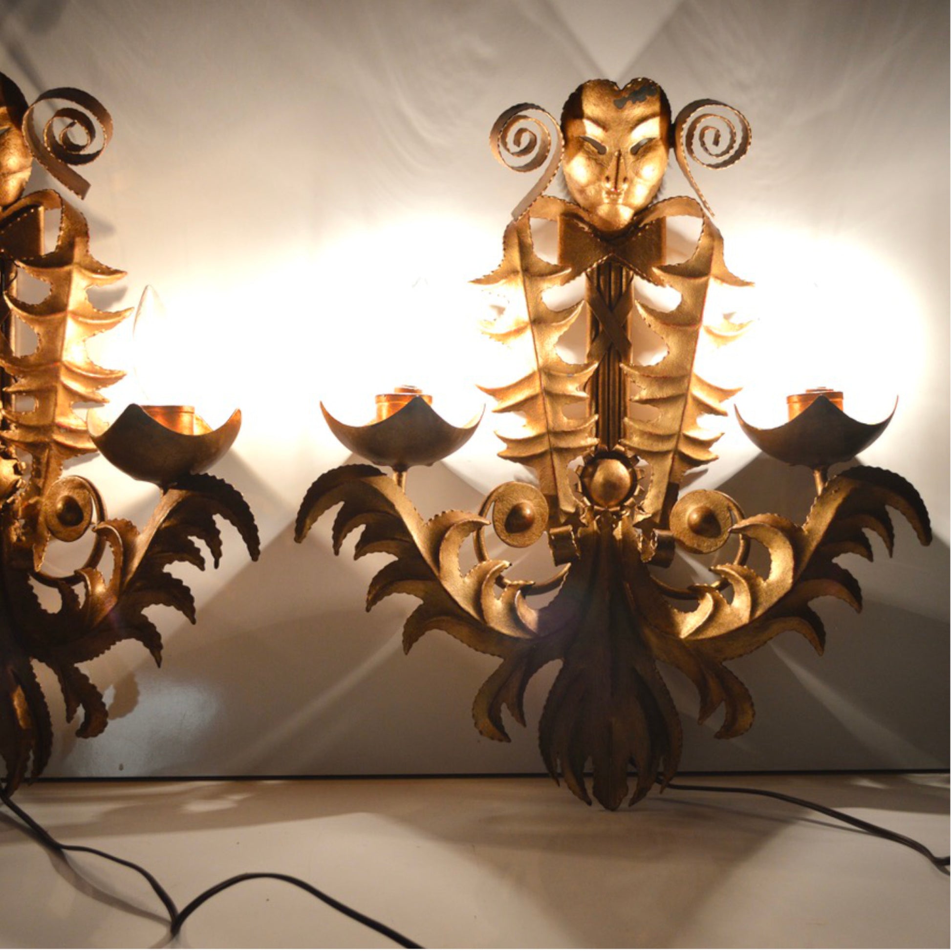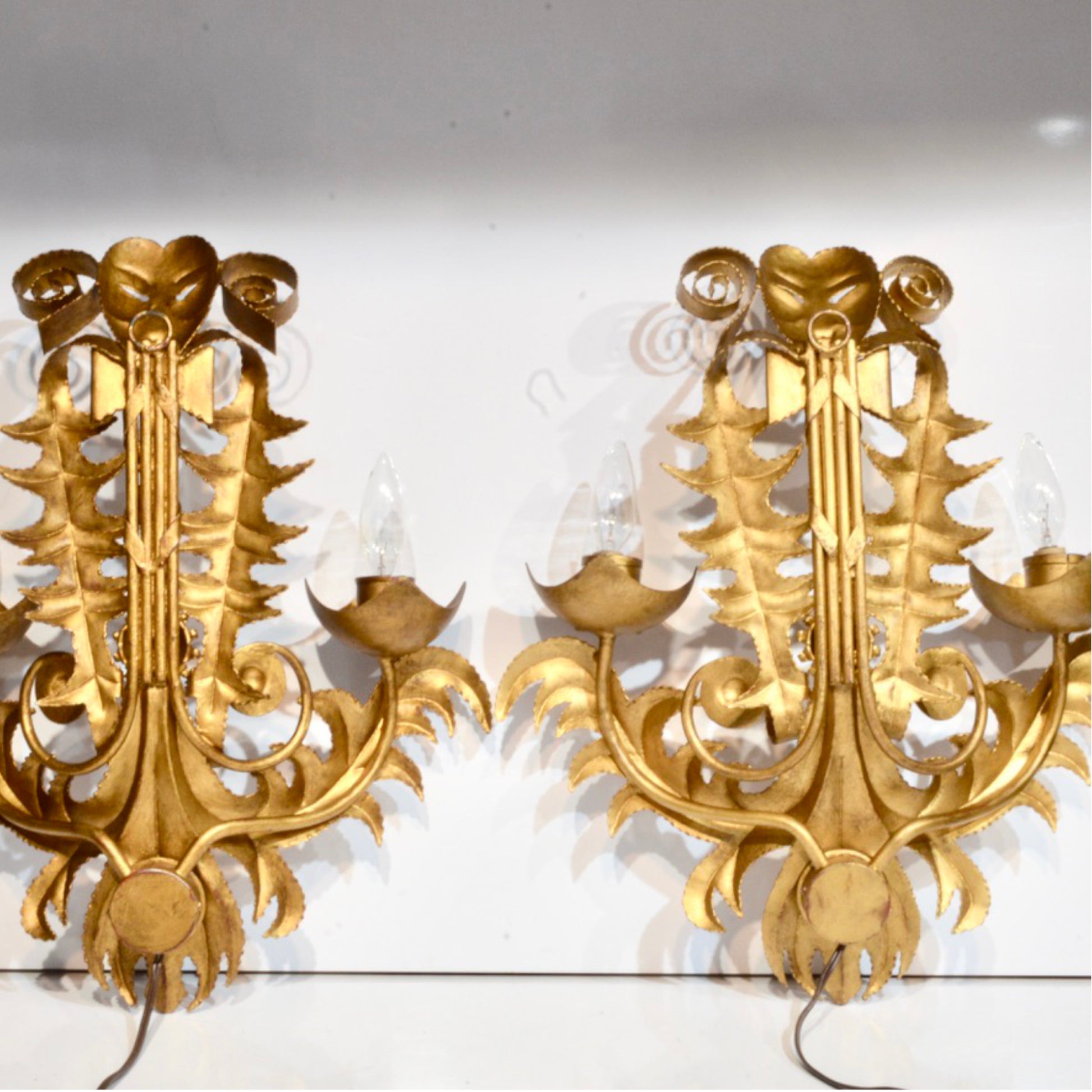 Each sconce features two candle-style bulb sockets set in floral-inspired cups with curling frond arms. The sculptural forms are both bold and whimsical—an unmistakable nod to Italy’s masked traditions, with a surrealist edge that reads as both regal and avant-garde.