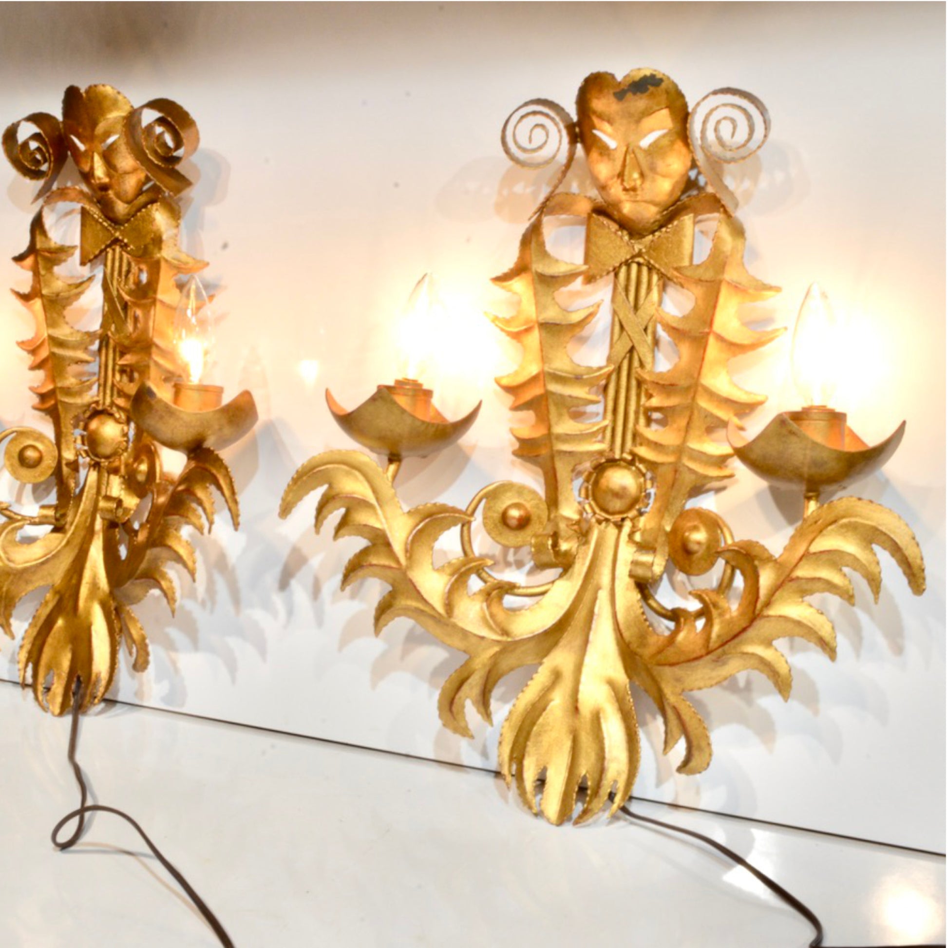 Dramatic and theatrical, this pair of French-made wall sconces captures the spirit of the Venice Carnival with stylized masks, ribbed torsos, and flamboyant detailing rendered in gilt tole. Likely crafted circa 1960, these Venetian-style fixtures bring a sense of baroque fantasy and mid-century glam to any space.