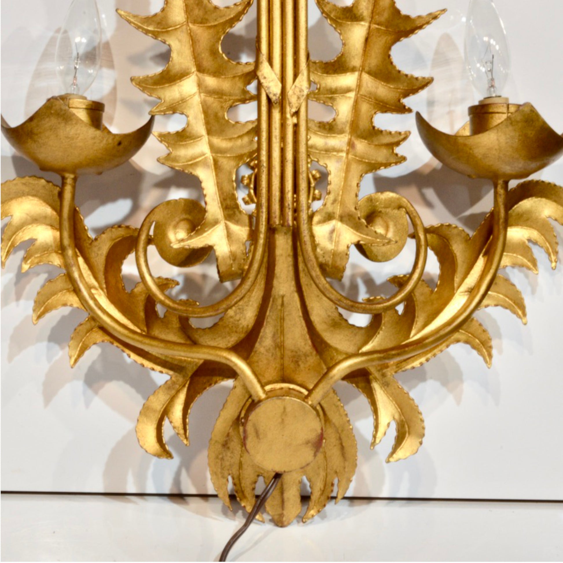 Electrical: North American plugs and bulb sockets. Both sconces are operational, but we recommend rewiring or hardwiring by a qualified lighting specialist.