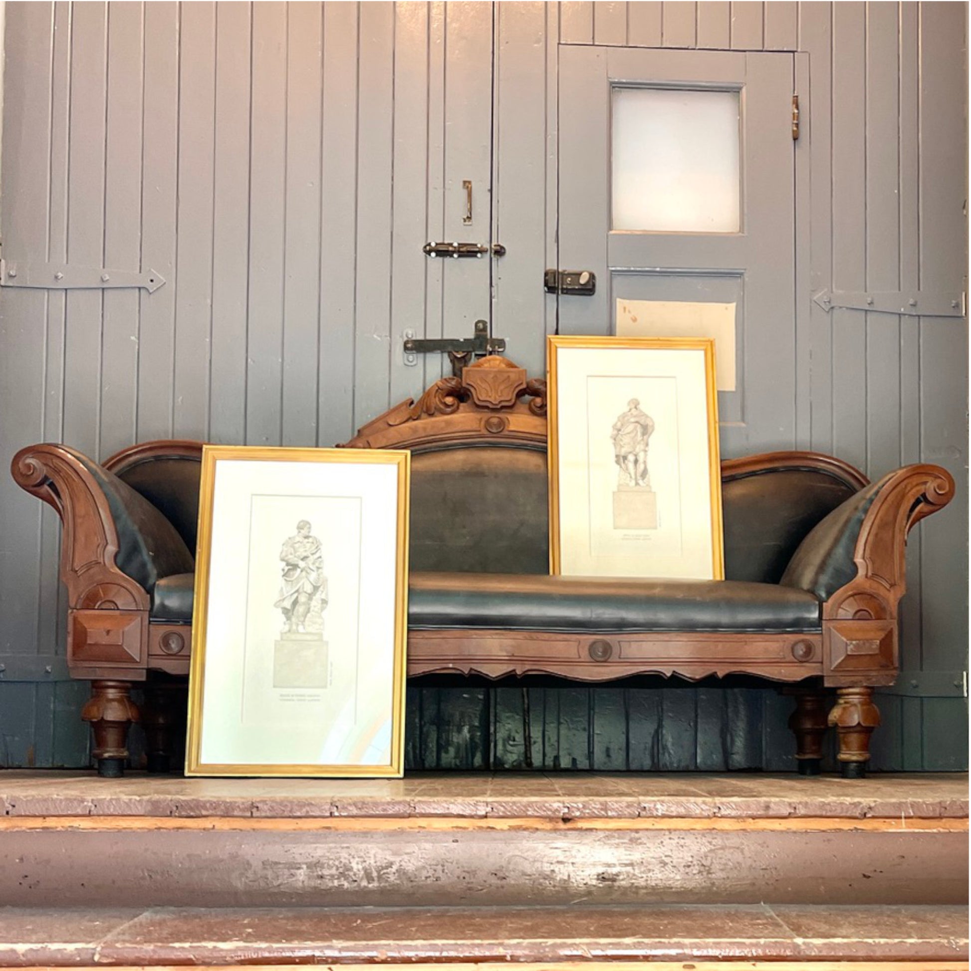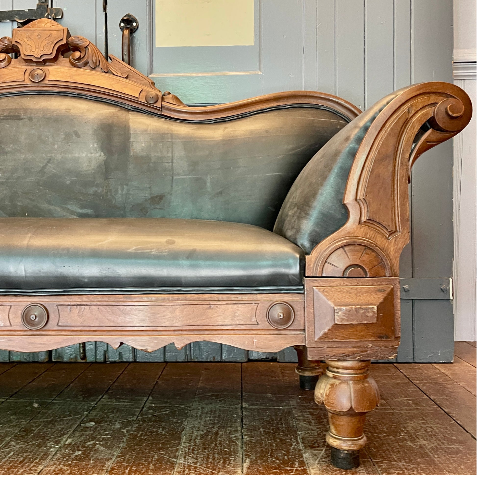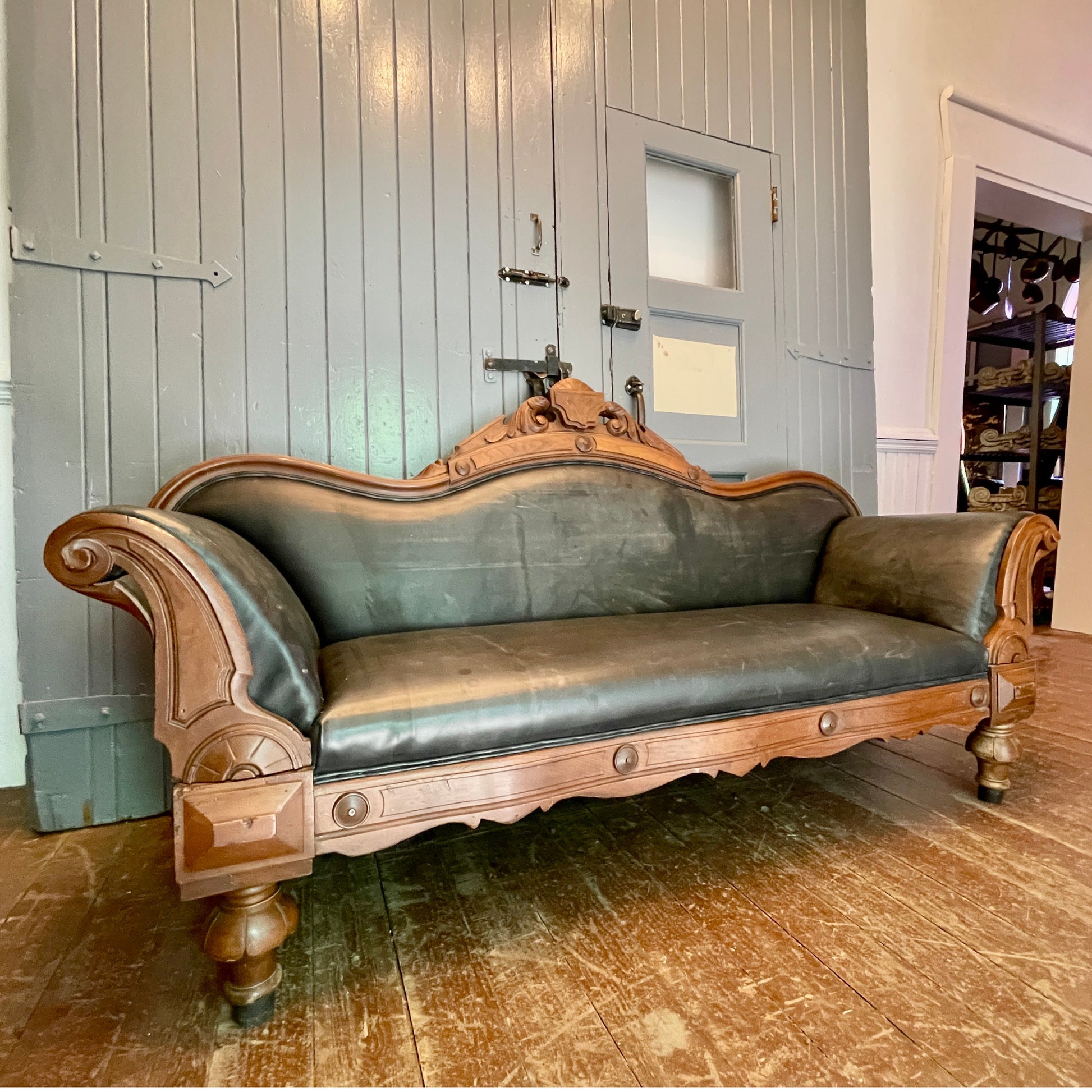 A striking 19th-century Victorian sofa reimagined for modern living. This solid wood frame piece, originally crafted in the 1860s, has been carefully rebuilt and structurally reinforced. Its traditional carved frame showcases classic Victorian detailing, while the upholstery has been freshly covered in reclaimed rubber—a bold and sustainable material choice that marries history with innovation.