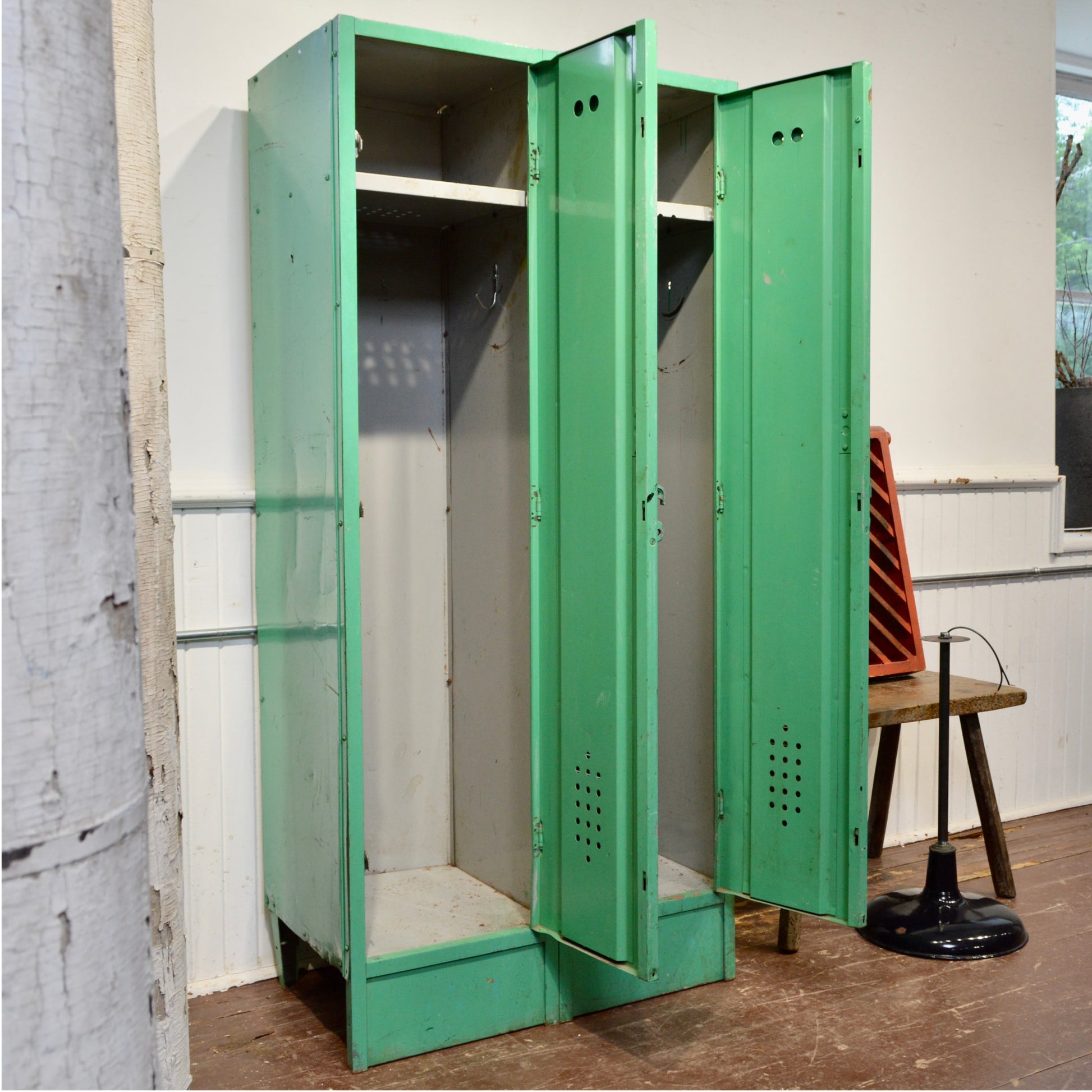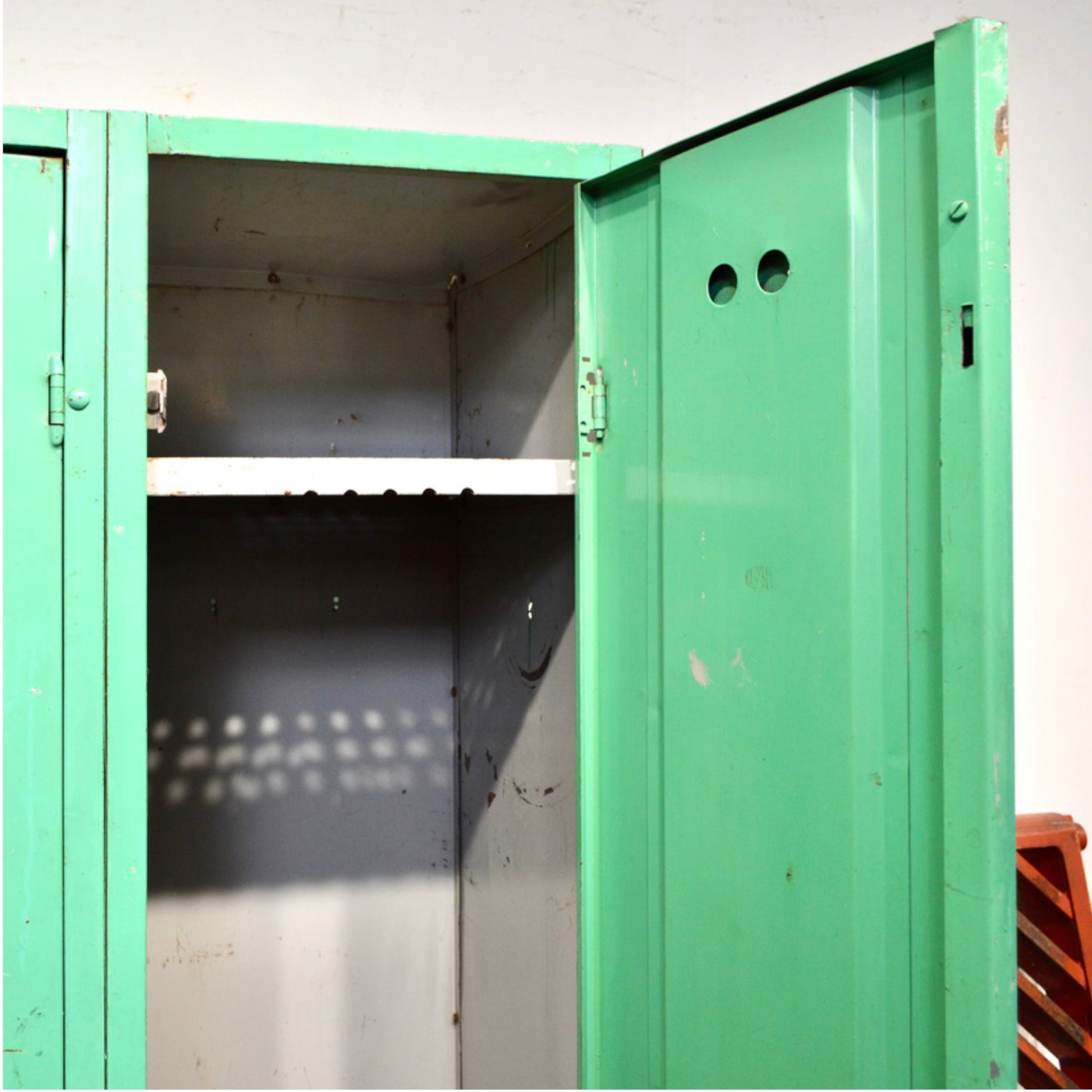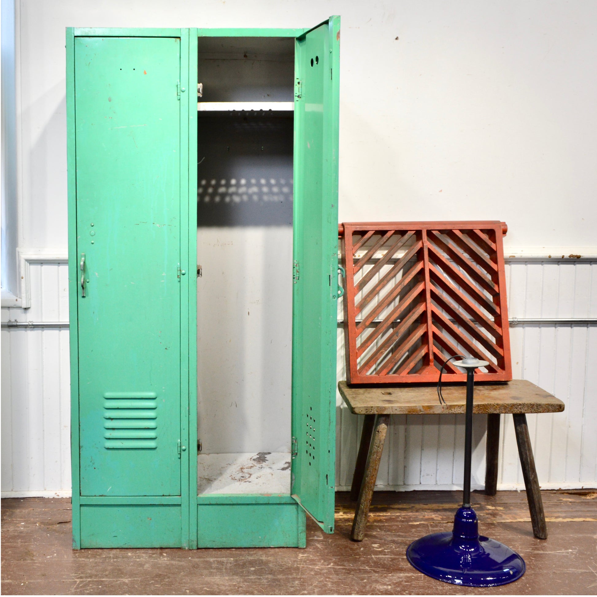 Add a pop of vintage industrial charm to your space with this striking 1950s school locker in original emerald green paint. Made of sturdy metal, this well-aged piece features two full-length doors, each with its own shelf and interior hook — perfect for practical storage with nostalgic flair.