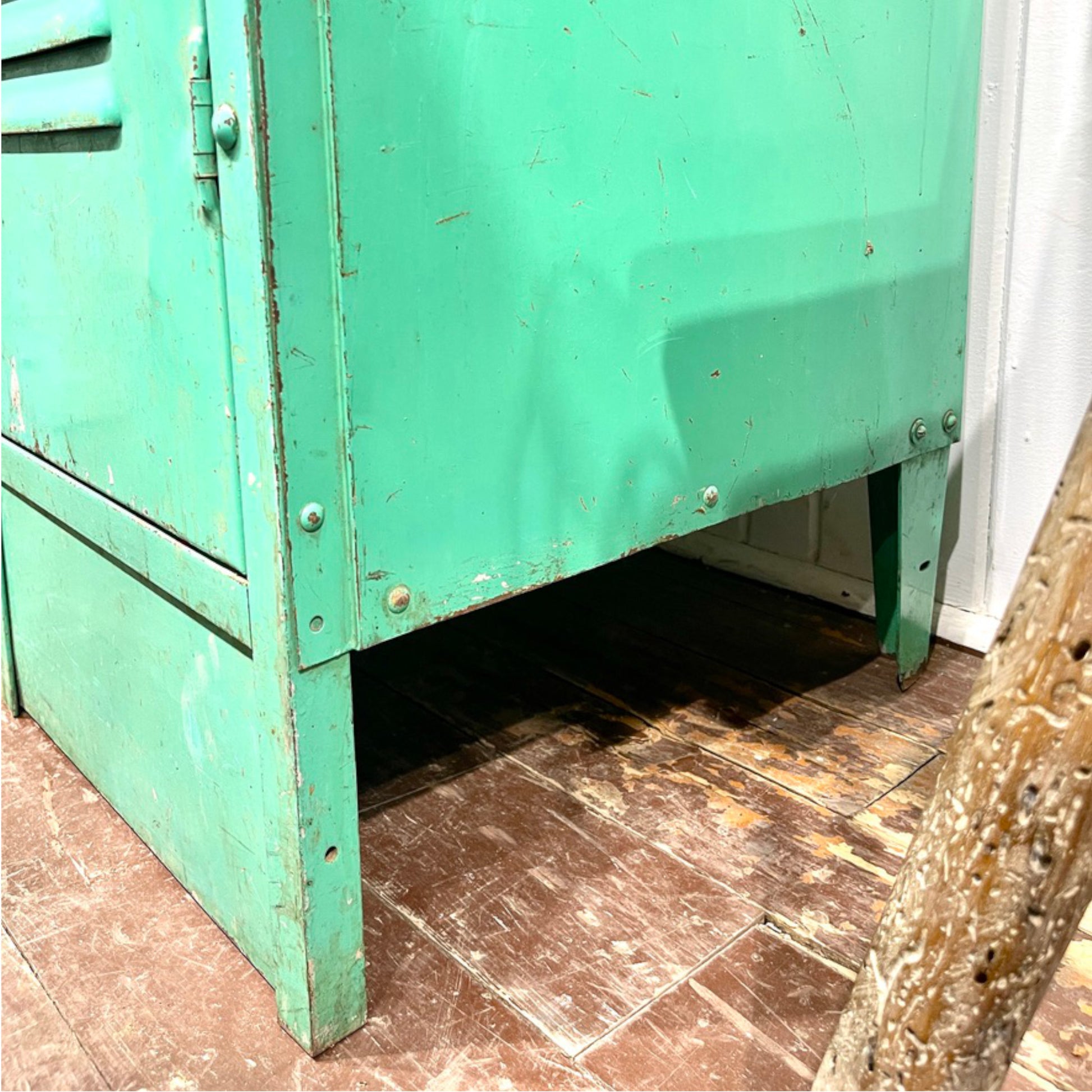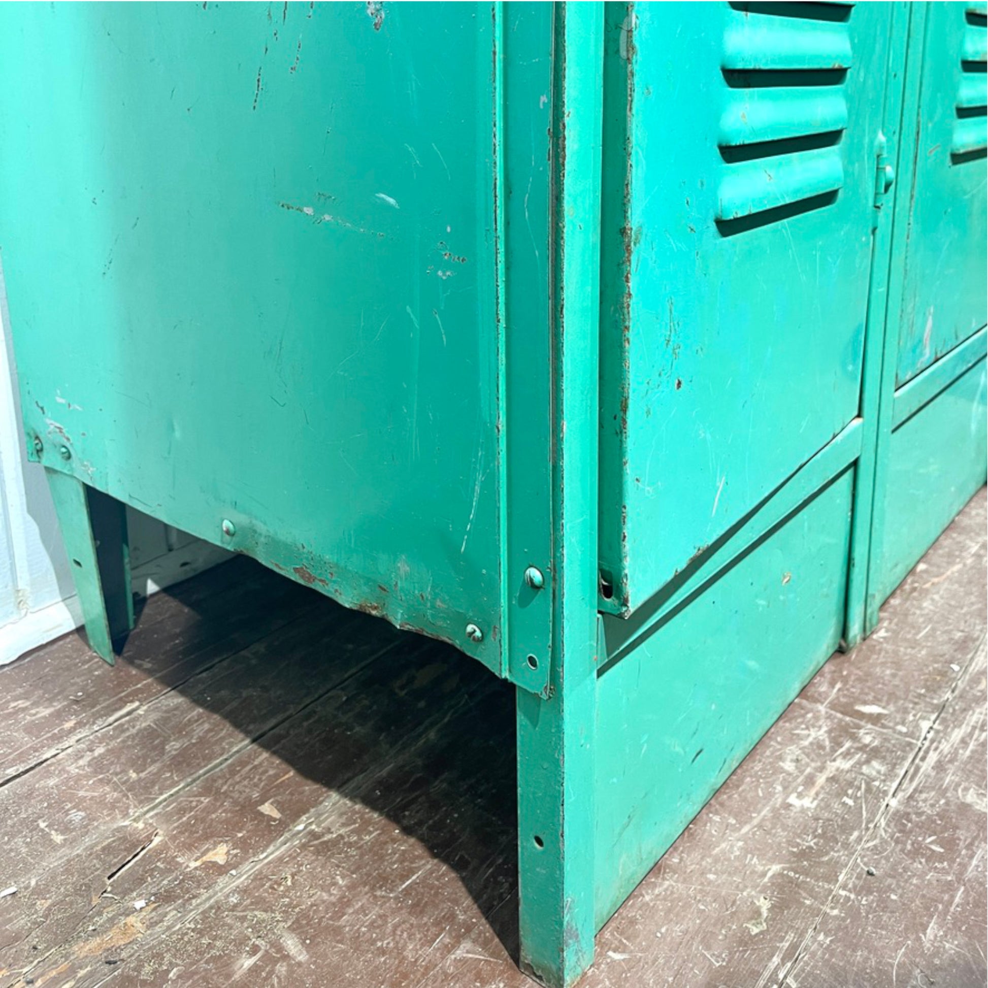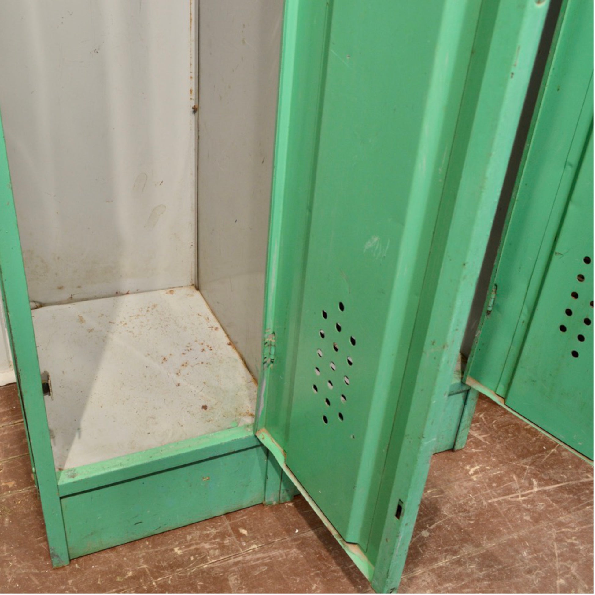 Add a pop of vintage industrial charm to your space with this striking 1950s school locker in original emerald green paint. Made of sturdy metal, this well-aged piece features two full-length doors, each with its own shelf and interior hook — perfect for practical storage with nostalgic flair.