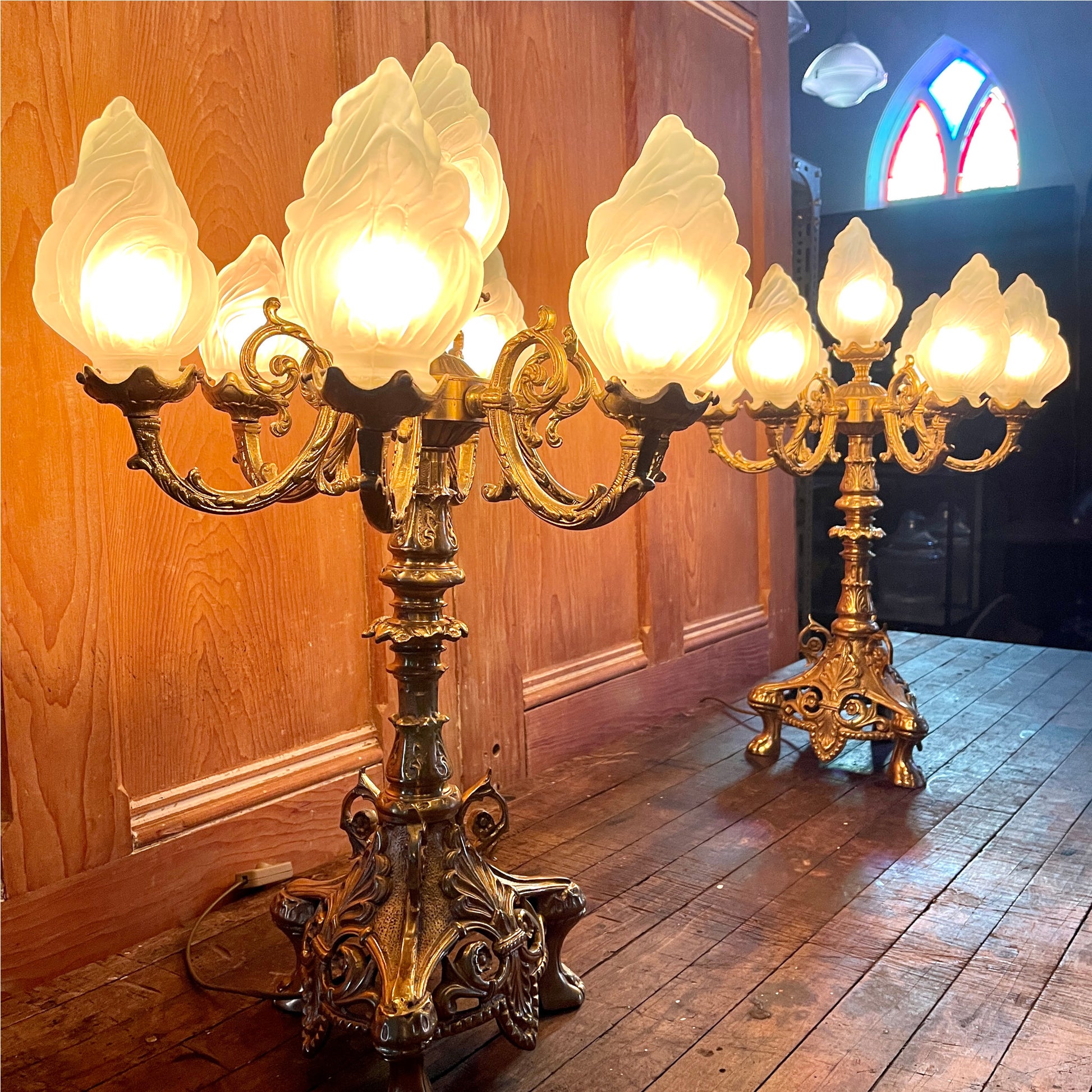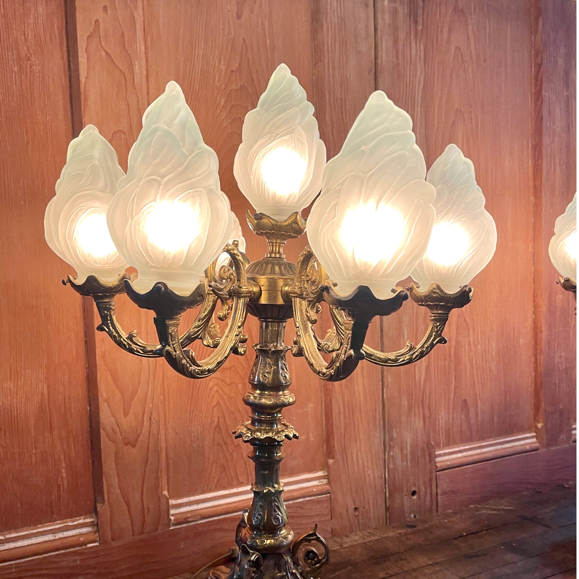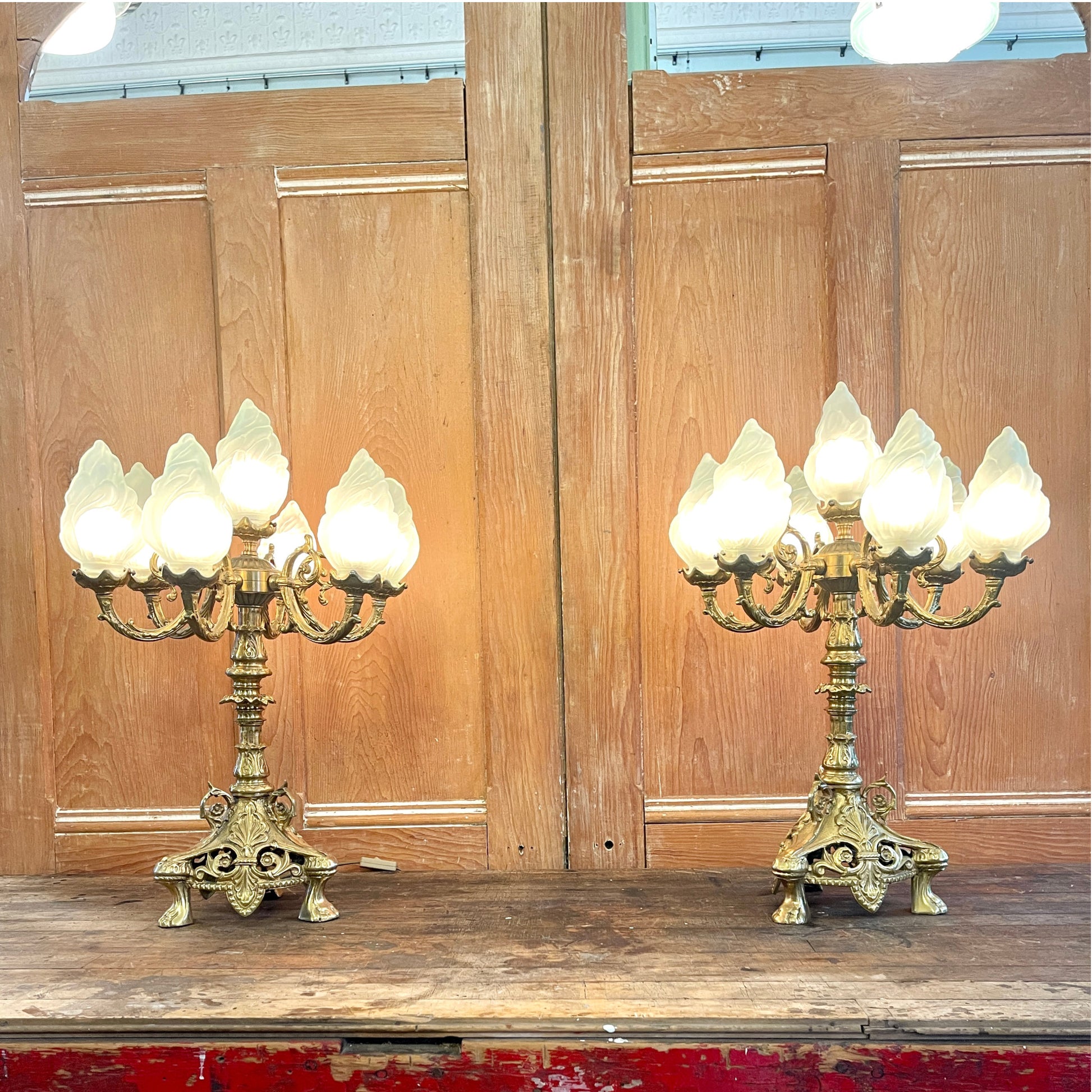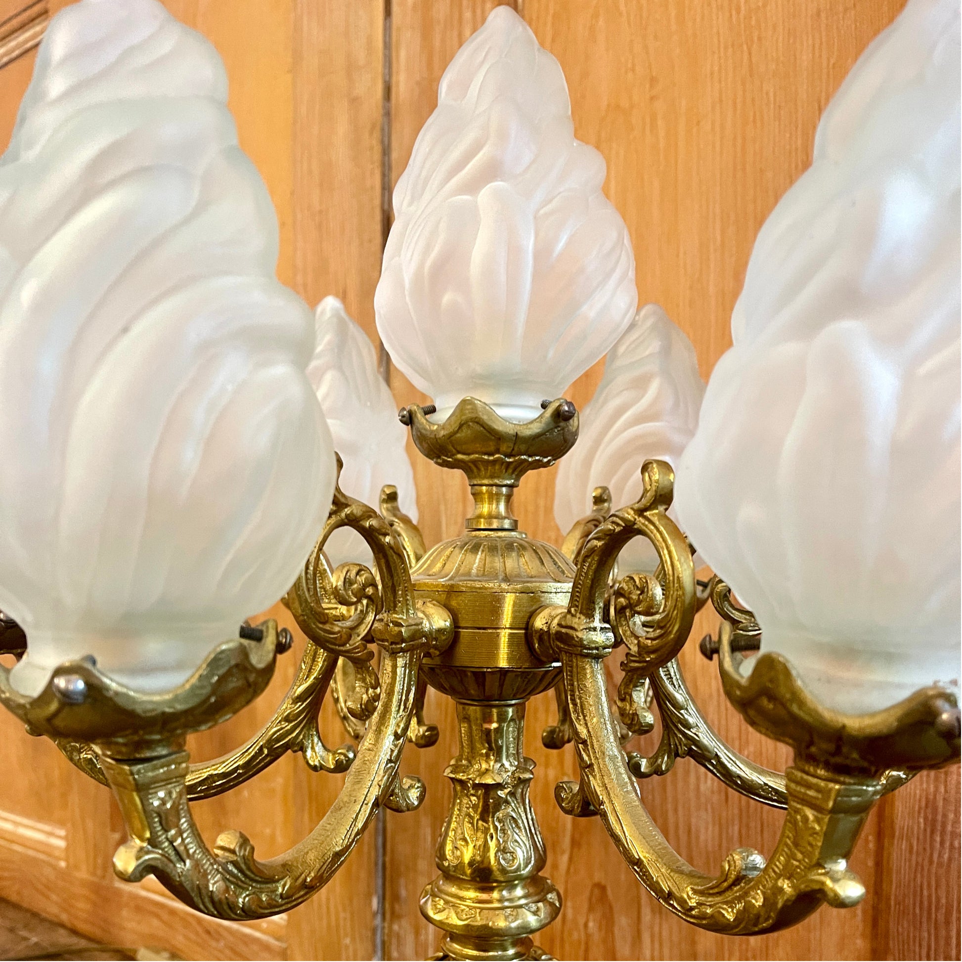 Lamp sockets are fitted with adaptors to accommodate 15 watt bulbs, but could be rewired to fit LED chandelier style bulbs. Flame shaped shades in frosted glass. One shade has been replaced with a smaller, yet matching alternative. A subtle variation that does not detract from the unique beauty and character of the lamps.