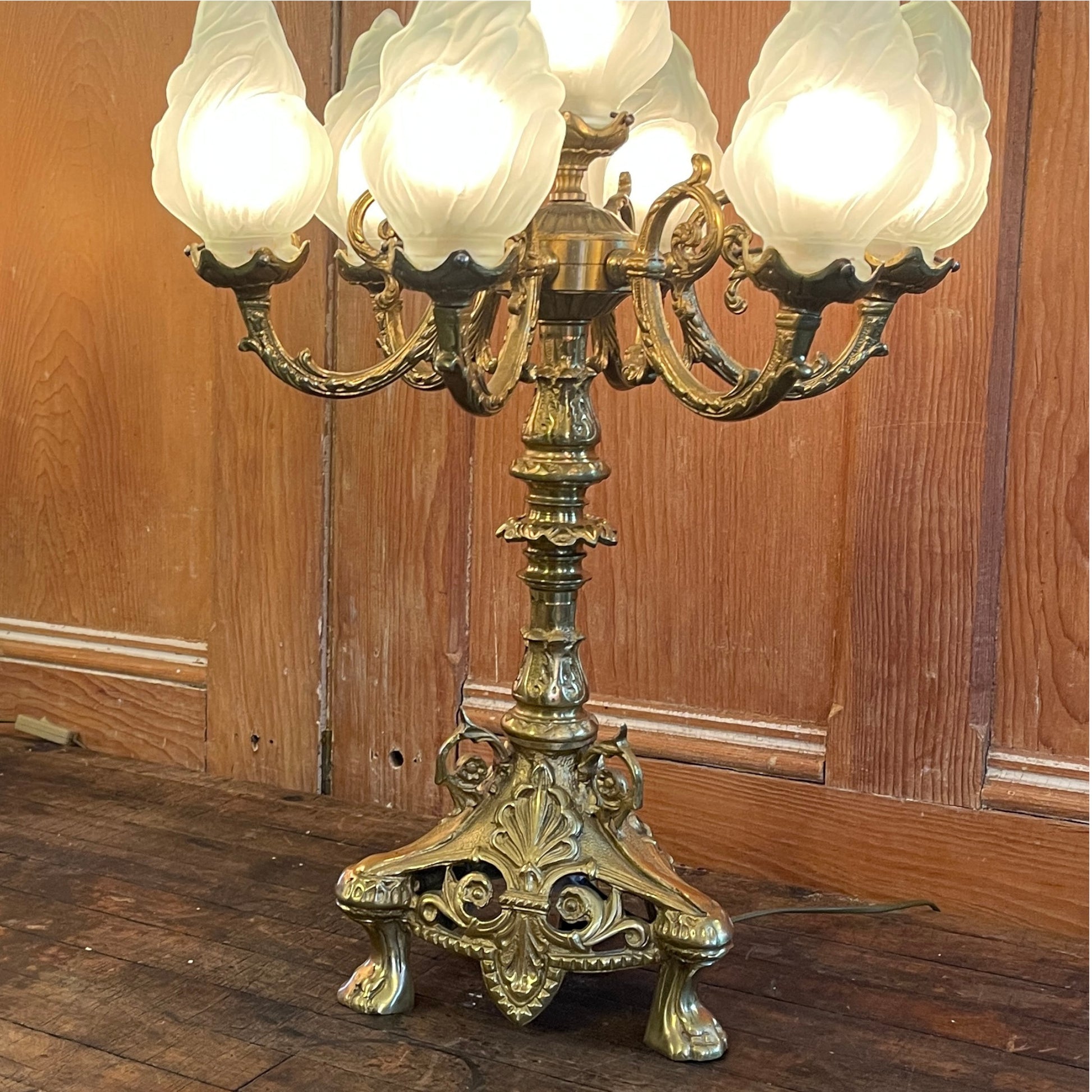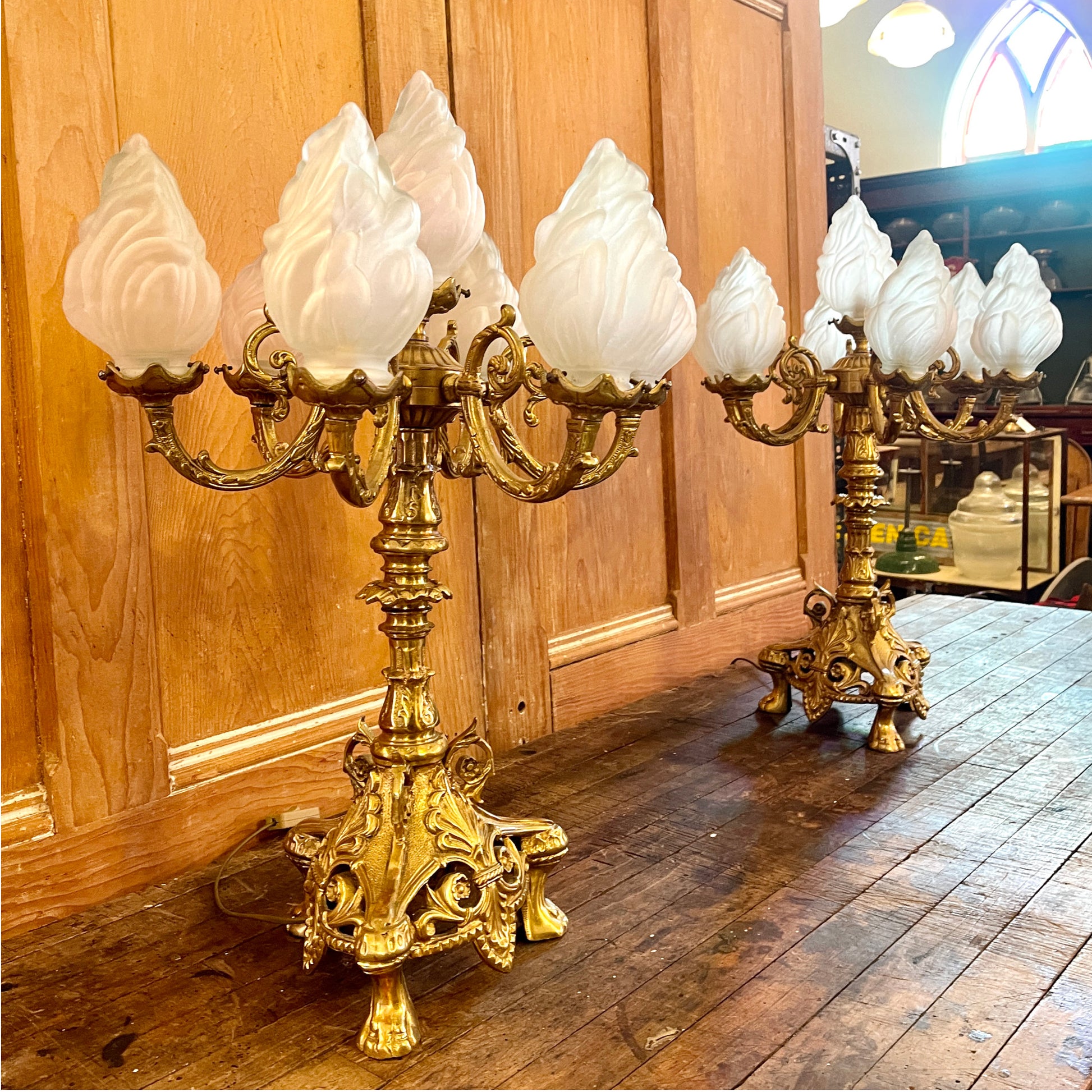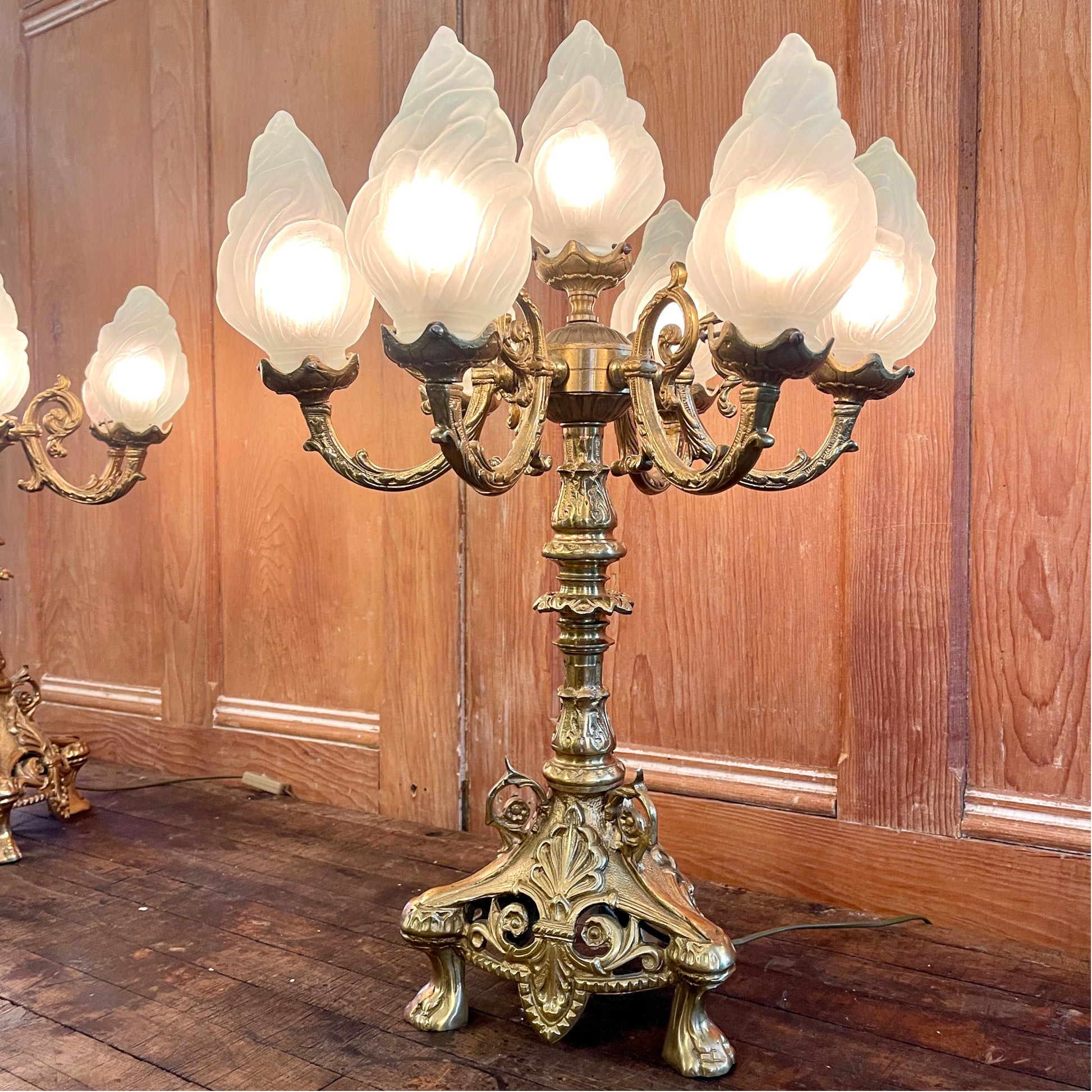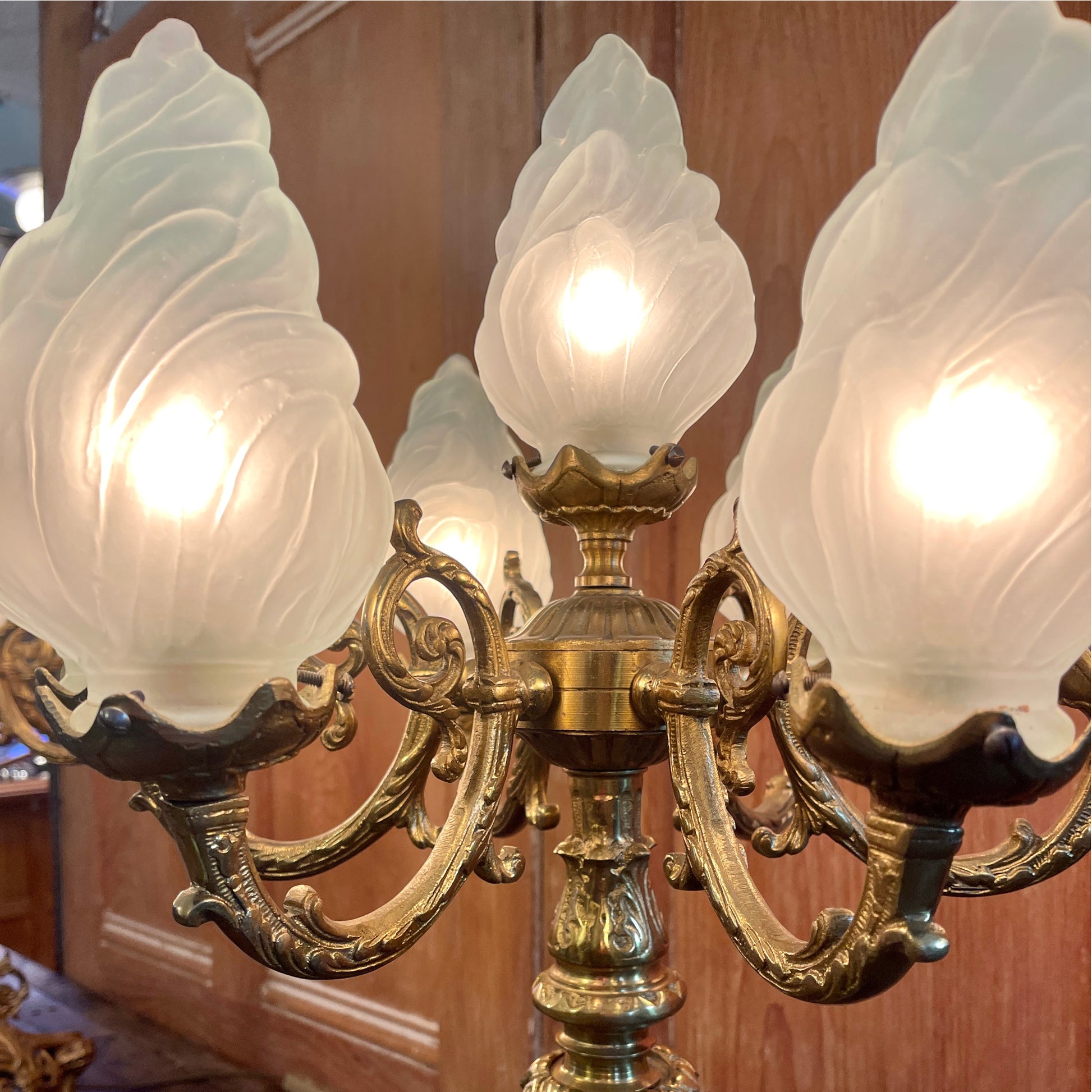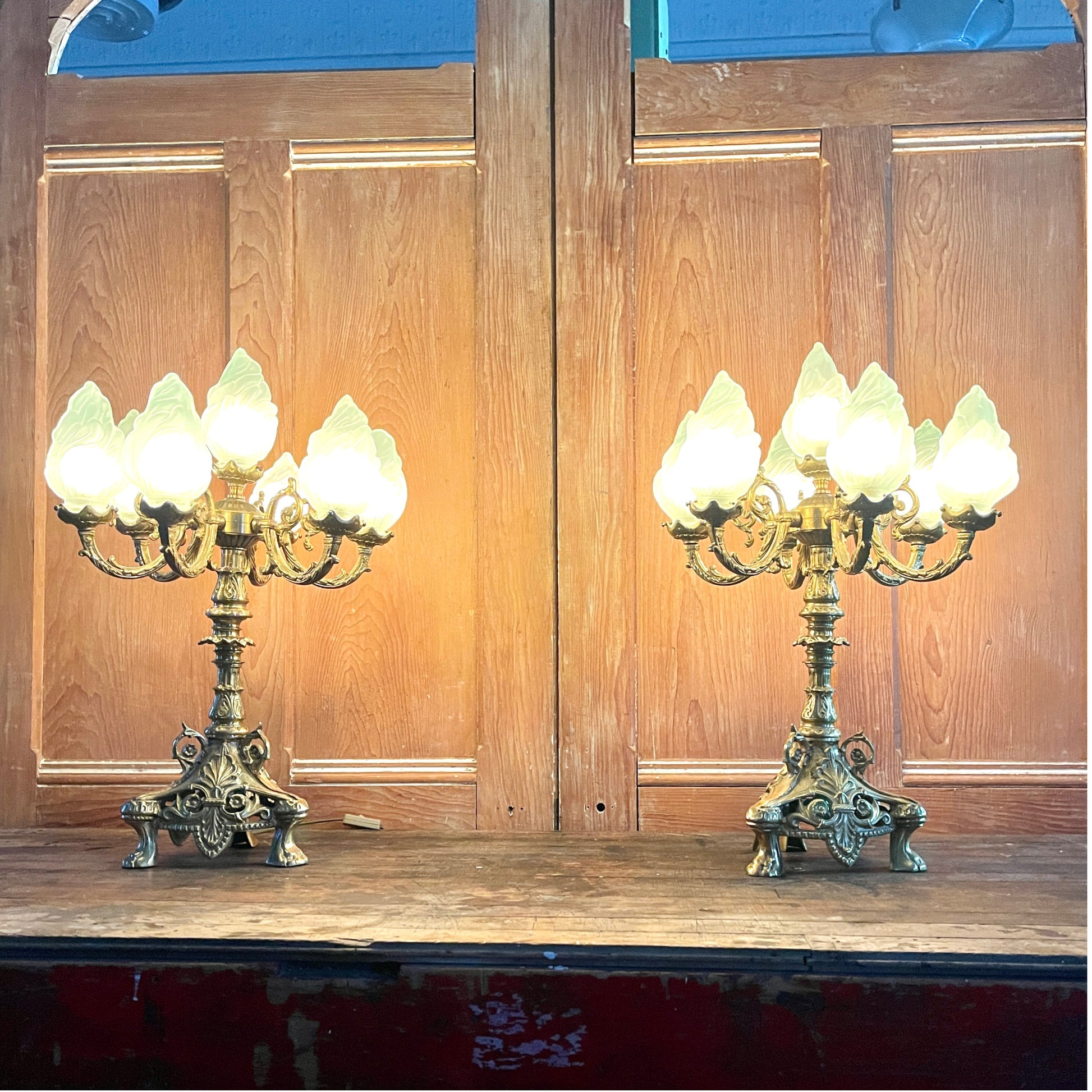 Lamp sockets are fitted with adaptors to accommodate 15 watt bulbs, but could be rewired to fit LED chandelier style bulbs. Flame shaped shades in frosted glass. One shade has been replaced with a smaller, yet matching alternative. A subtle variation that does not detract from the unique beauty and character of the lamps.