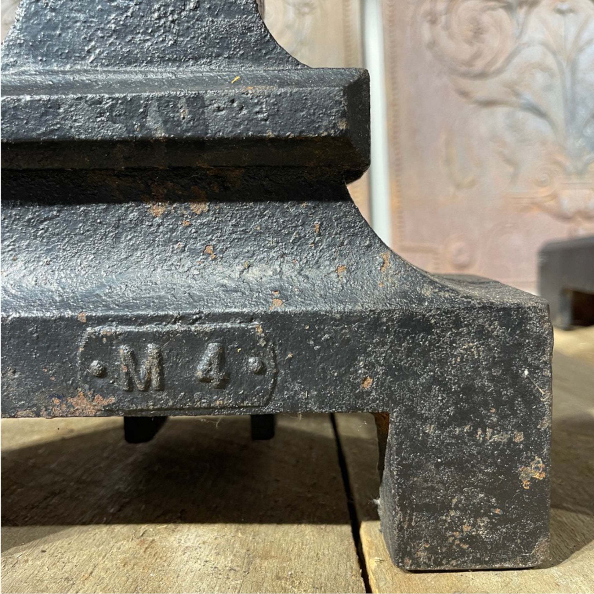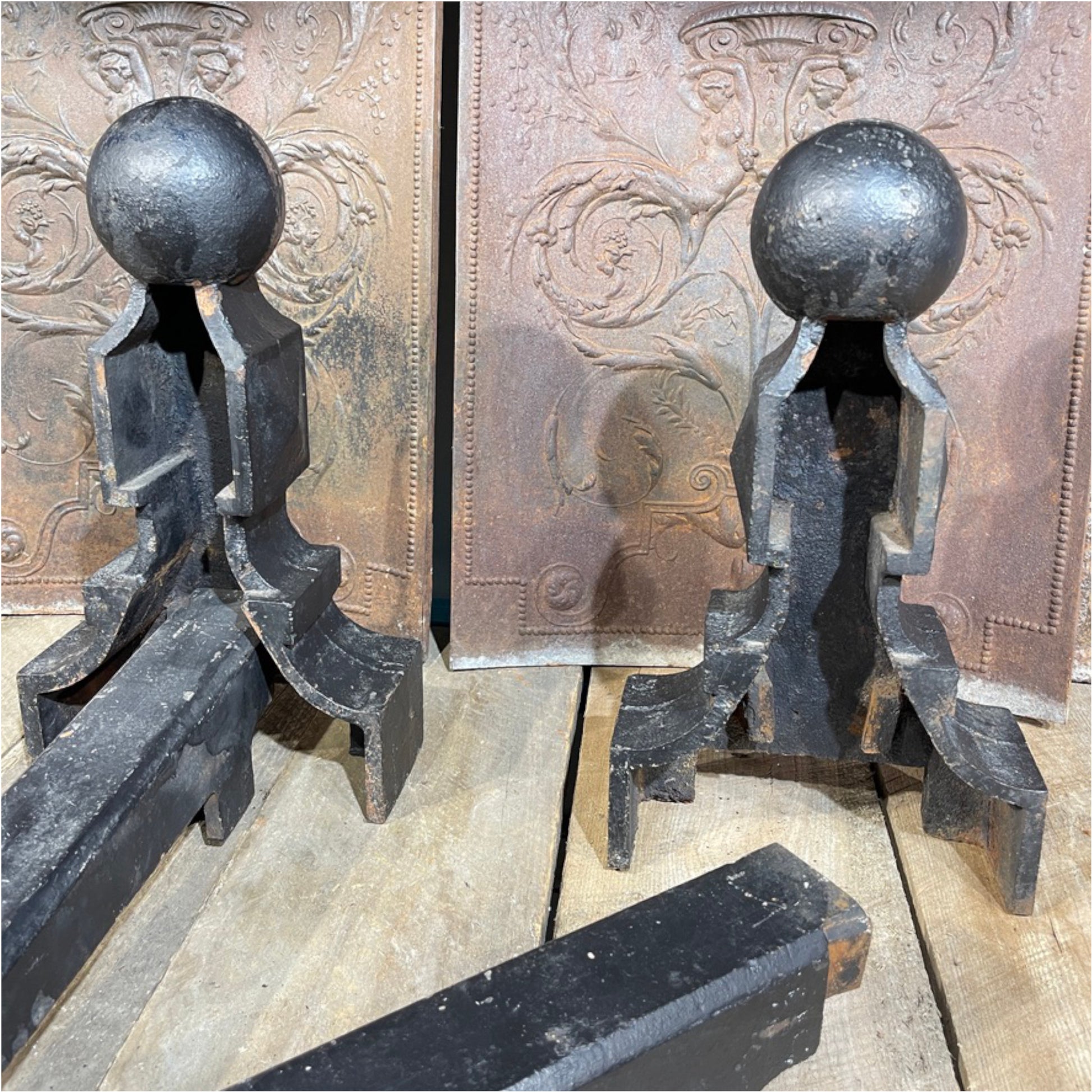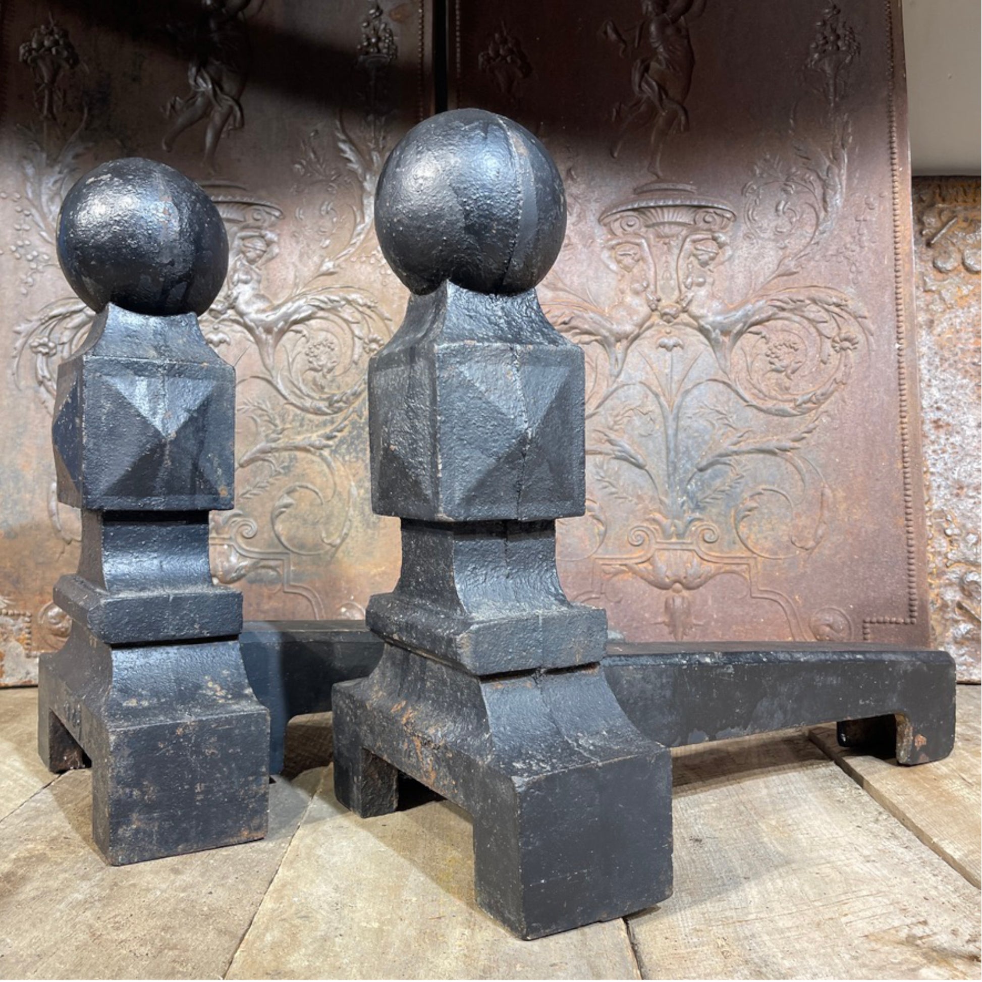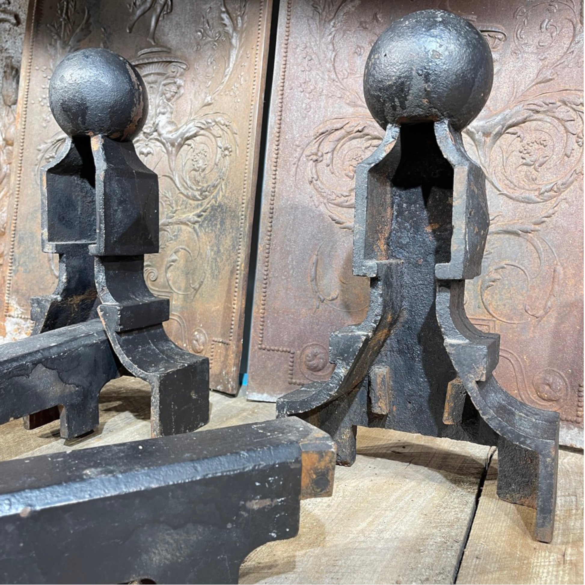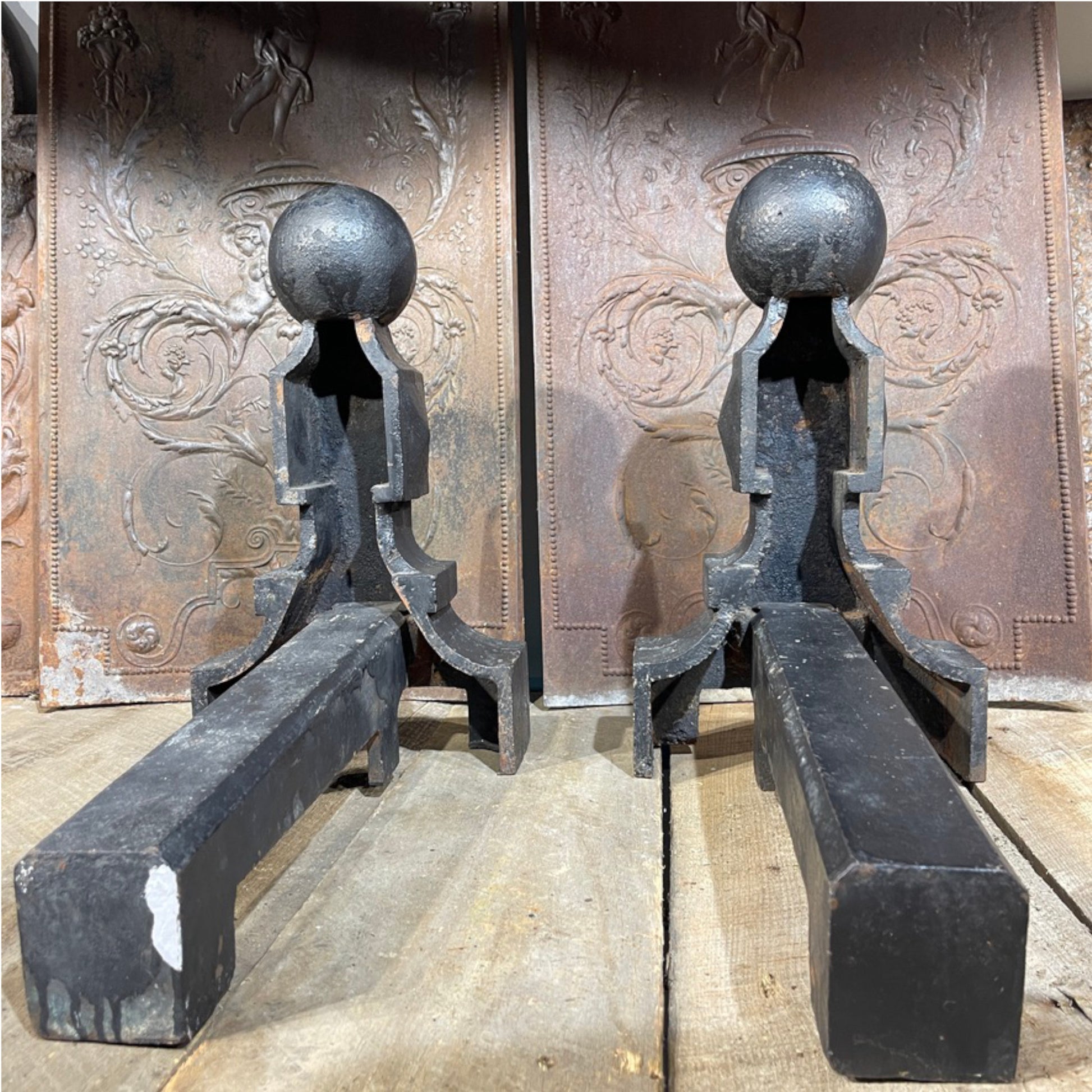 Oversized and ruggedly attractive, vintage cast iron andirons with cannonball finials. Rare and unusual, a sturdy option for a larger indoor or outdoor fireplace, they have a combined weight of 76 pounds.