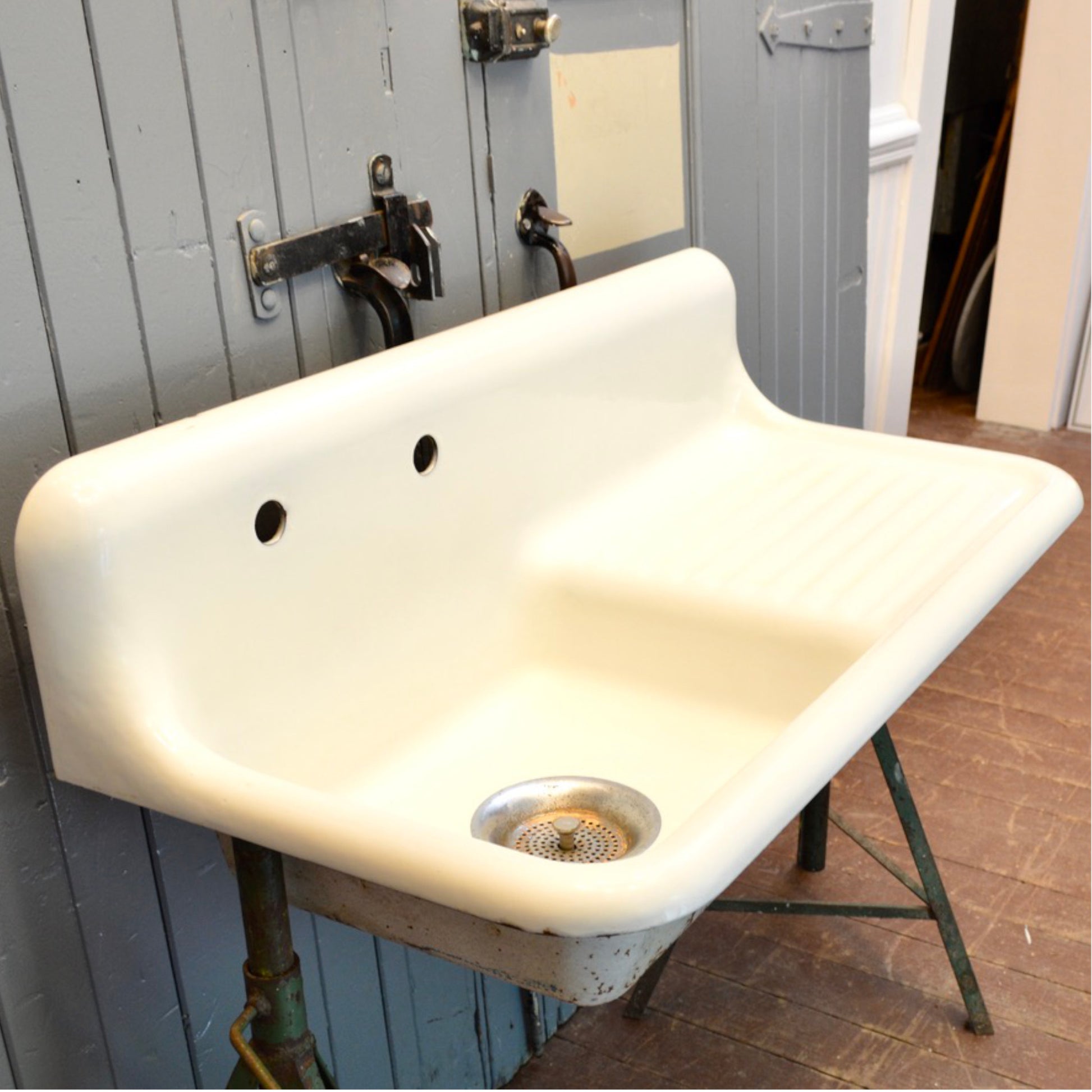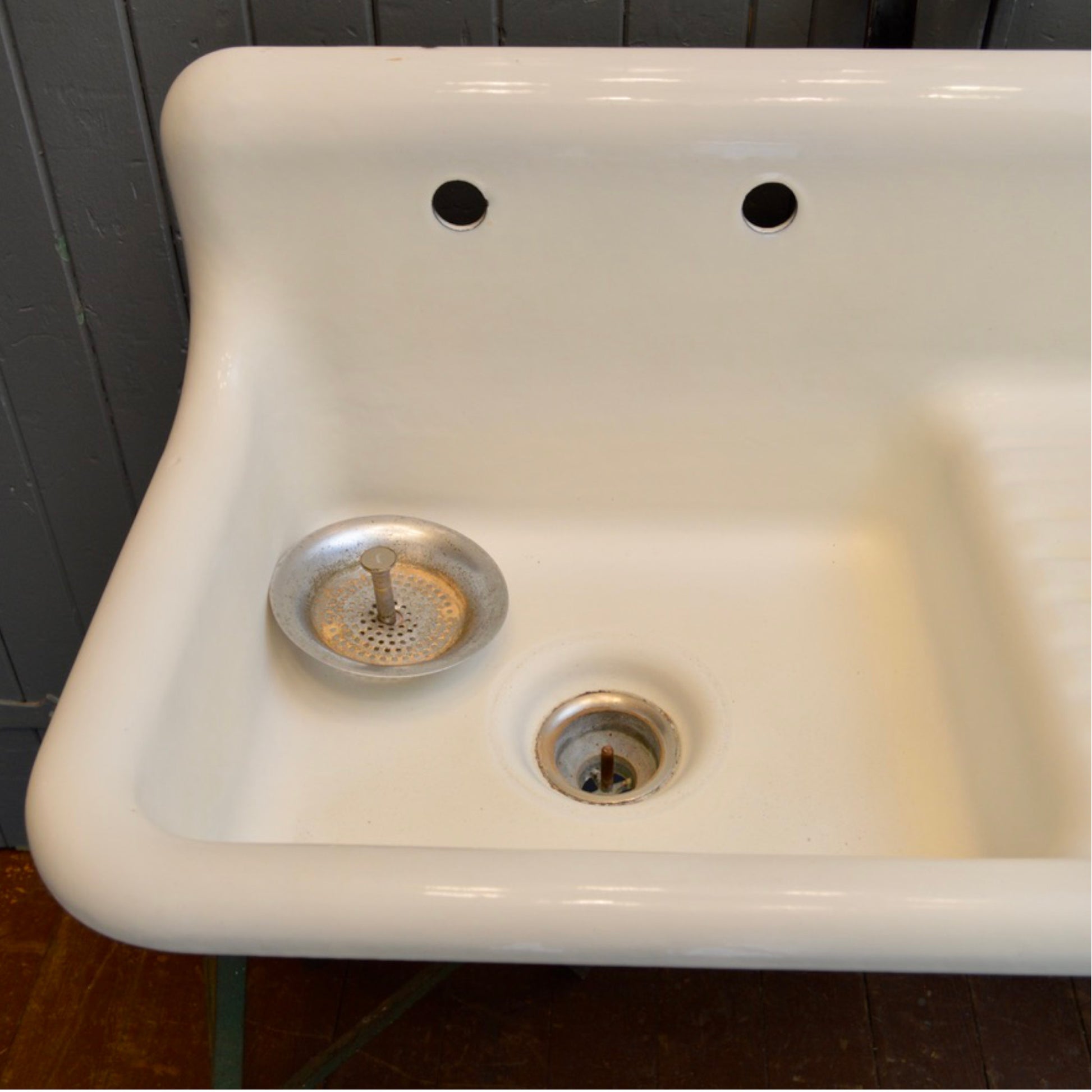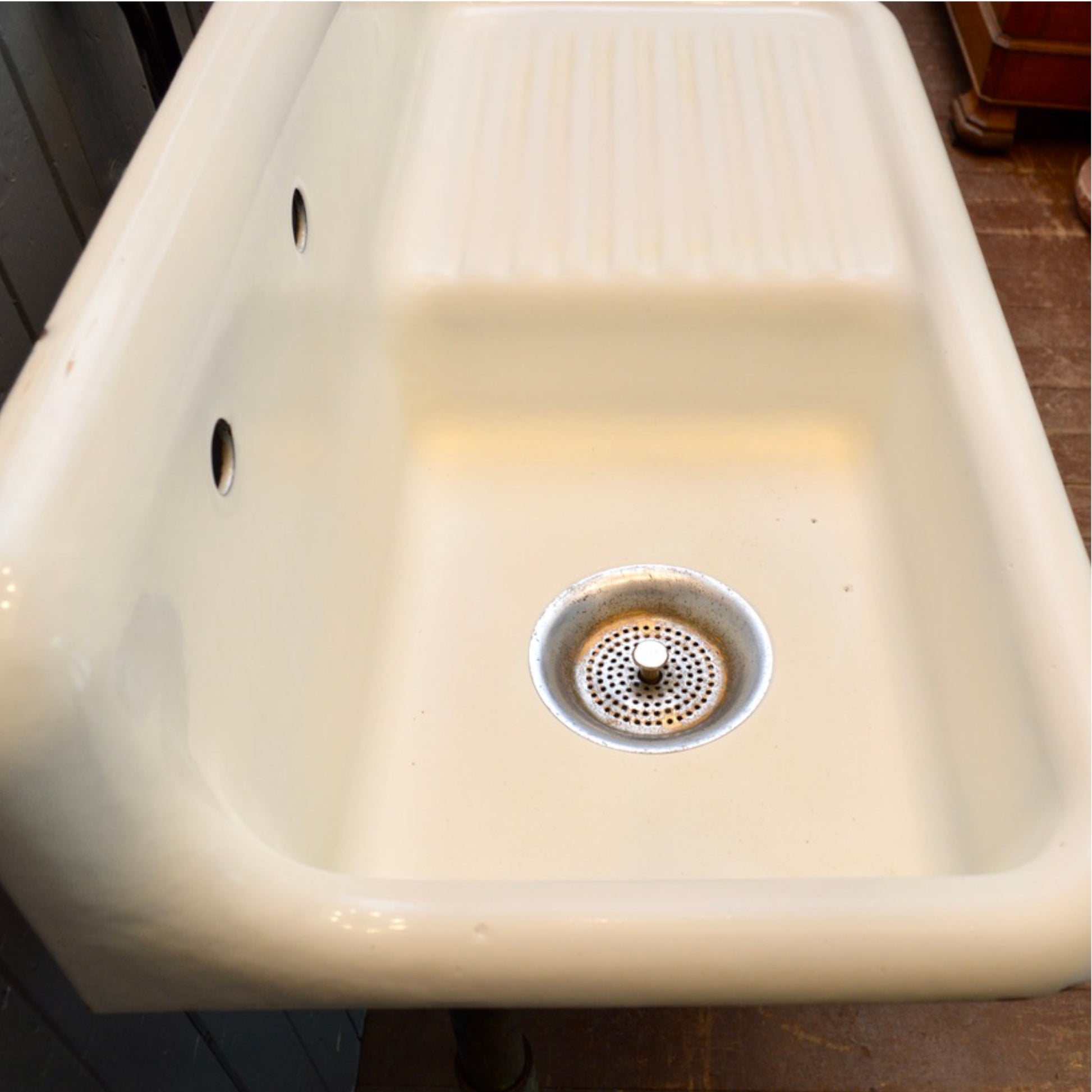 The original porcelain enamel finish remains in very nice condition, showcasing the subtle surface wear and minor chipping that tell the story of decades of use — a true testament to its durability and authenticity. The integrated right-hand draining board adds both practicality and character, making it as functional as it is beautiful. Sink comes with it's original drain and drain cover.