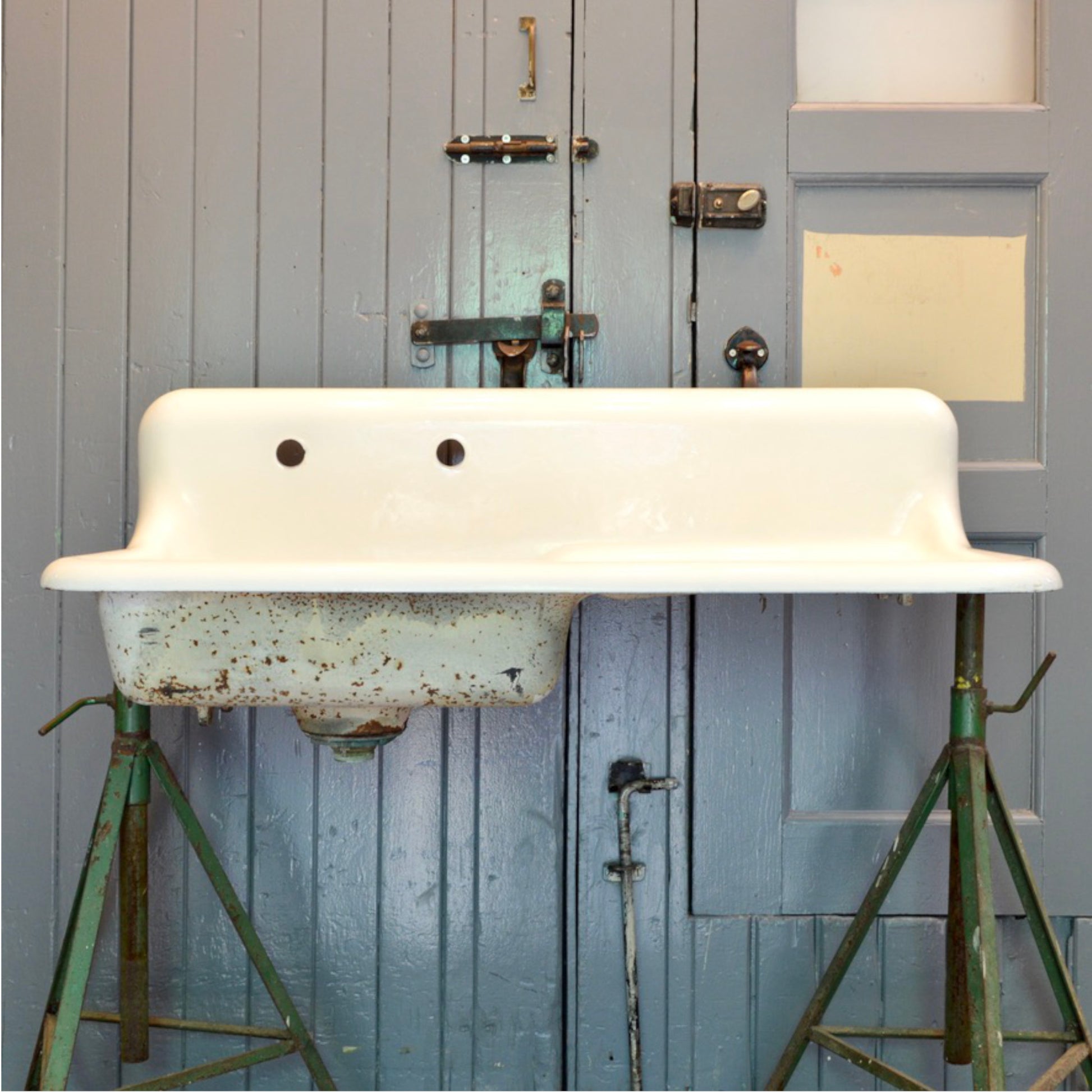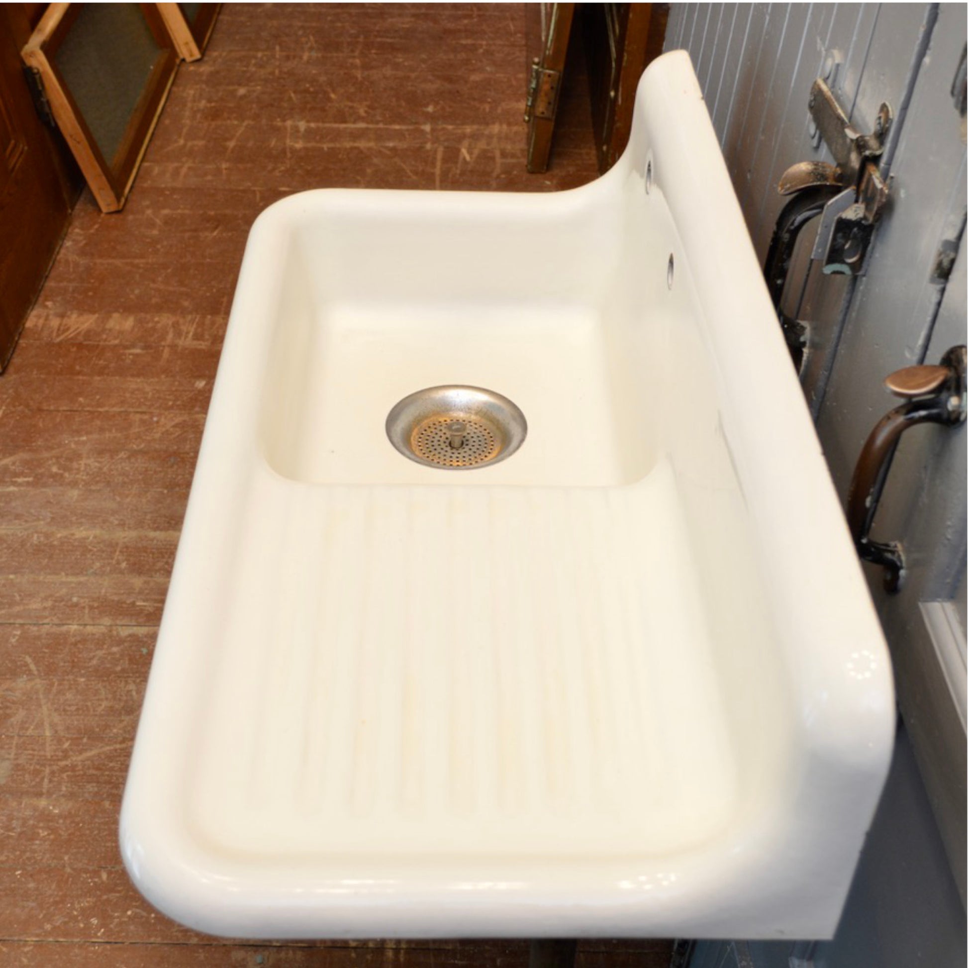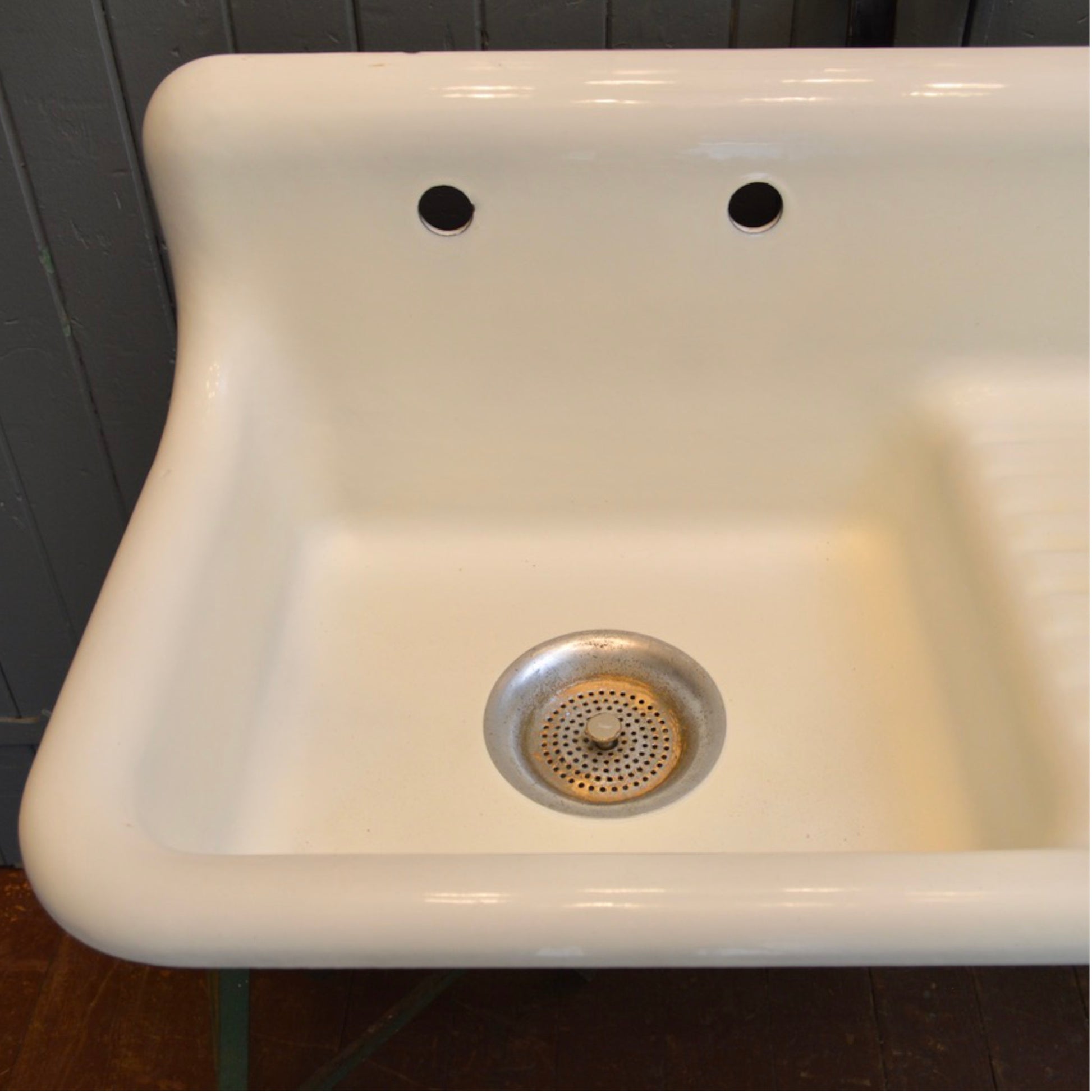 The original porcelain enamel finish remains in very nice condition, showcasing the subtle surface wear and minor chipping that tell the story of decades of use — a true testament to its durability and authenticity. The integrated right-hand draining board adds both practicality and character, making it as functional as it is beautiful. Sink comes with it's original drain and drain cover.