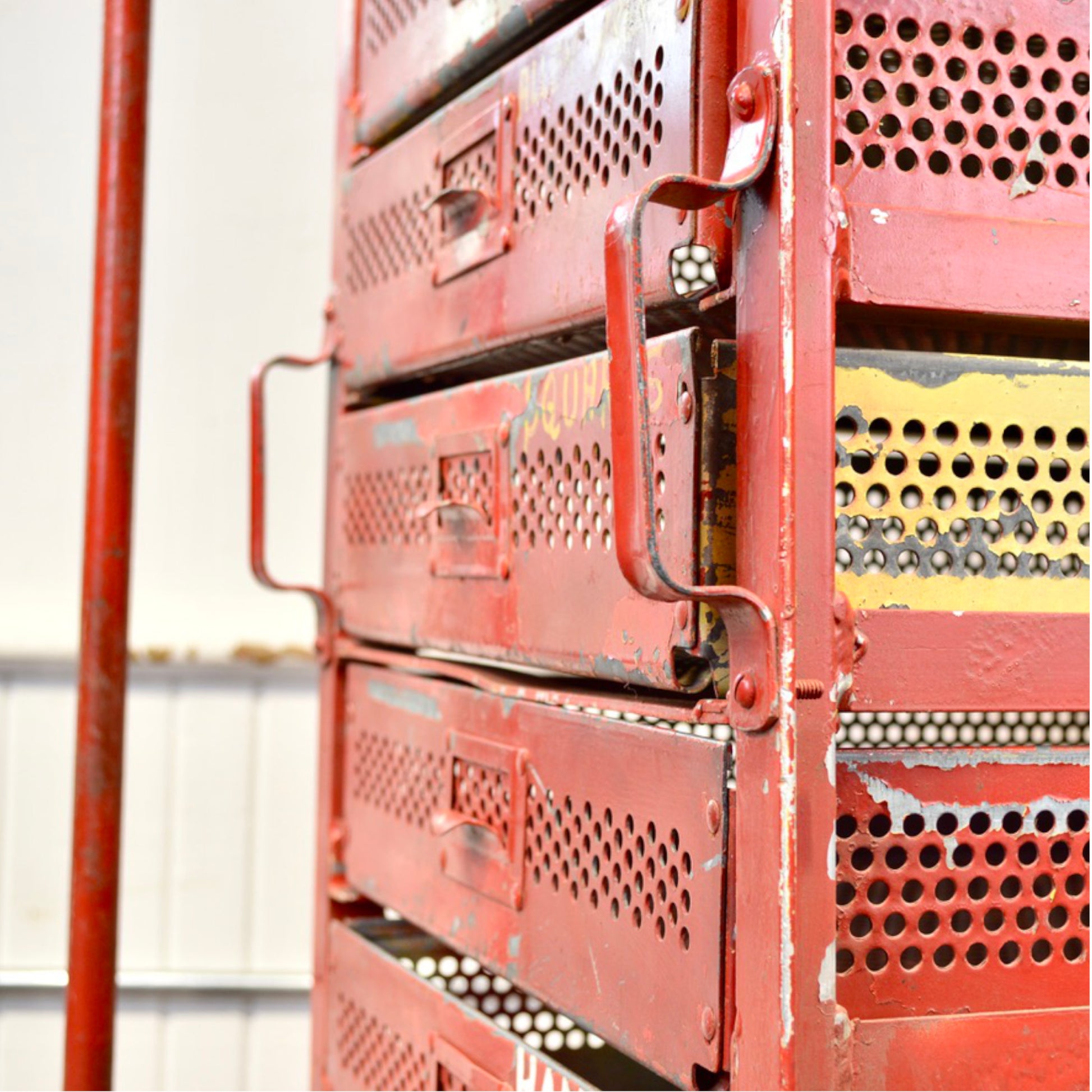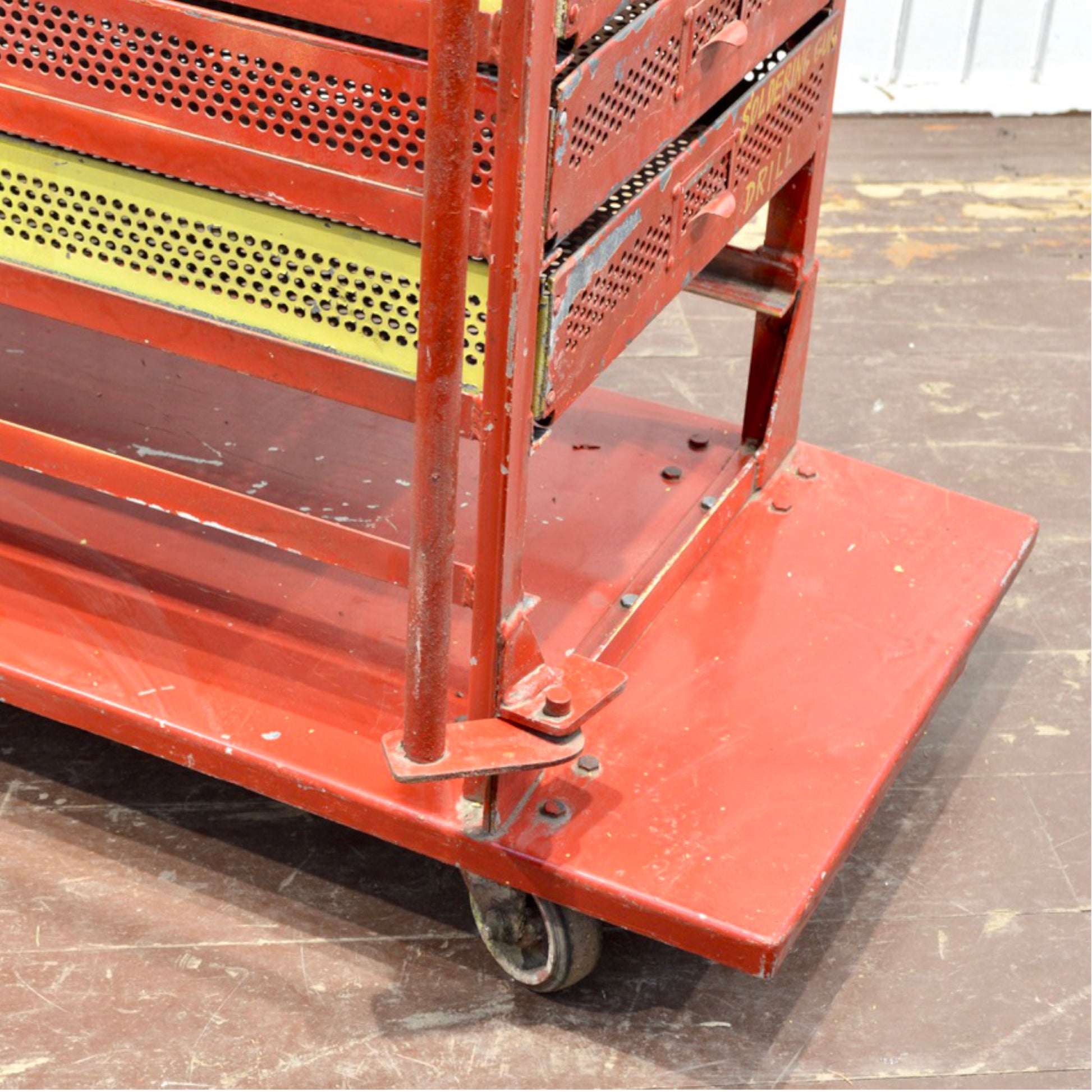 Bring timeless industrial character to your workspace with this one-of-a-kind vintage steel tool cart from the 1950s. Featuring a rugged red frame with contrasting yellow accents, this heavy-duty rolling shop cabinet is both functional and visually striking.