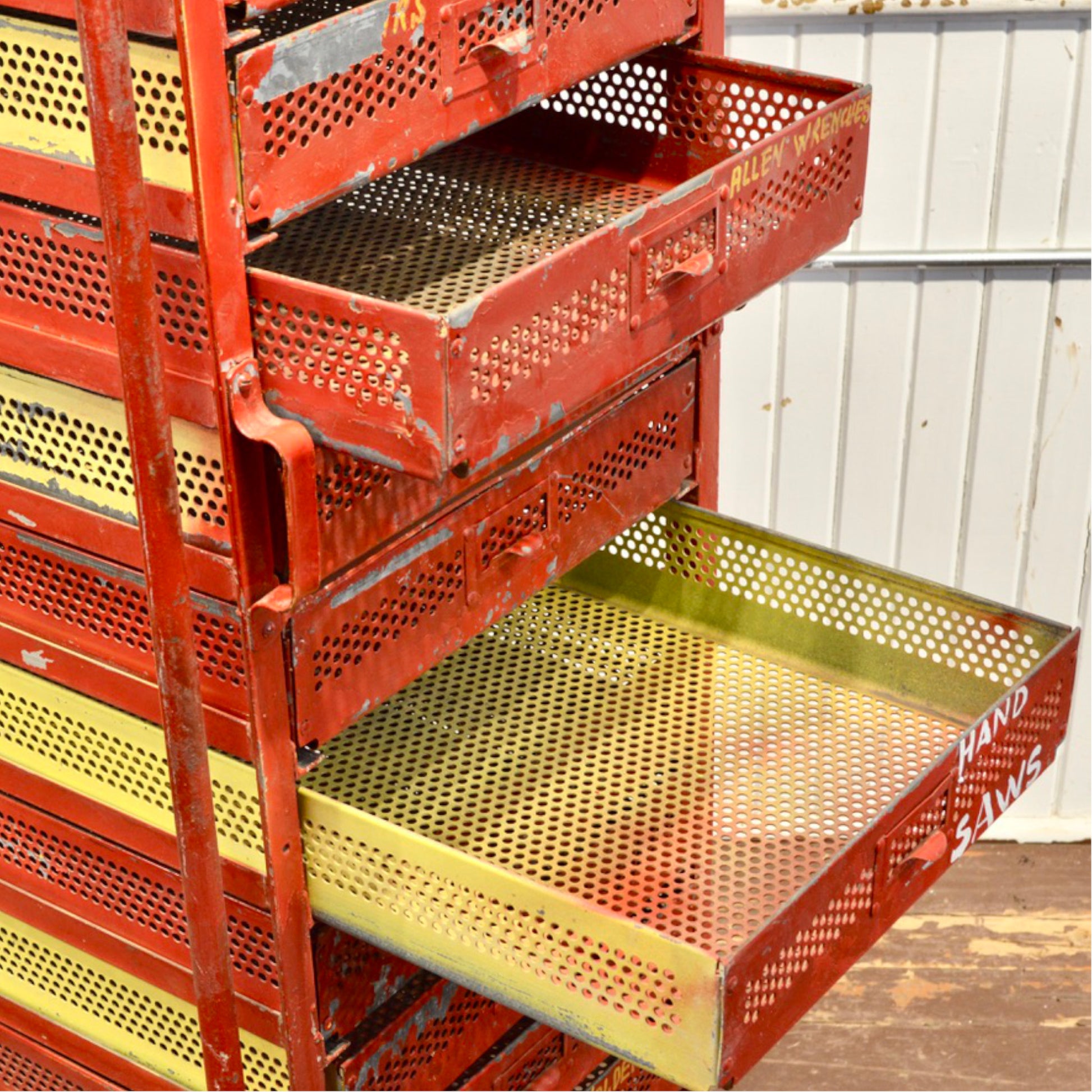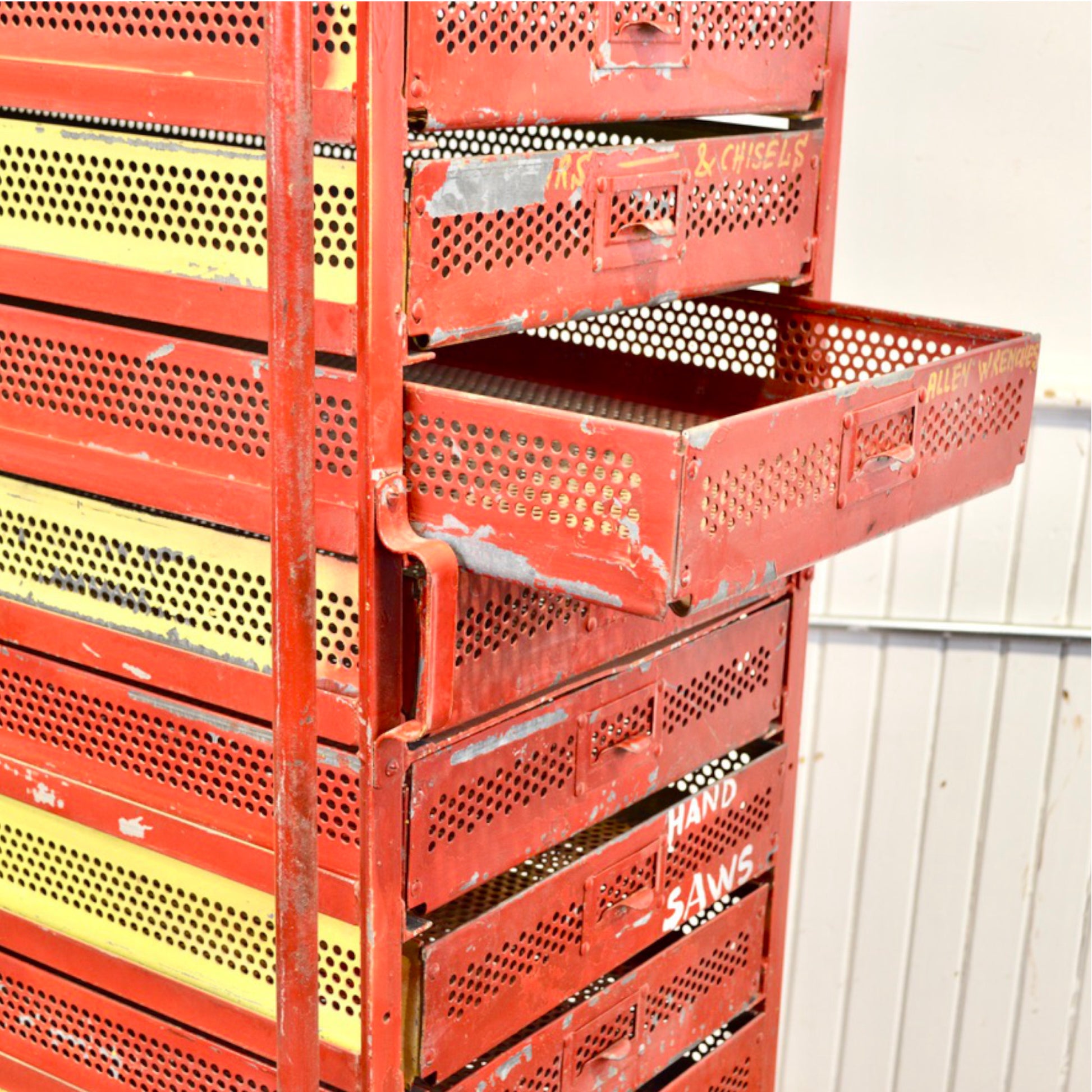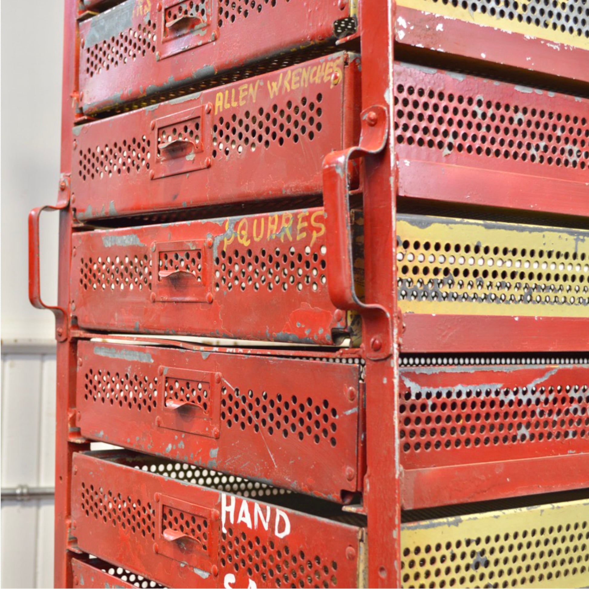 14 galvanized sliding drawers with riveted corners and label tabs